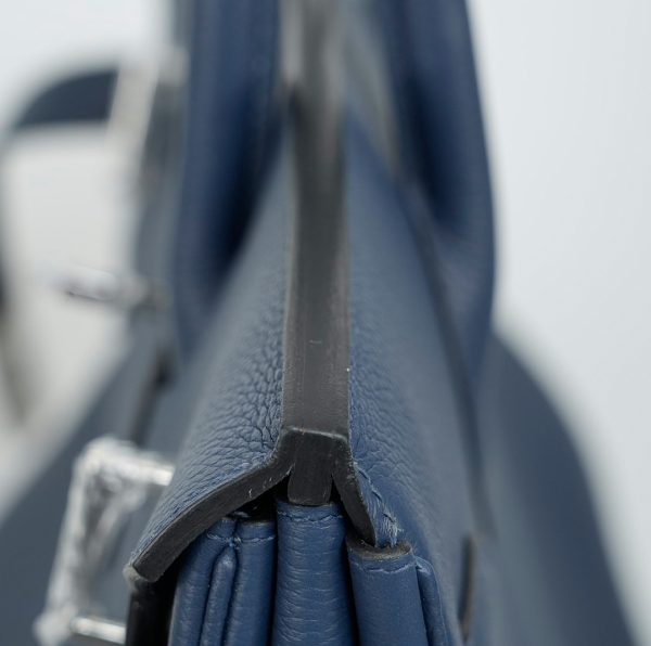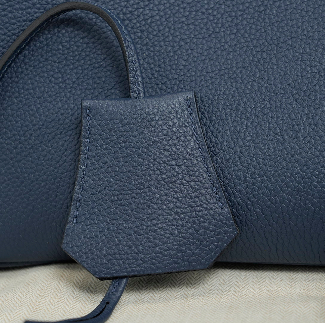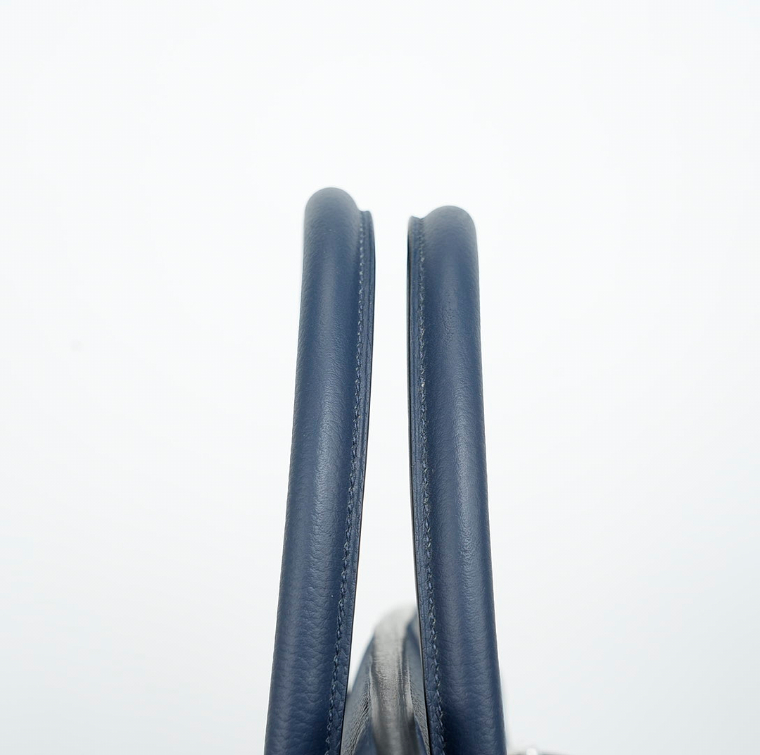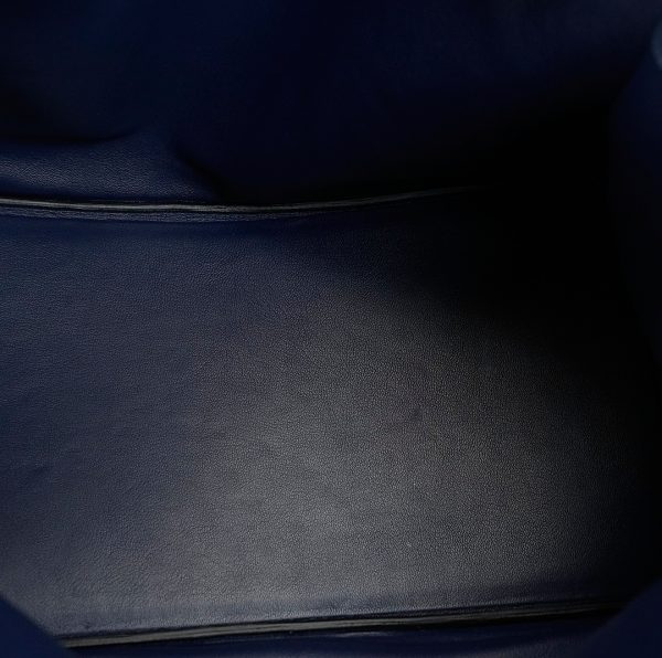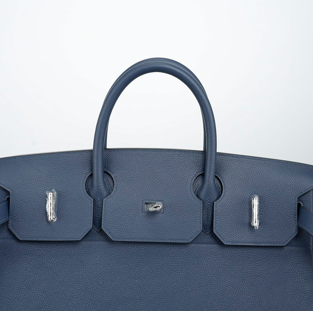 This is a Togo HAC BK 40 in Bleu Nuit. This spacious travel tote is crafted of fine togo leather in navy blue with expansive sides and a durable reinforced base. The bag features rolled leather top handles and a cross over flap with straps and a palladium plated turn lock closure. This opens to a matte chèvre goatskin leather interior.
