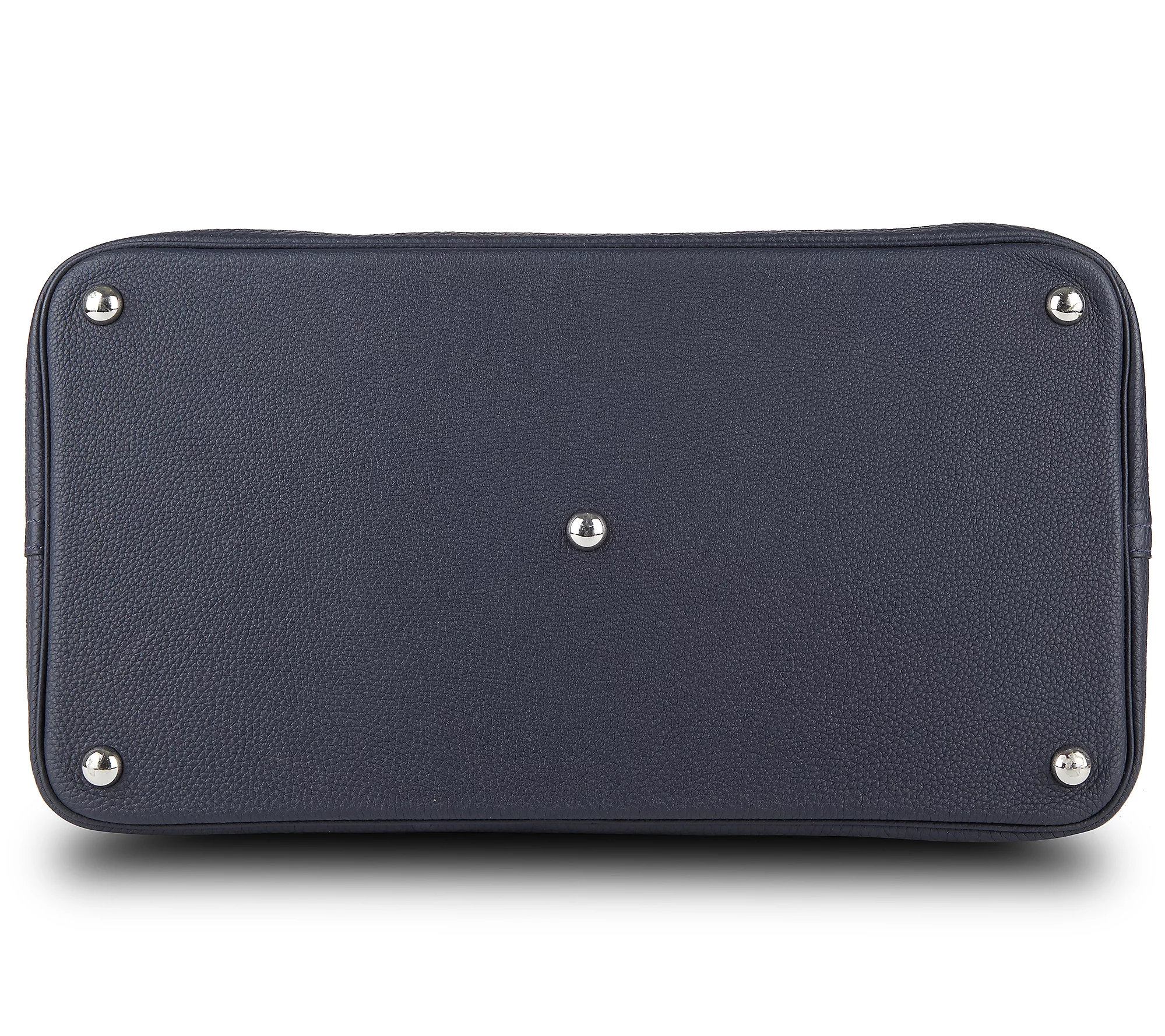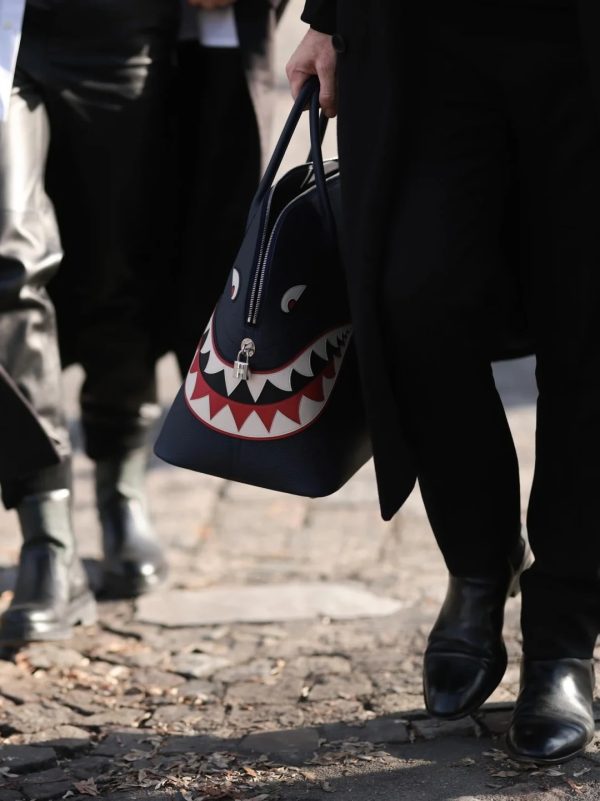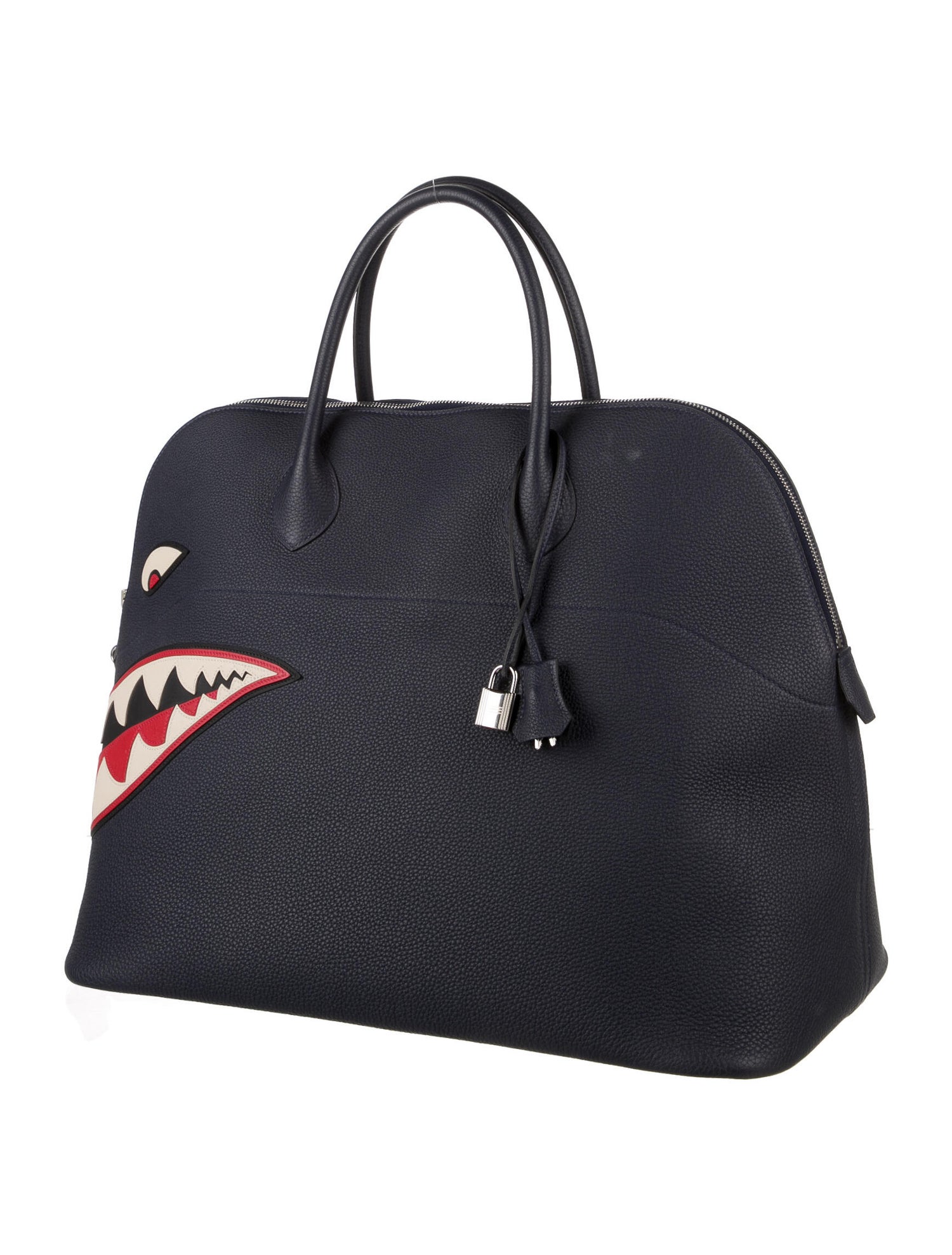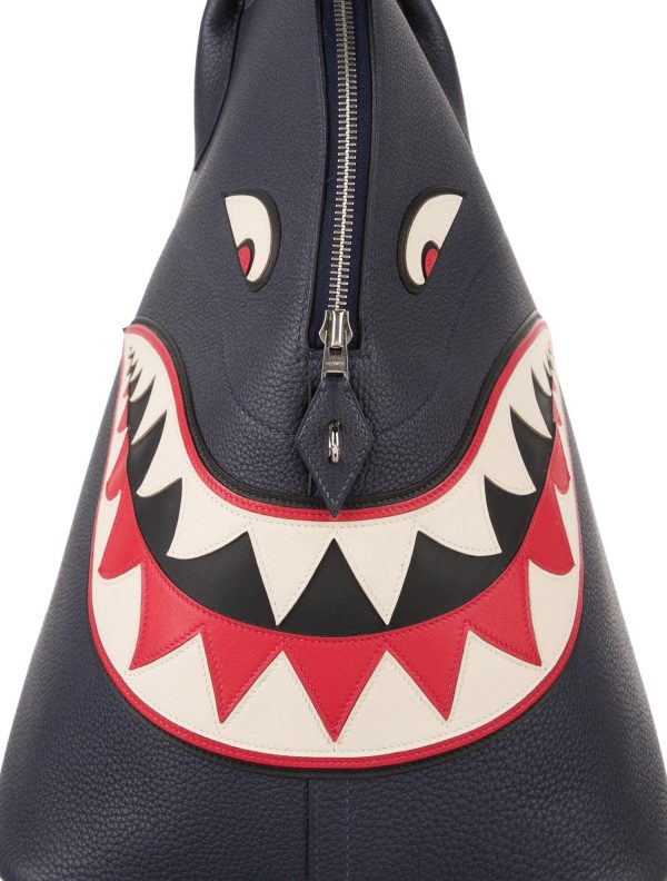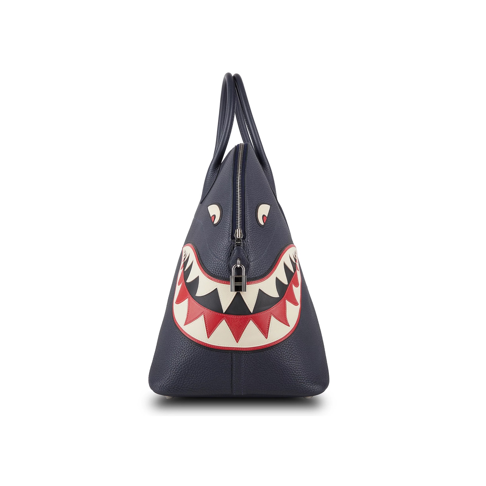 Togo Shark Bolide 45 in blue. This stylish tote is crafted of lovely soft pebbled togo leather in blue with an intimidating shark face off to the side. The bag features rolled leather top handles, a cadena palladium lock, palladium hardware, and a hanging clochette with keys. The top zipper opens to a spacious herringbone fabric and leather interior making this an ideal for a weekender bag
