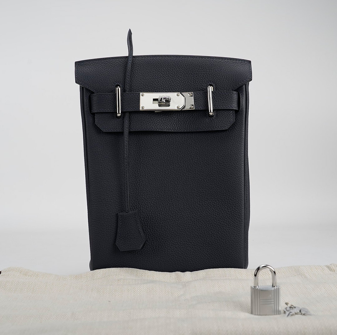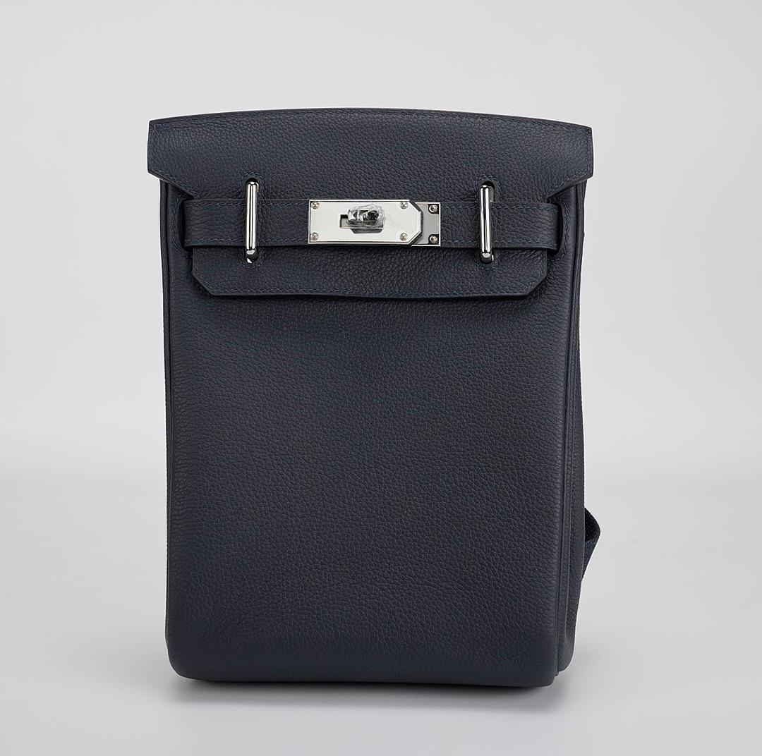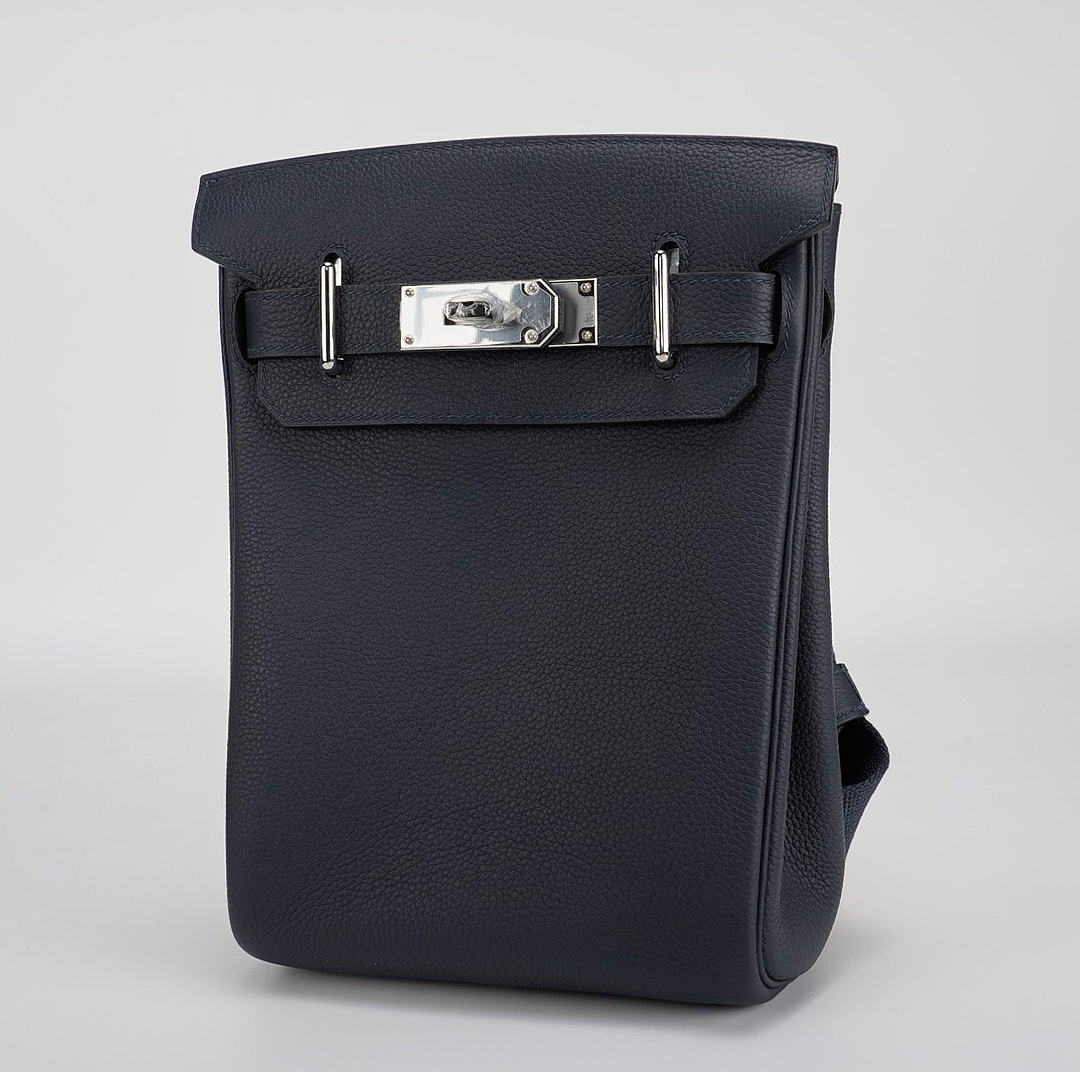 This is a Togo Hac A Dos Backpack. This stylish backpack is crafted of calfskin leather with a cross-over flap, polished palladium hardware including a strap anchors, and long adjustable canvas shoulder straps. The flap opens to a compact leather interior with a patch pocket.