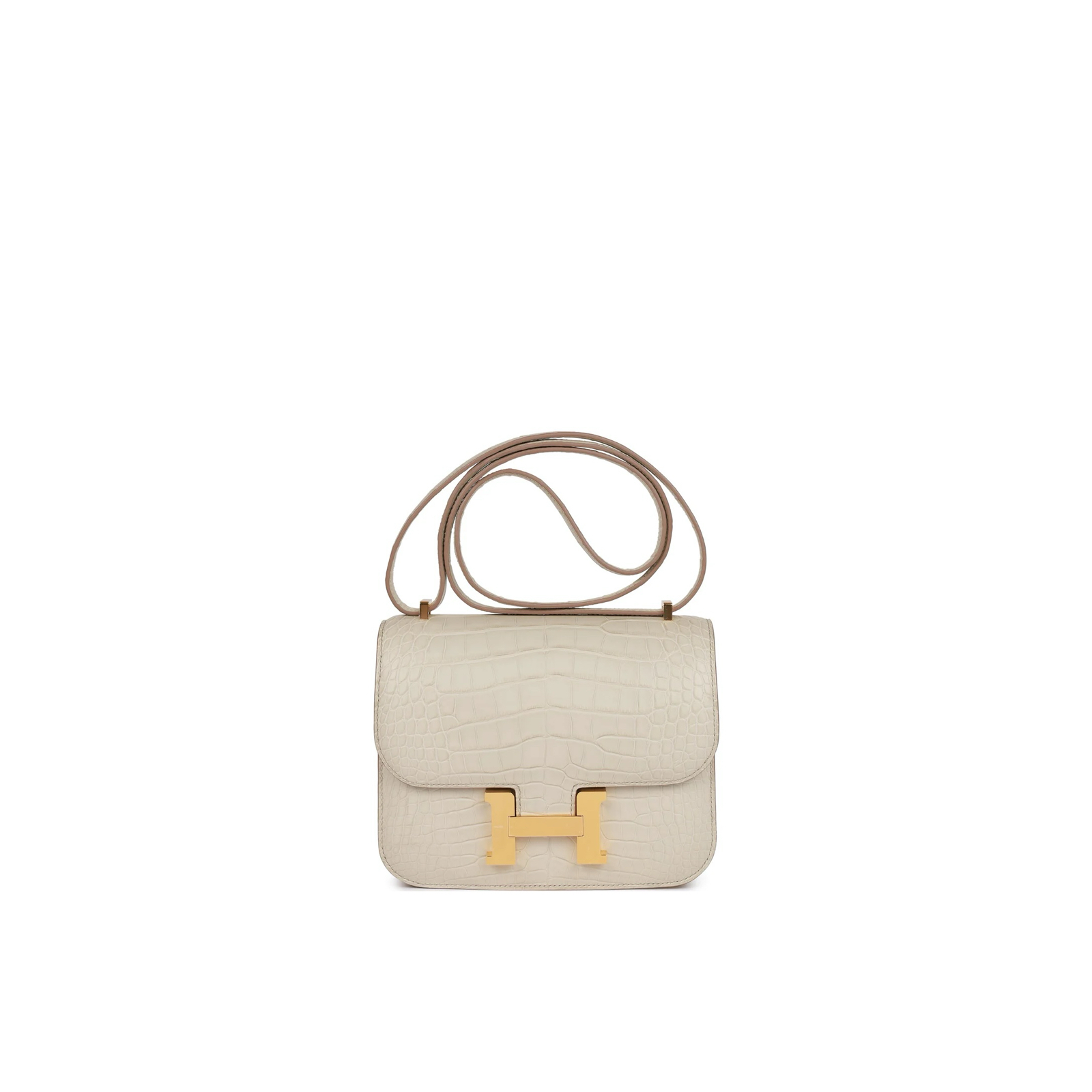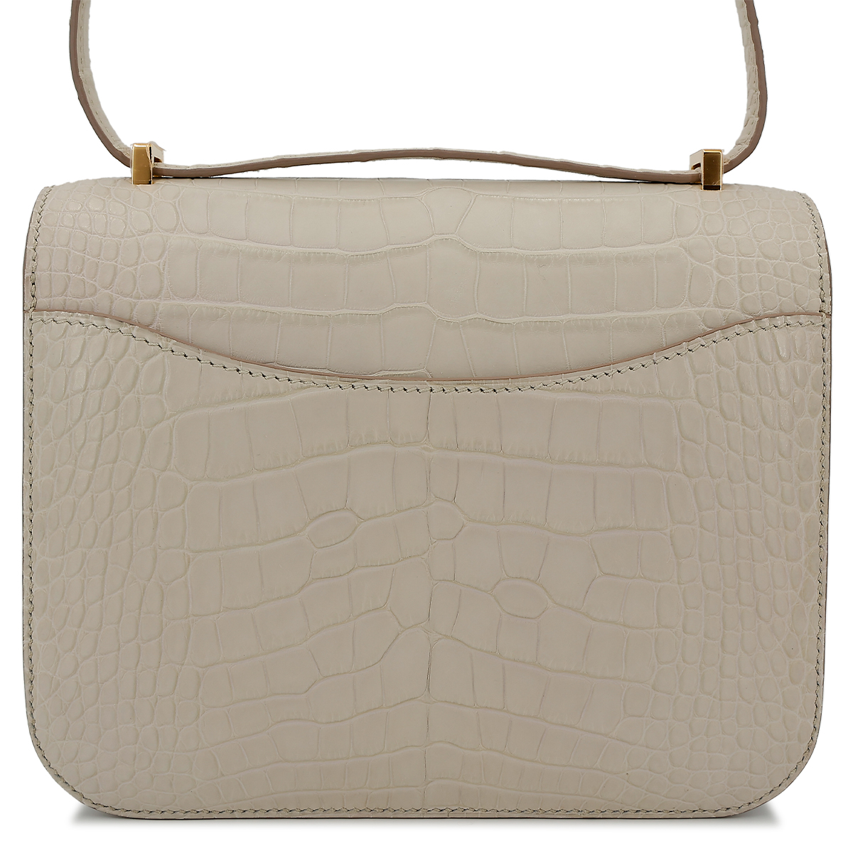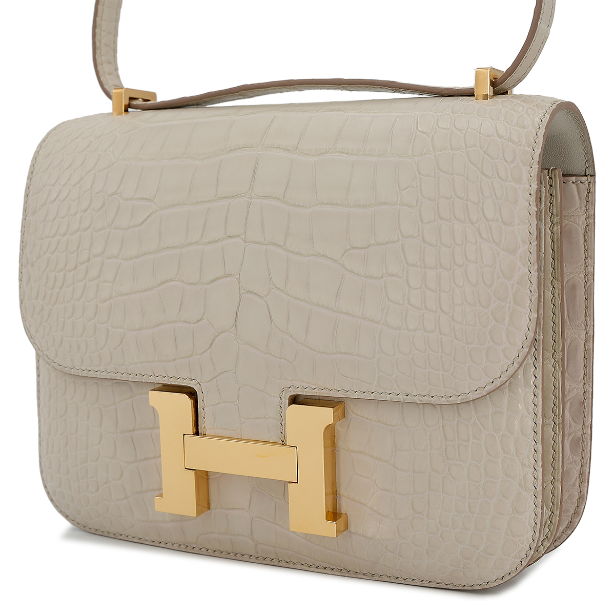 This Constance is of Beton Matte Alligator with gold hardware and features tonal stitching, a “H” snap lock closure, and a long shoulder strap. The interior is lined with Black lambskin and has an open pocket on the front wall, a center divide, and a slit pocket on the back wall.