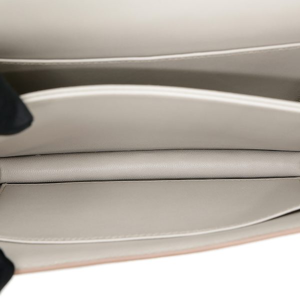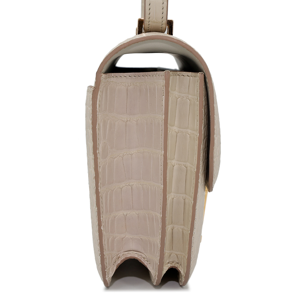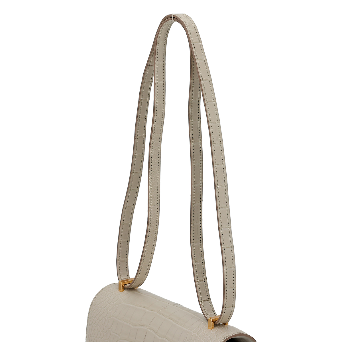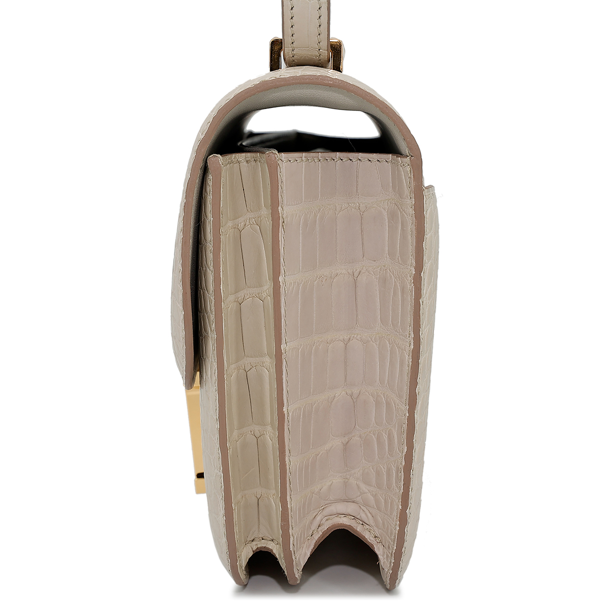 This Constance is of Beton Matte Alligator with gold hardware and features tonal stitching, a “H” snap lock closure, and a long shoulder strap. The interior is lined with Black lambskin and has an open pocket on the front wall, a center divide, and a slit pocket on the back wall.