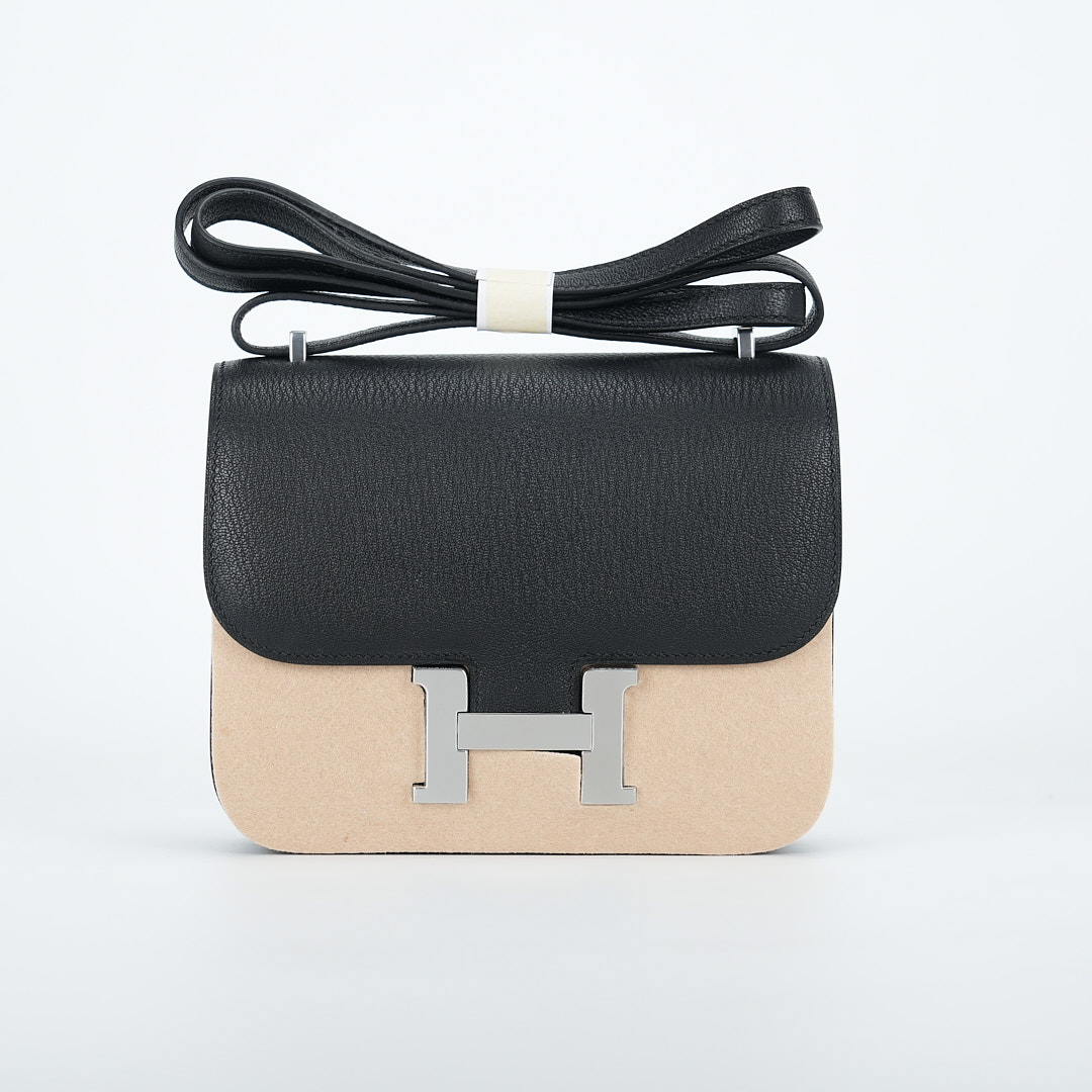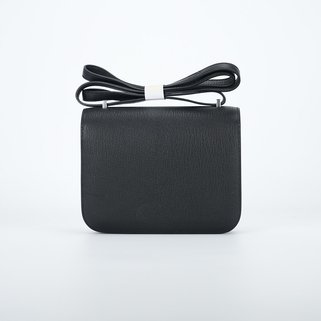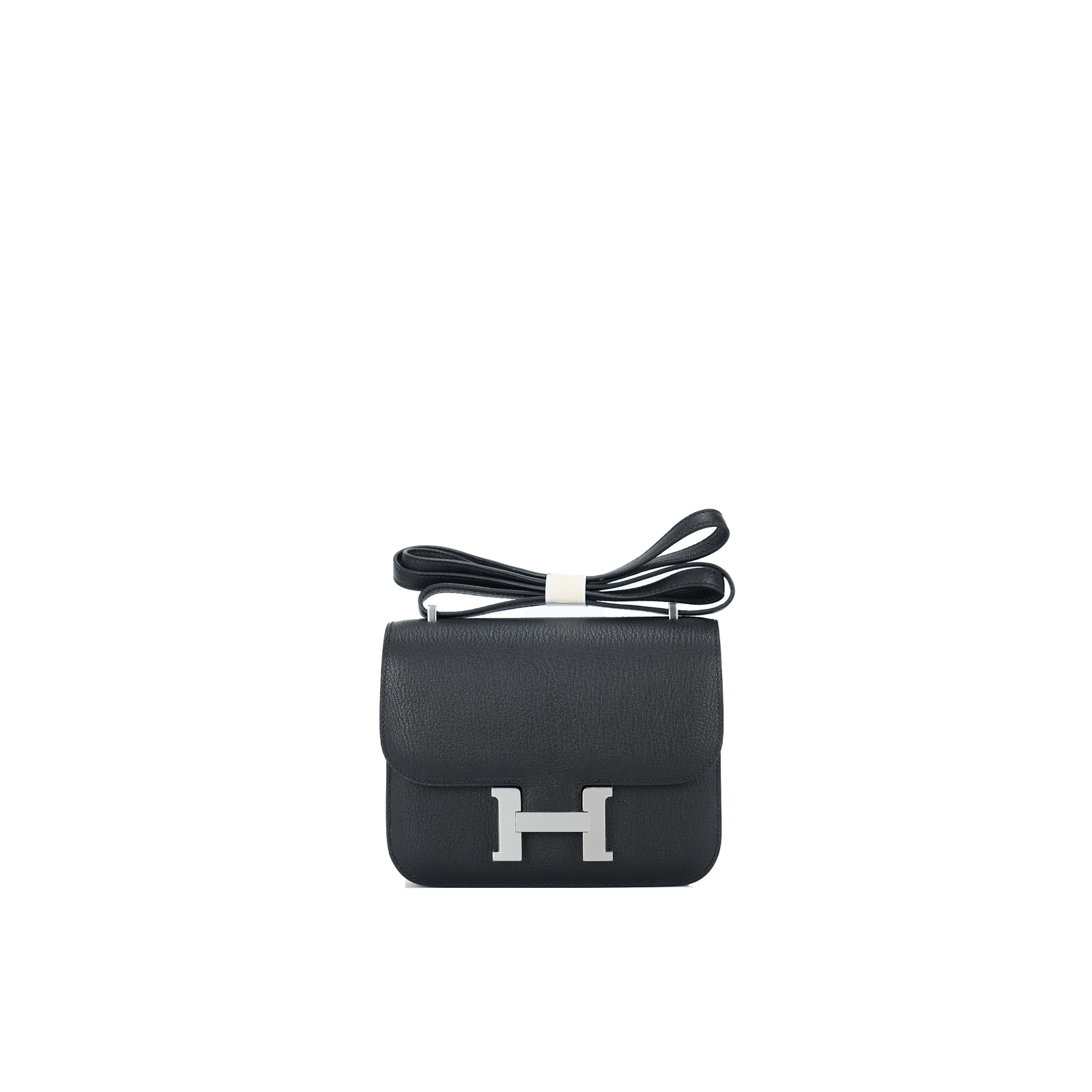 This Constance is in Black Chevre with palladium hardware, has tonal stitching, a metal “H” snap lock closure and adjustable shoulder strap. The interior is lined with Blue Nuit lambskin and has an open pocket on the front wall, a center divide.