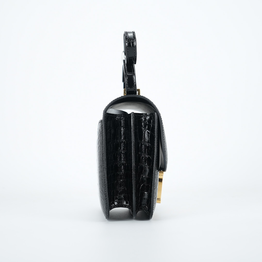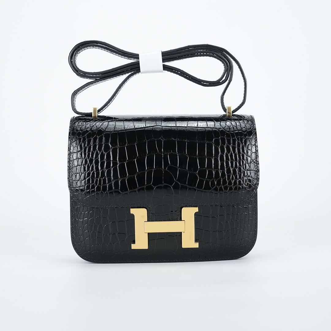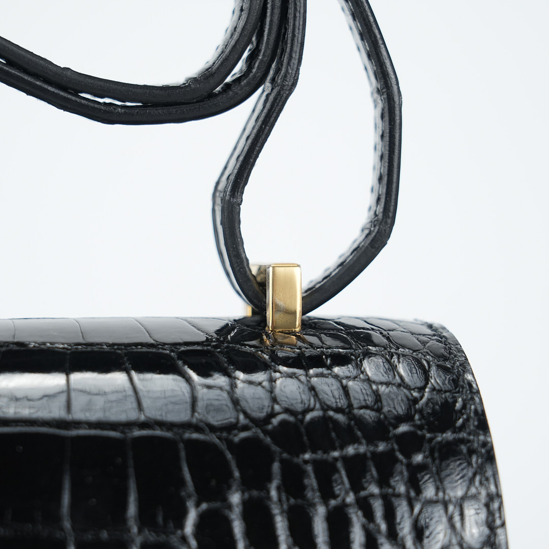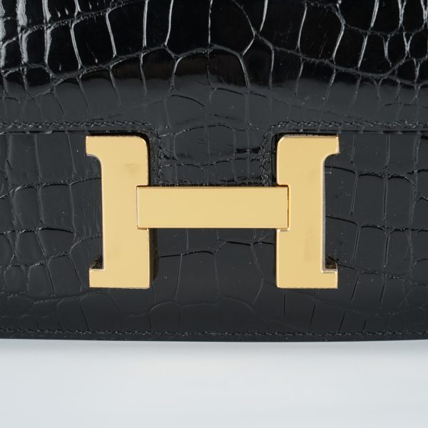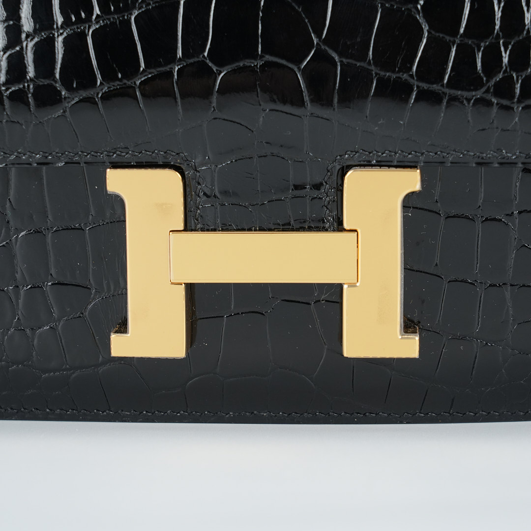 This Constance is of Black shiny Alligator with gold hardware and features tonal stitching, a “H” snap lock closure, and a long shoulder strap. The interior is lined with Black lambskin and has an open pocket on the front wall, a center divide, and a slit pocket on the back wall.