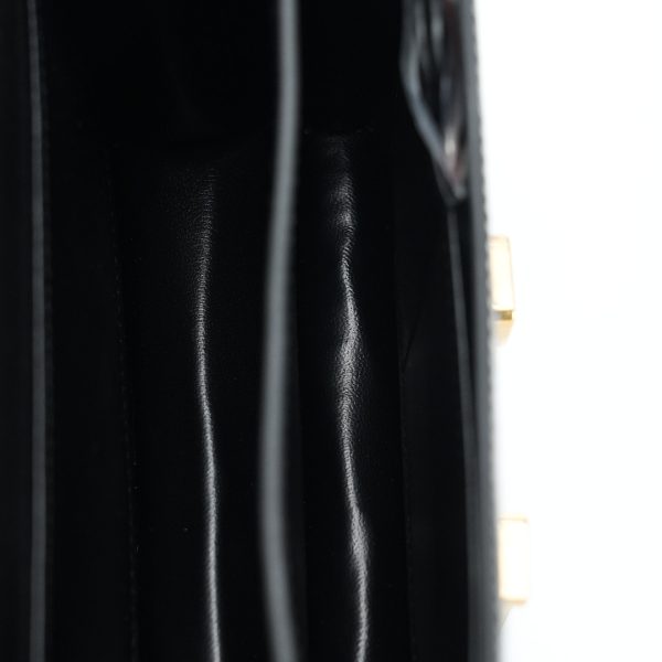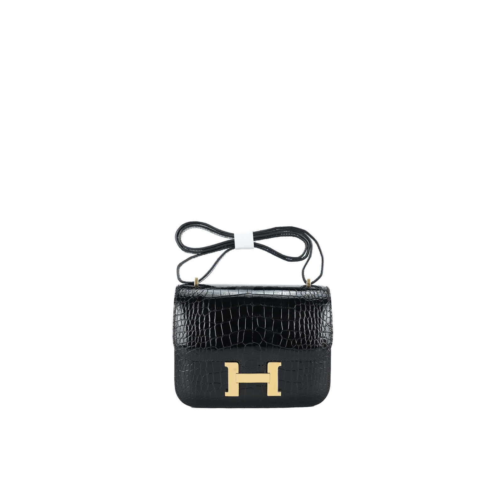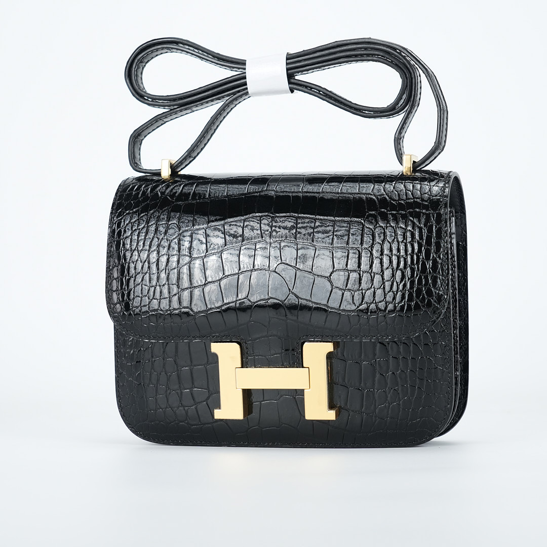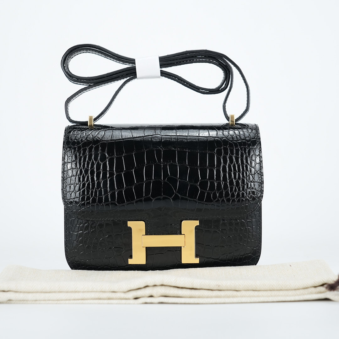 This Constance is of Black shiny Alligator with gold hardware and features tonal stitching, a “H” snap lock closure, and a long shoulder strap. The interior is lined with Black lambskin and has an open pocket on the front wall, a center divide, and a slit pocket on the back wall.