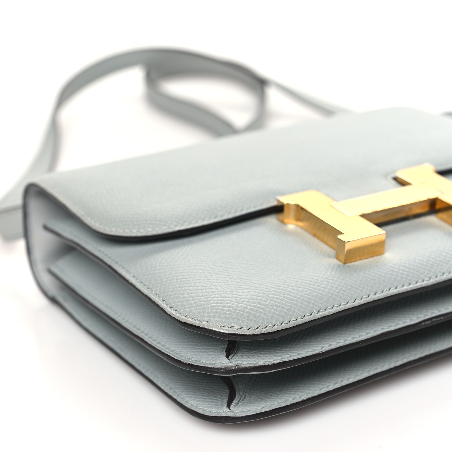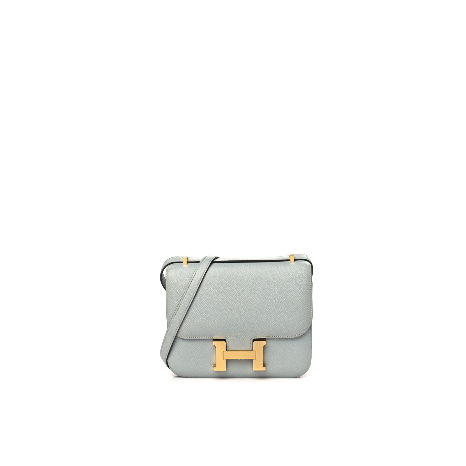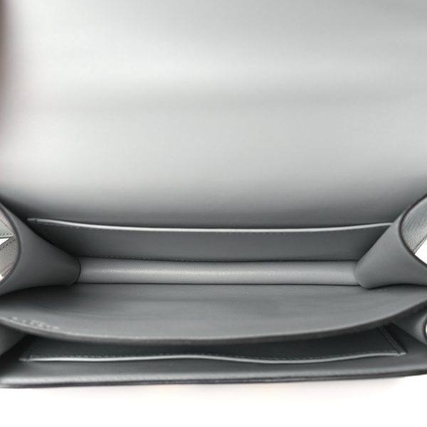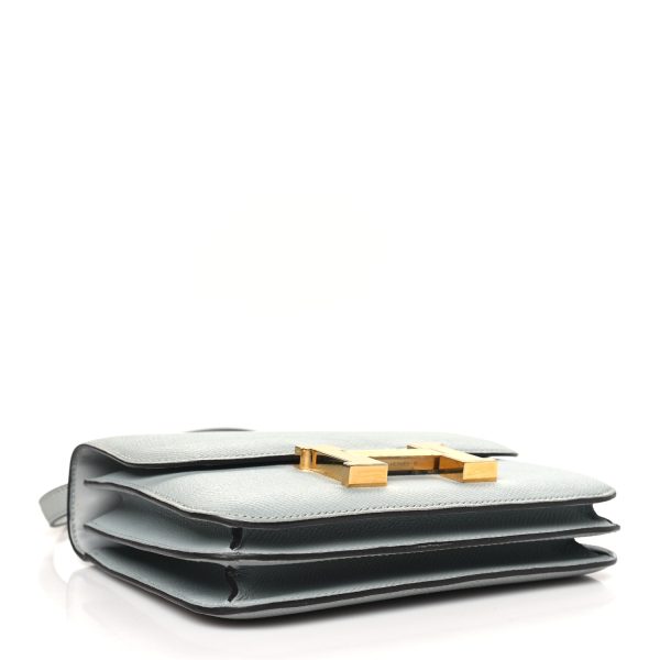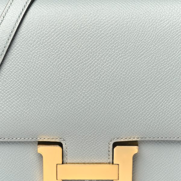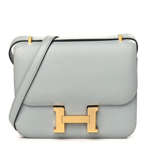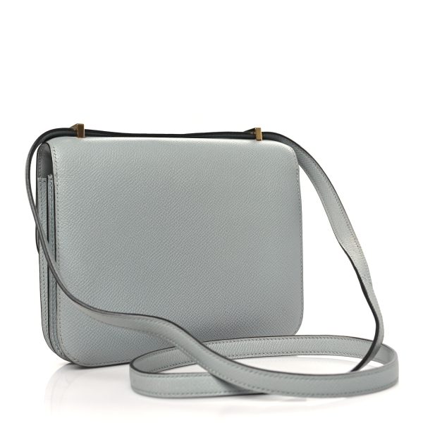 This is an Epsom Constance 18 in Gull Grey. This is a chic small bag that is finely crafted of luxurious epsom calfskin leather in a grayish tone. The bag features a leather cross body shoulder strap, expandable sides, a facing flap and a polished palladium H. The flap opens to a partitioned leather interior. This is a fabulous day or evening bag with the classical sophistication.