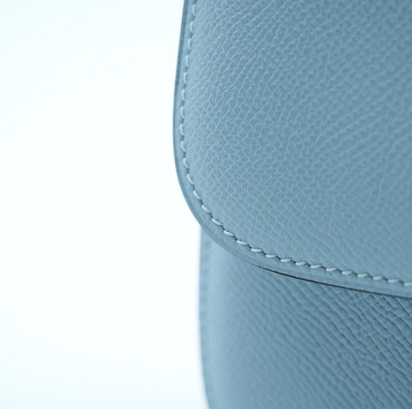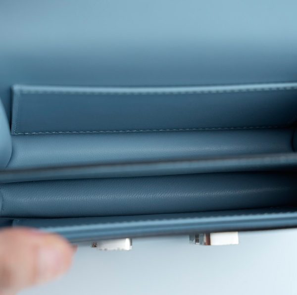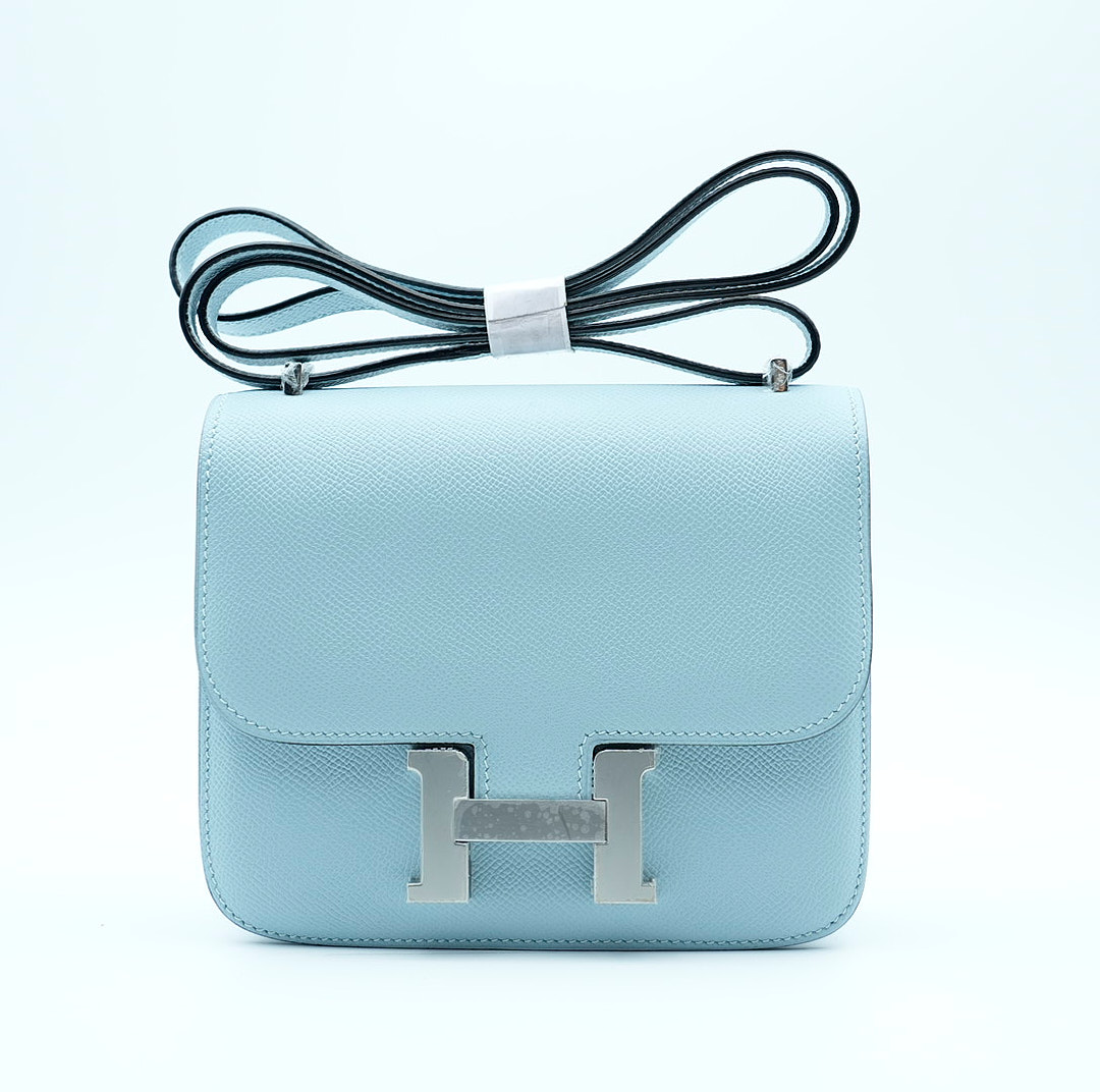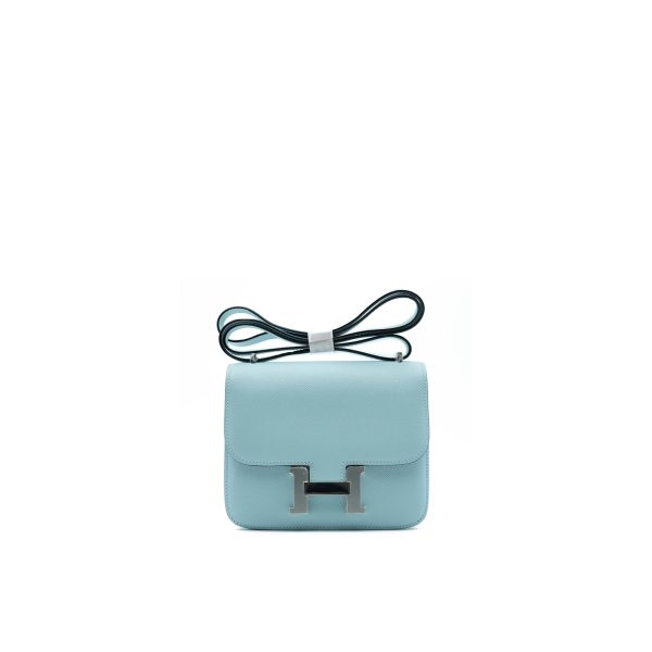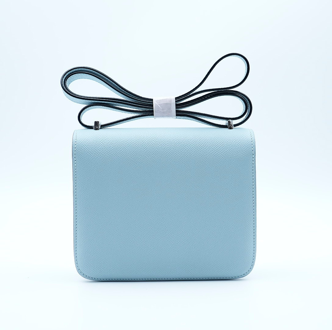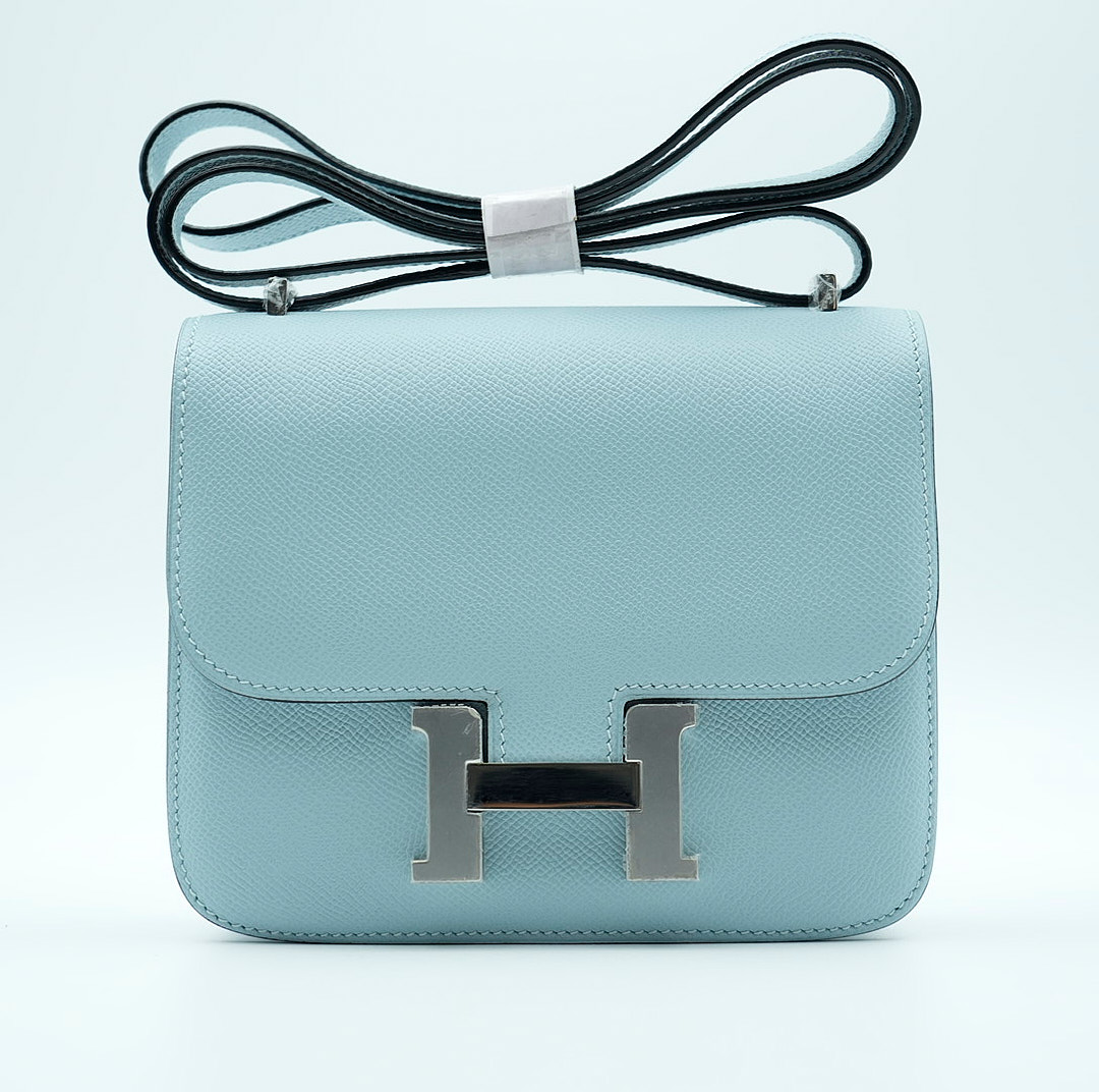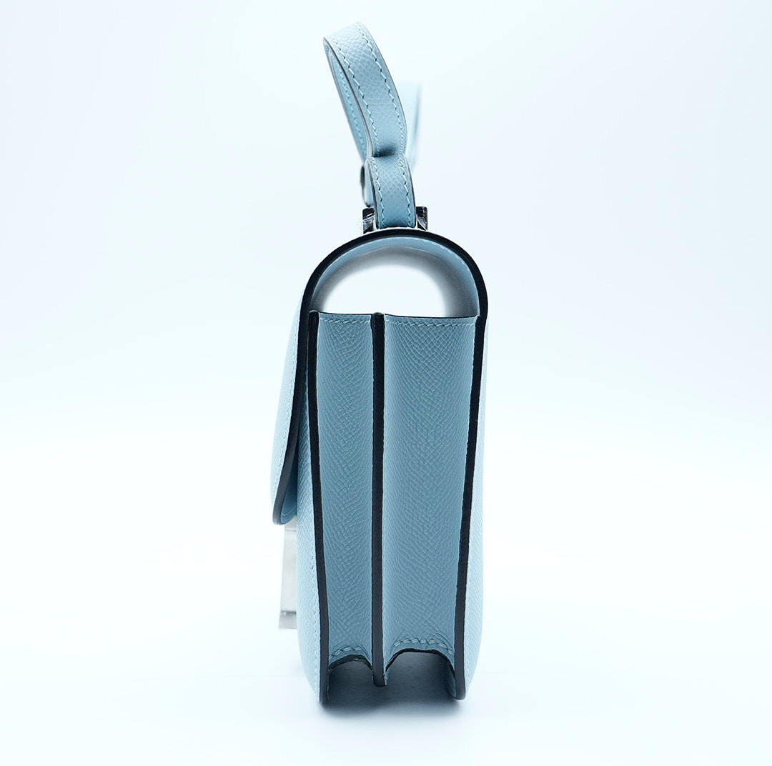 This is an Epsom Constance 18 in Bleu Glacier. This is a chic small bag that is finely crafted of luxurious epsom calfskin leather in a grayish blue. The bag features a leather cross body shoulder strap, expandable sides, a facing flap and a polished palladium H. The flap opens to a partitioned leather interior. This is a fabulous day or evening bag with the classical sophistication.