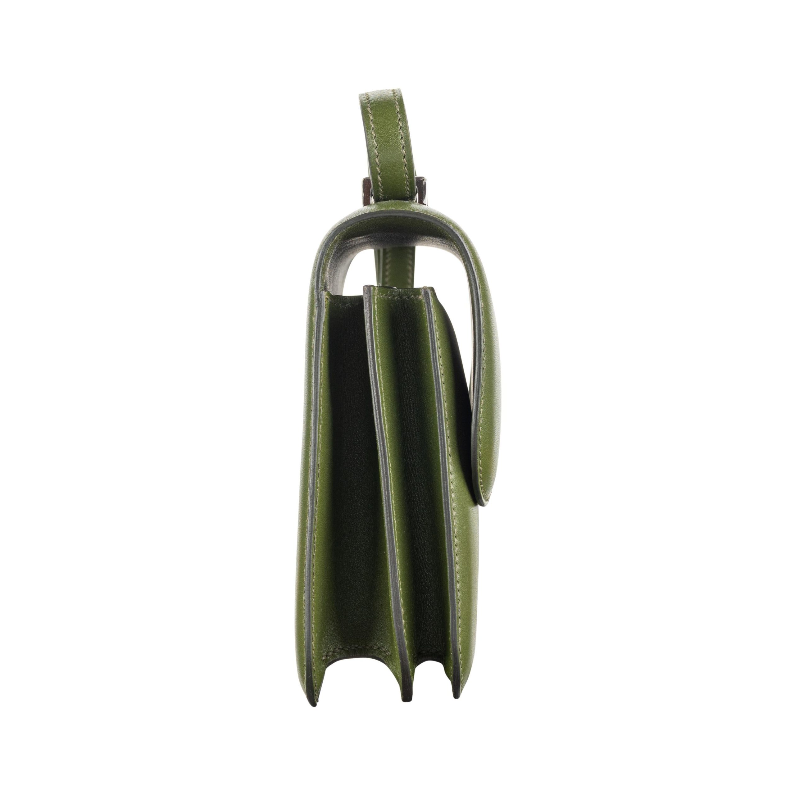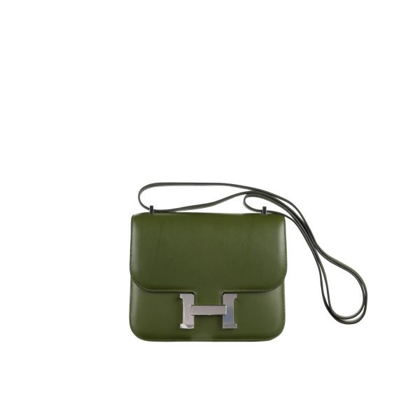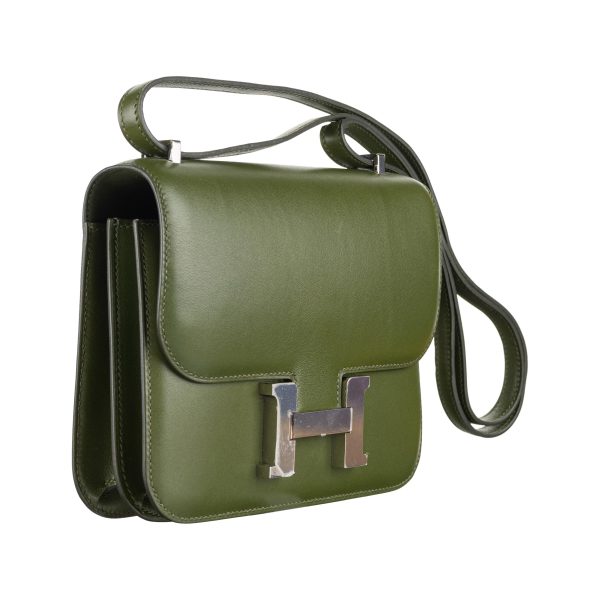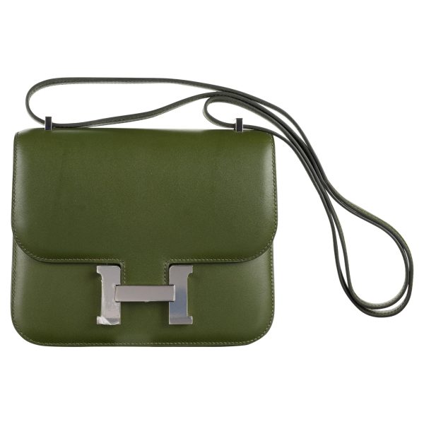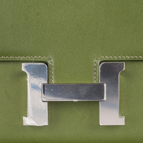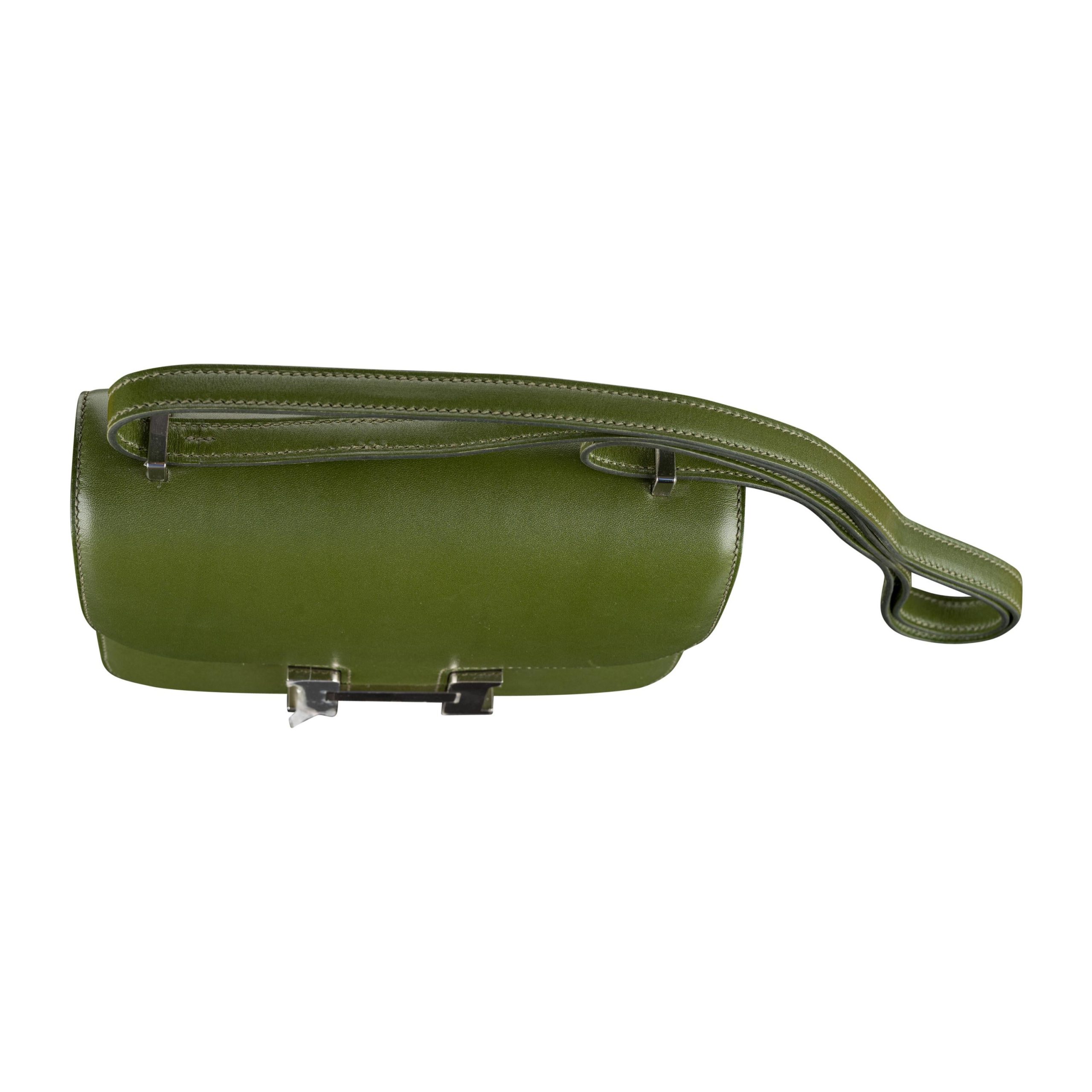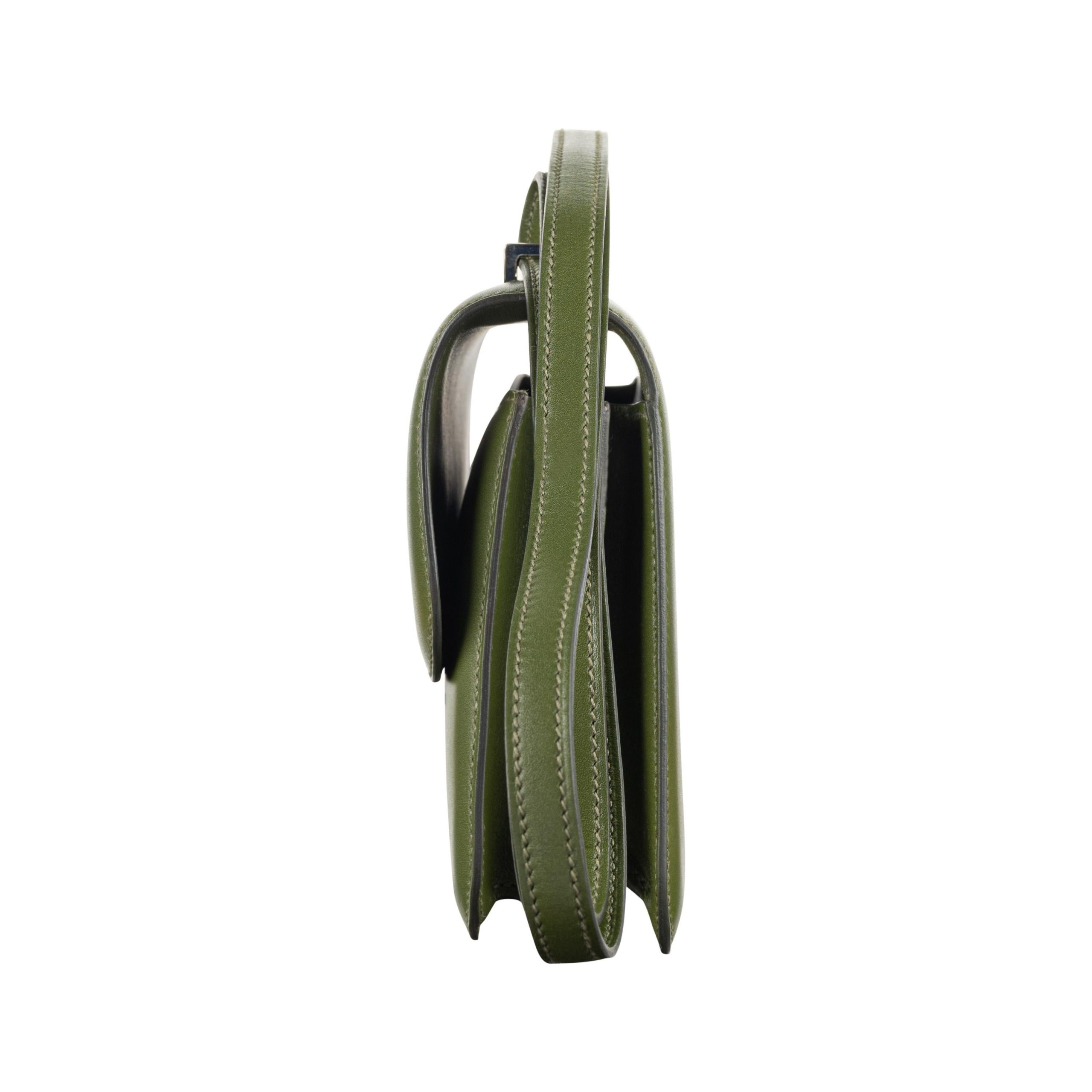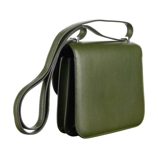 This Constance is in Canopee Swift with palladium hardware, has tonal stitching, a metal “H” snap lock closure and adjustable shoulder strap. The interior is lined with Canopee lambskin and has an open pocket on the front wall, a center divide, and a slit pocket on the back wall.