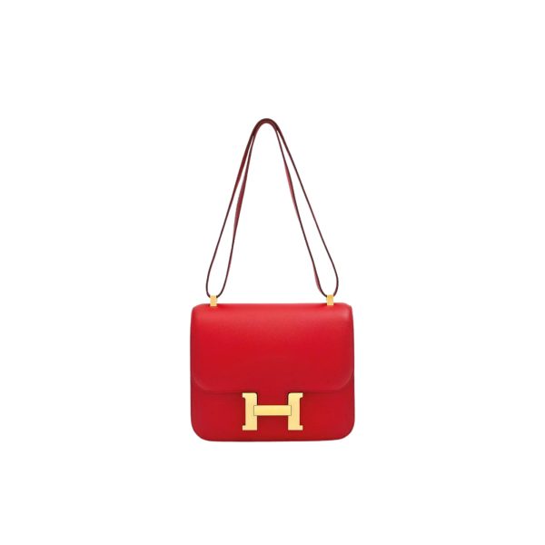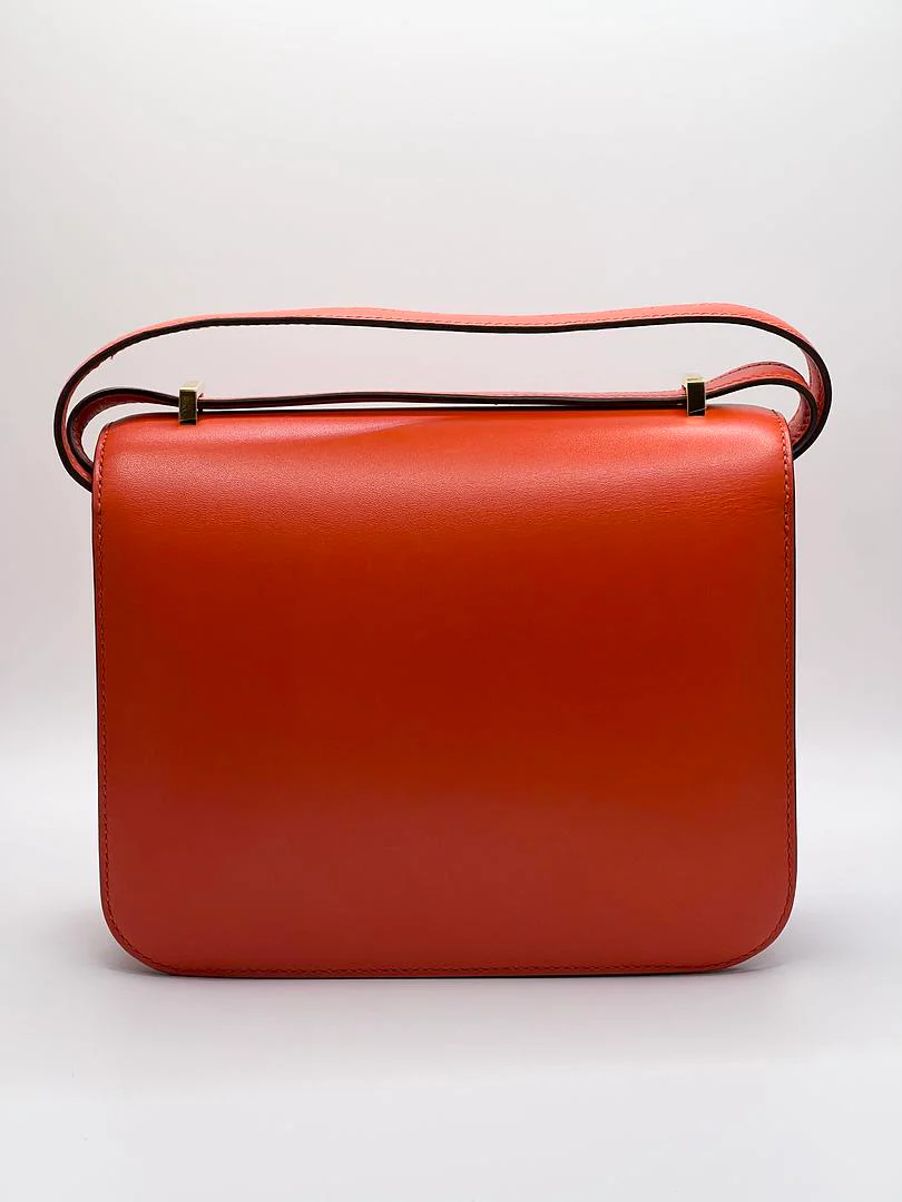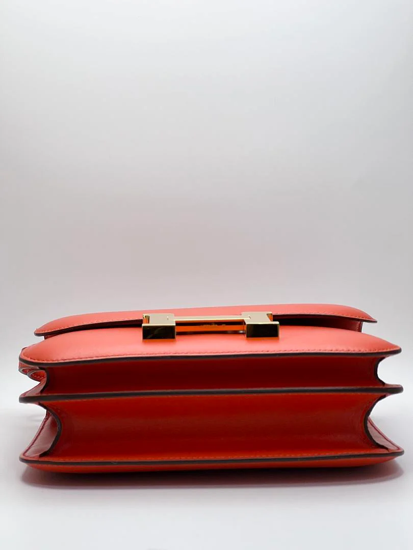 This Constance is in Capucine Swift with Gold hardware, has tonal stitching, a metal “H” snap lock closure and adjustable shoulder strap. The interior is lined with Goat lambskin and has an open pocket on the front wall, a center divide.