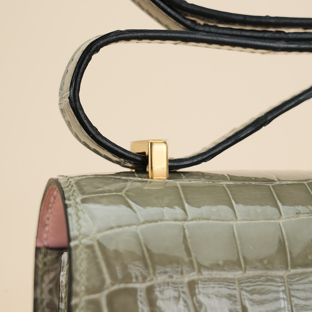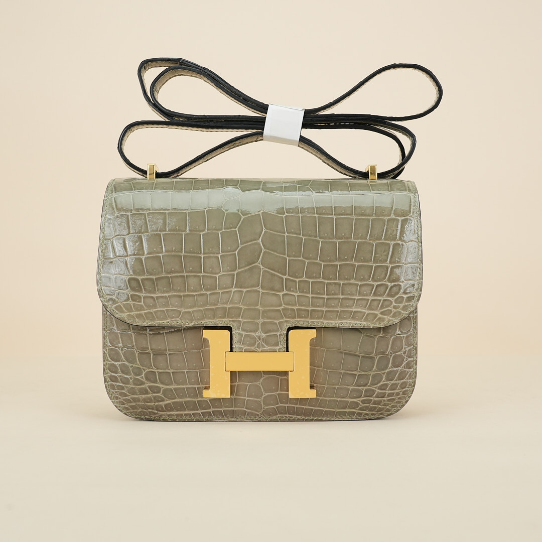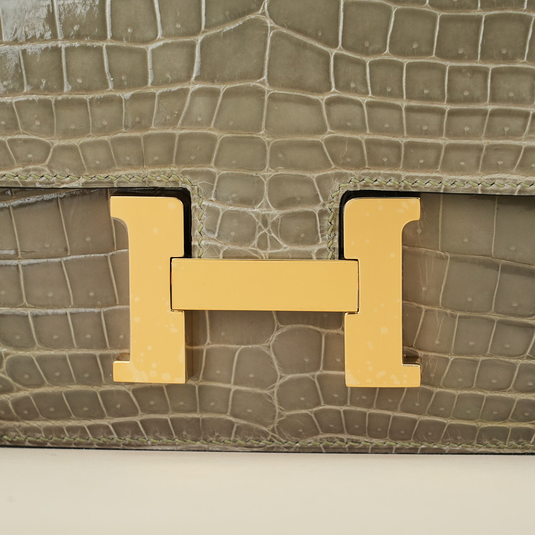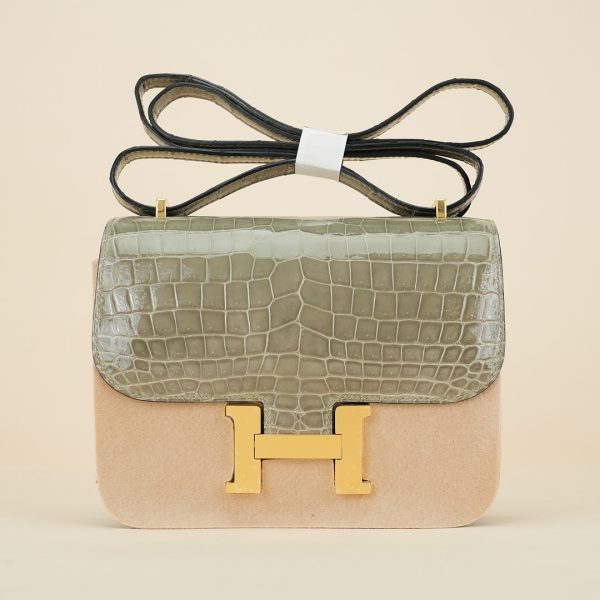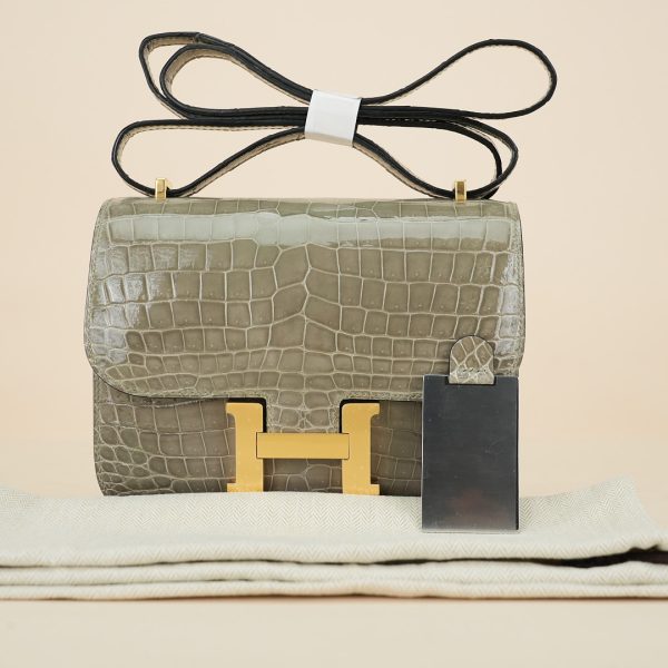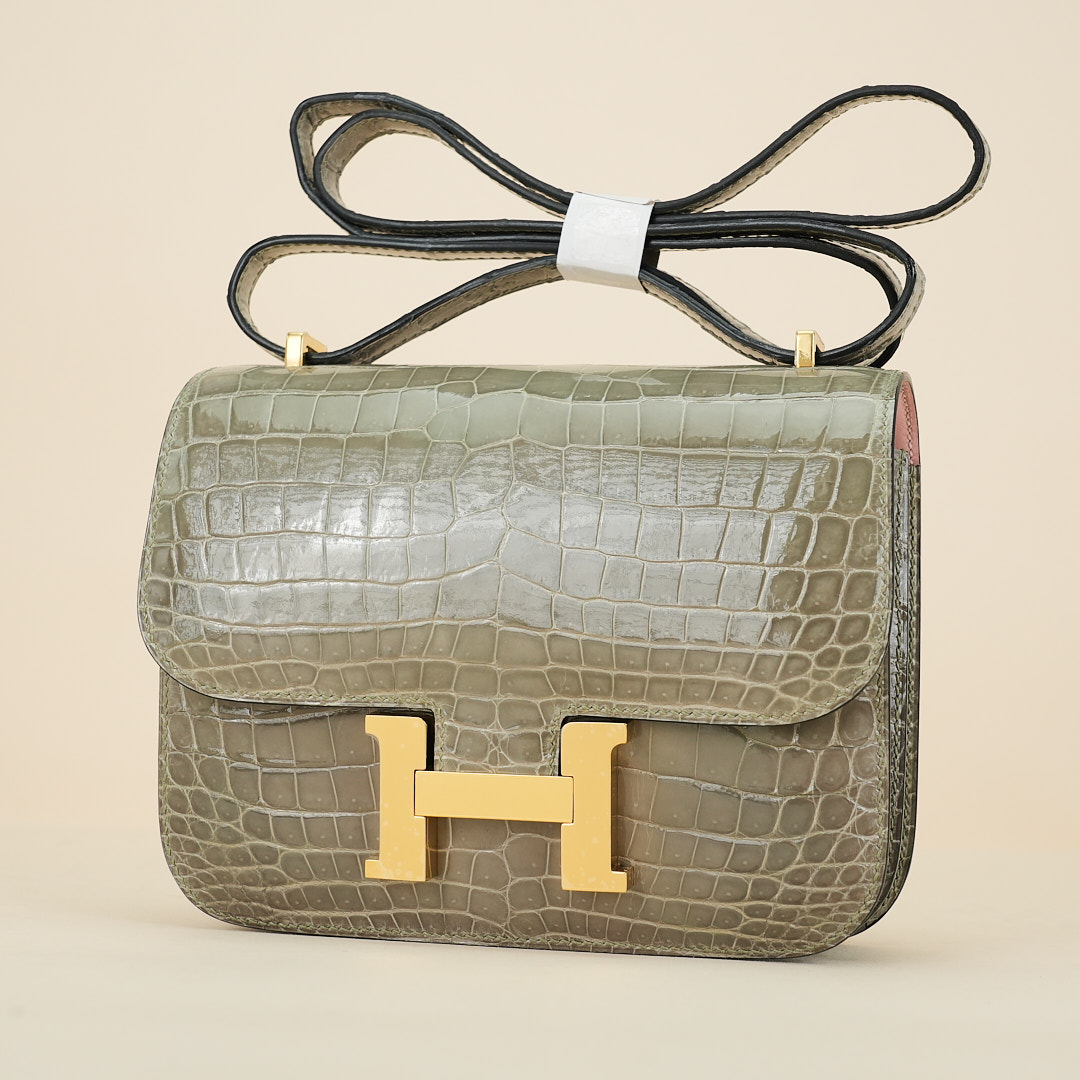 This Constance is of Gris Tourterelle Niloticus with gold hardware and features tonal stitching, a “H” snap lock closure, and a long shoulder strap. The interior is lined with Rose Sakura lambskin and has an open pocket on the front wall, a center divide, and a slit pocket on the back wall.