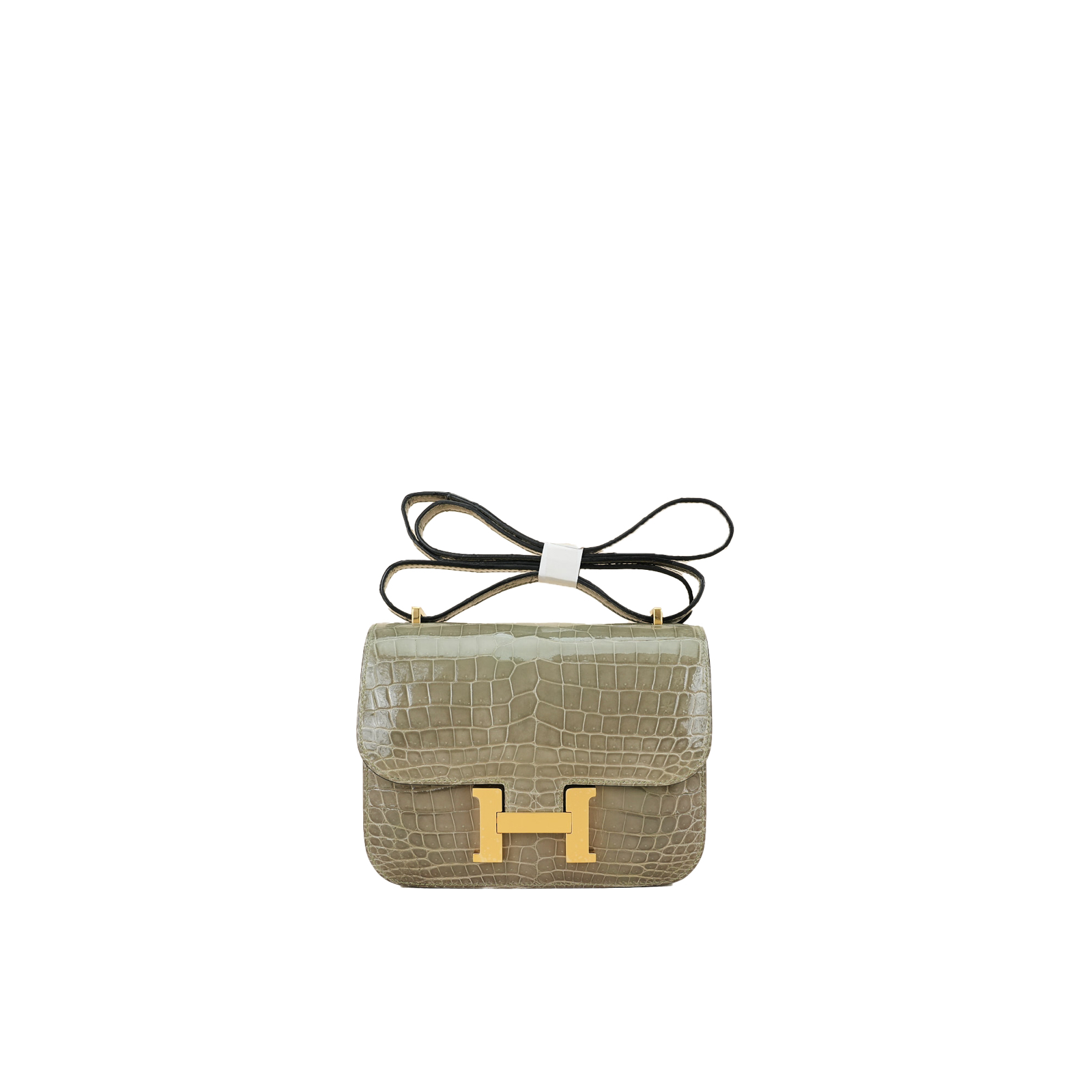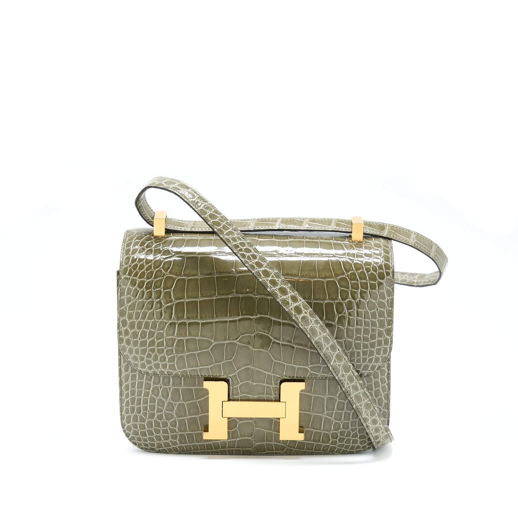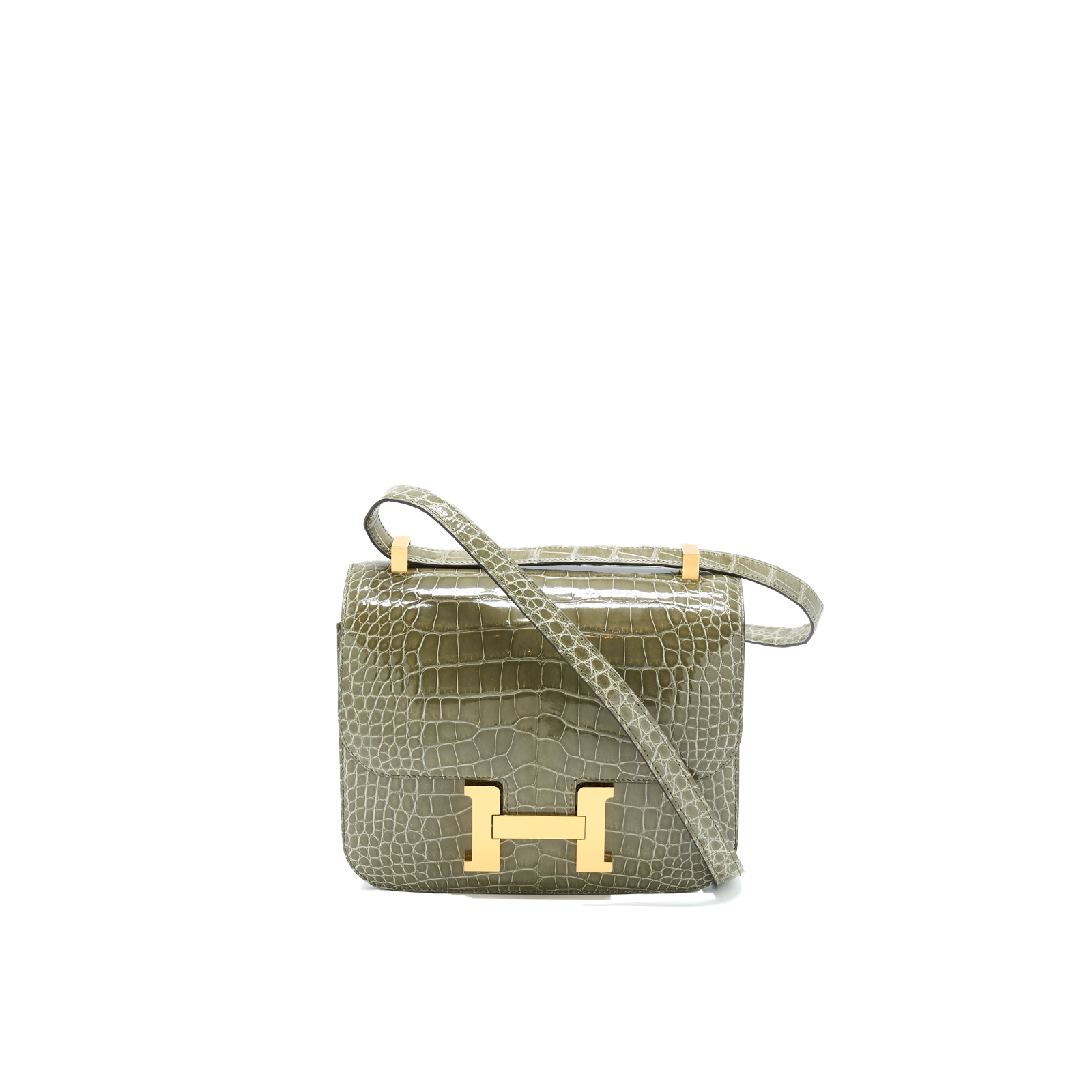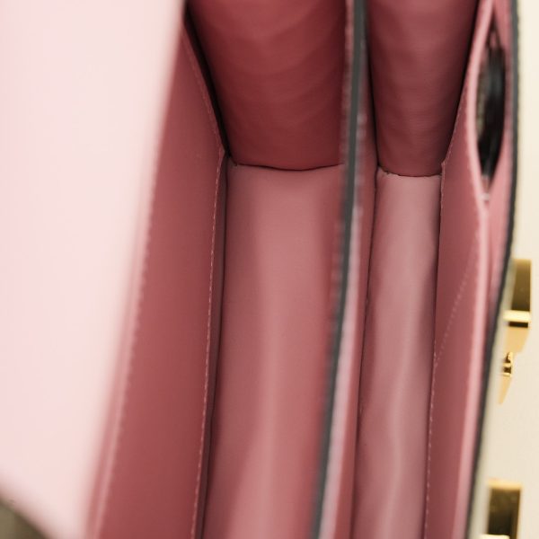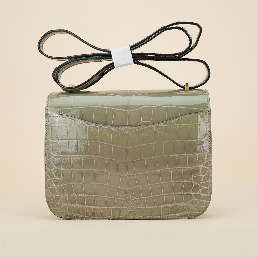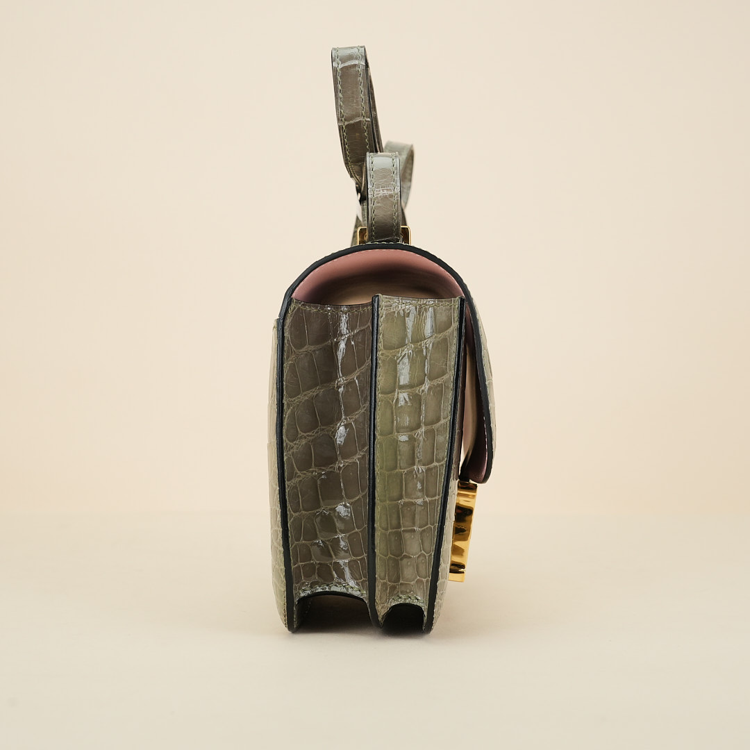 This Constance is of Gris Tourterelle Niloticus with gold hardware and features tonal stitching, a “H” snap lock closure, and a long shoulder strap. The interior is lined with Rose Sakura lambskin and has an open pocket on the front wall, a center divide, and a slit pocket on the back wall.