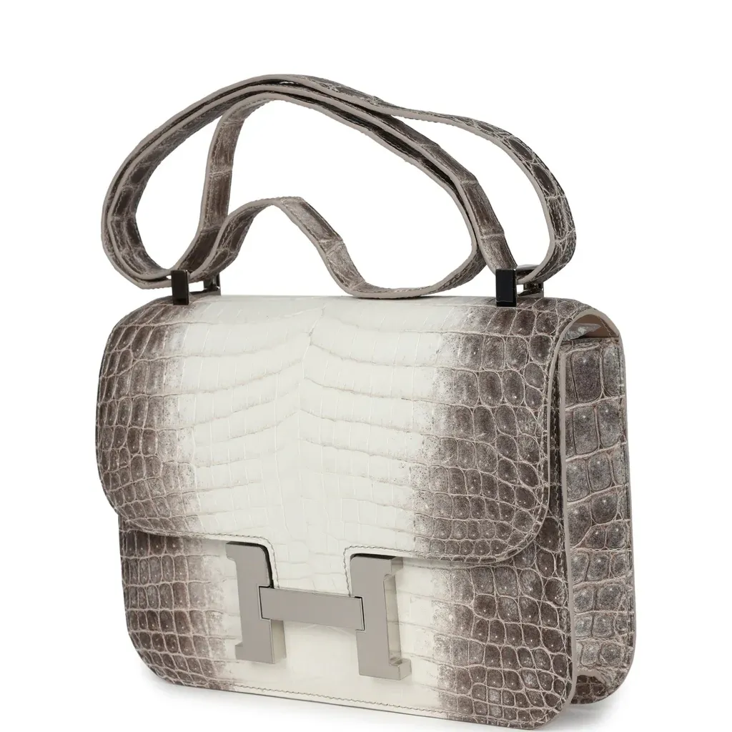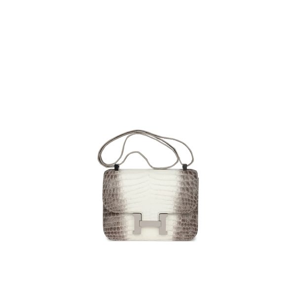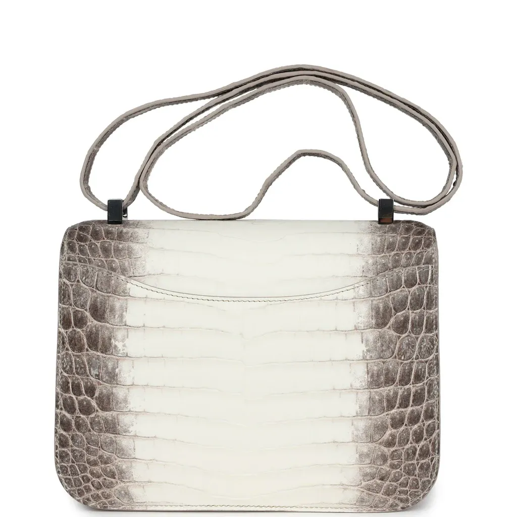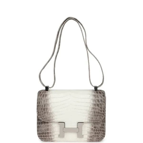 This Constance is of Himalaya Crocodile with Palladium hardware and features tonal stitching, a “H” snap lock closure, and a long shoulder strap. The interior is lined with Black lambskin and has an open pocket on the front wall, a center divide, and a slit pocket on the back wall.