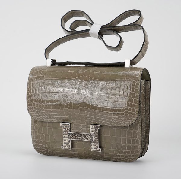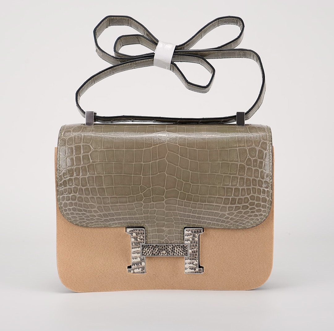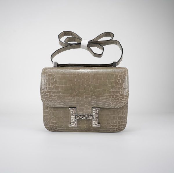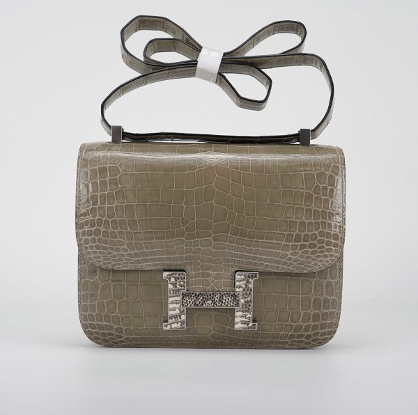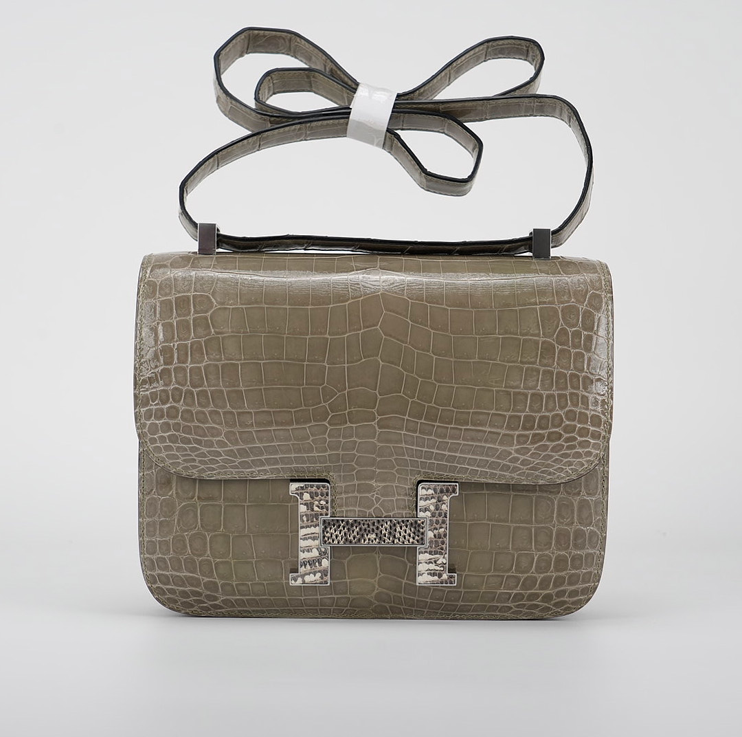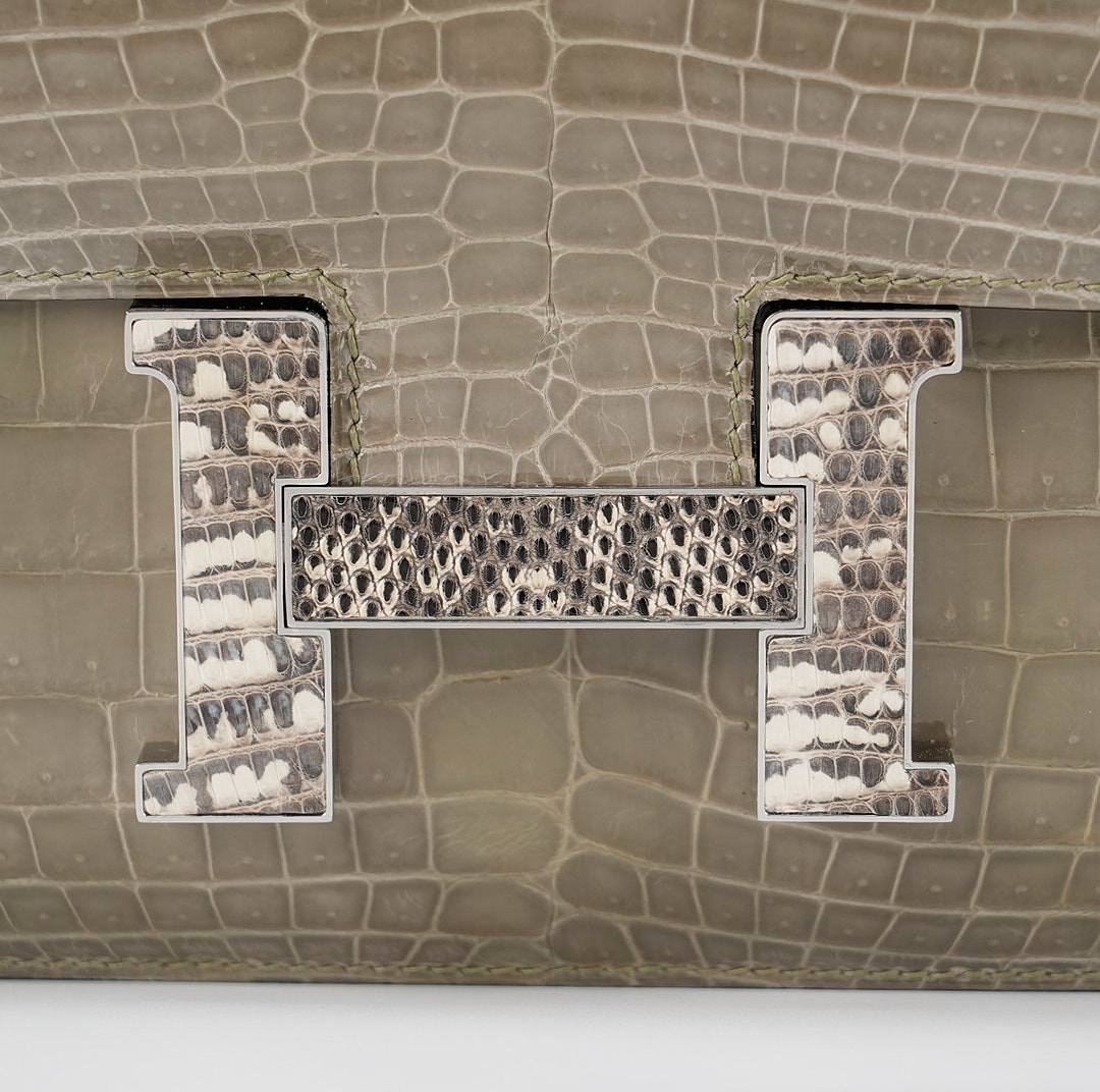 An elegant Constance 24 handcrafted from Niluoticus Gris Tourterelle. The Gris Tourterelle colored design features the signature “H” clasp in Palladium Ombre lizard hardware.