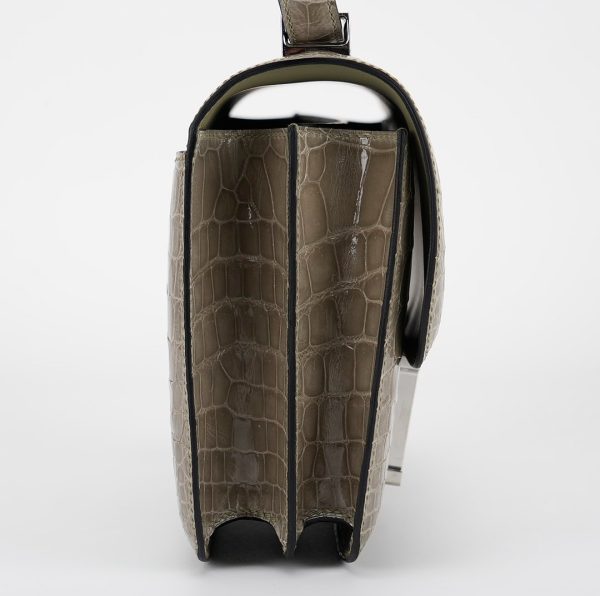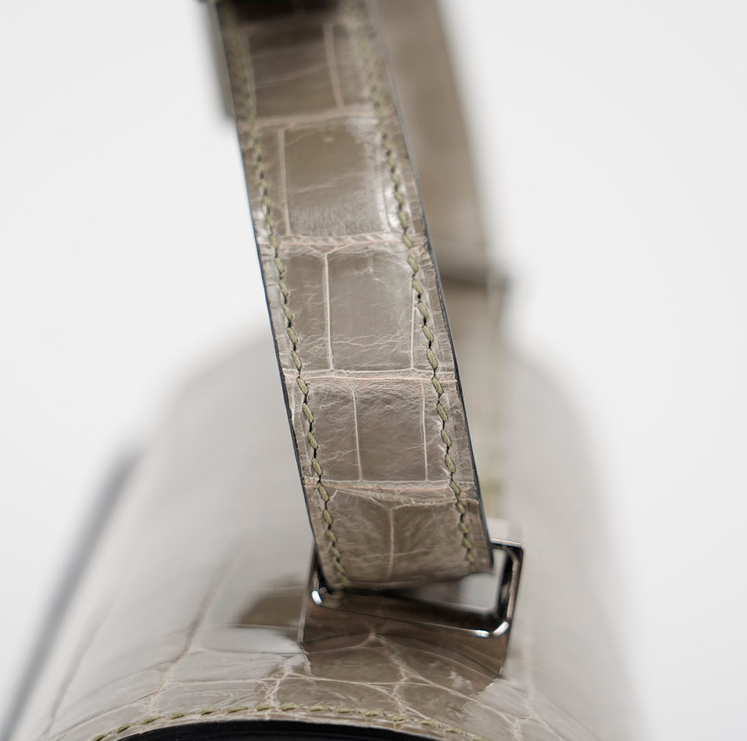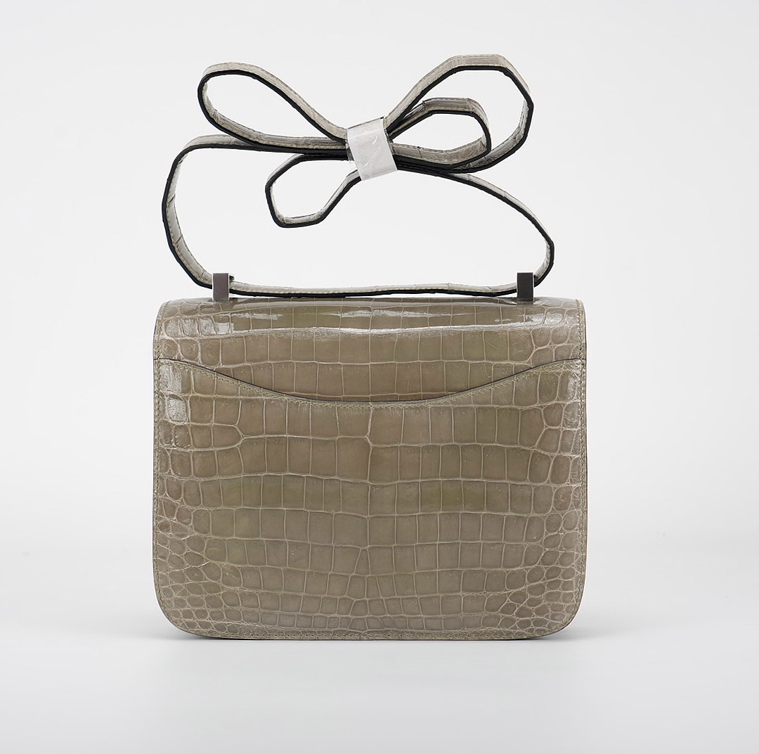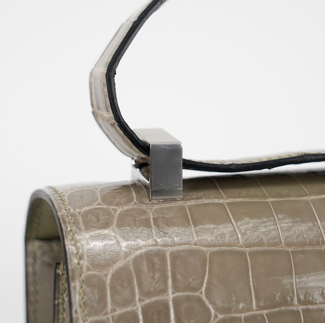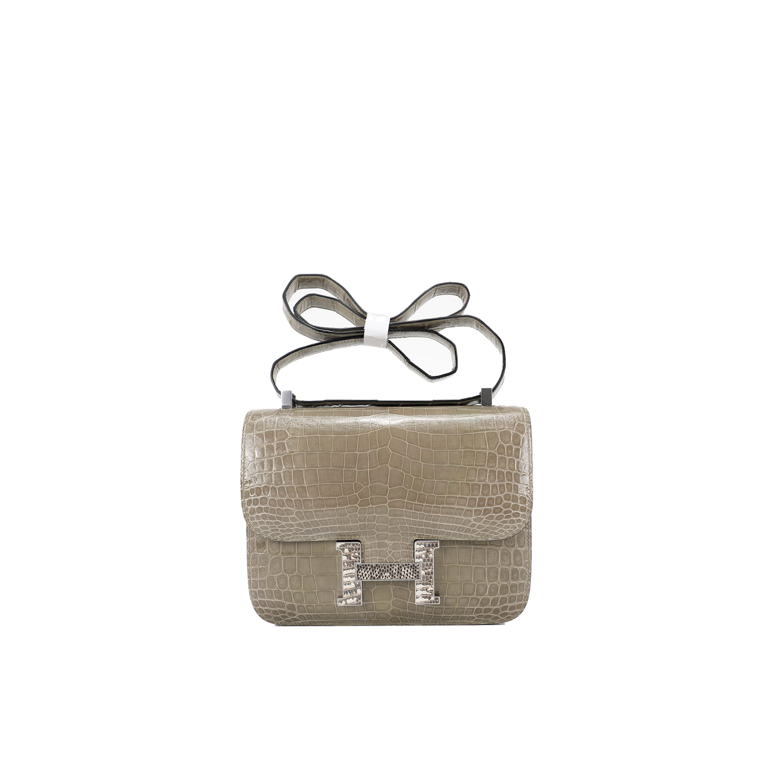 An elegant Constance 24 handcrafted from Niluoticus Gris Tourterelle. The Gris Tourterelle colored design features the signature “H” clasp in Palladium Ombre lizard hardware.