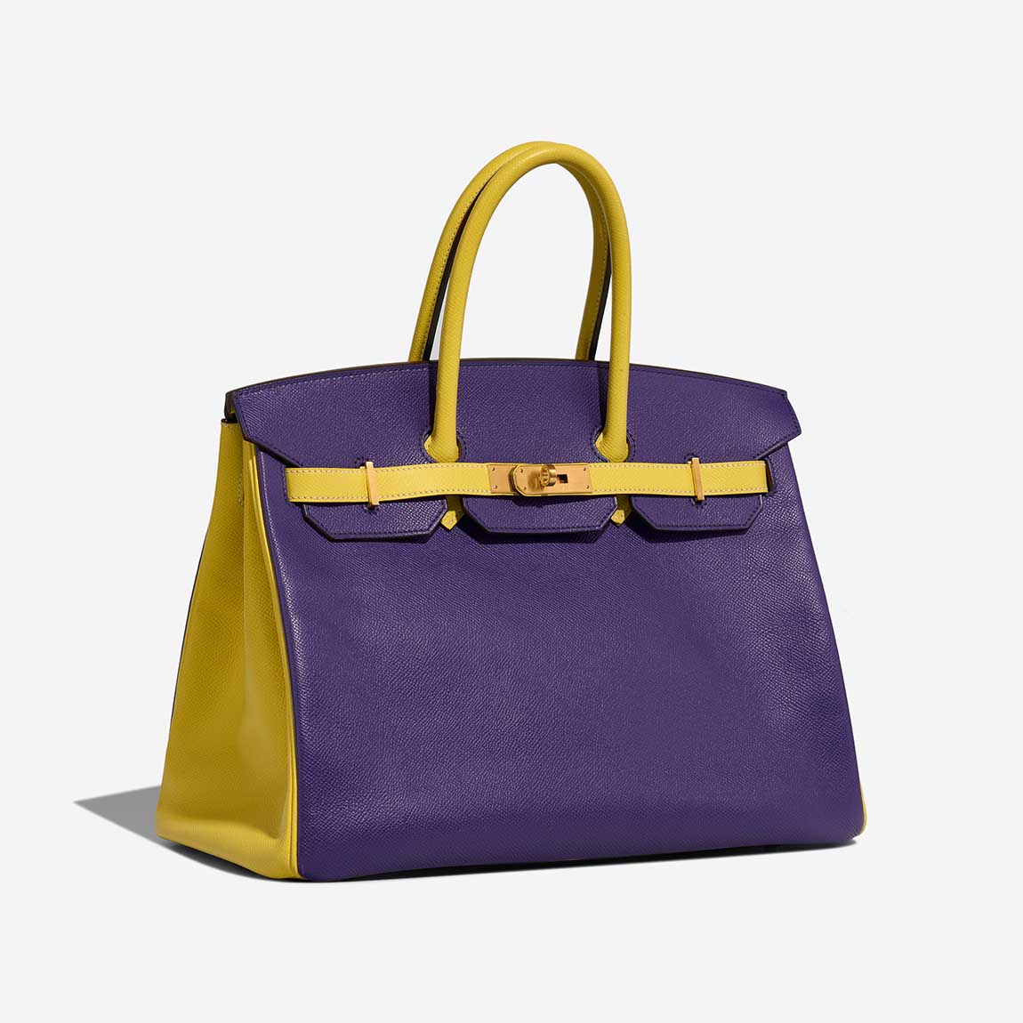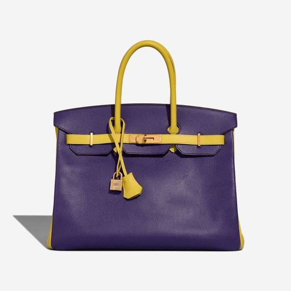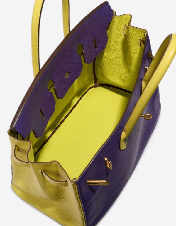 Handcrafted from Epsom leather, its exterior is colored in Lime and Iris whereas the interior is coloured in Kiwi. Add a pop of color to your style with this Bk 35.