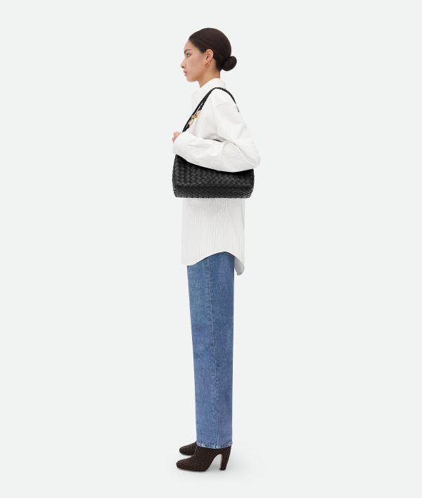 Top handle bag with elongated silhouette in supple Intrecciato leather with signature.