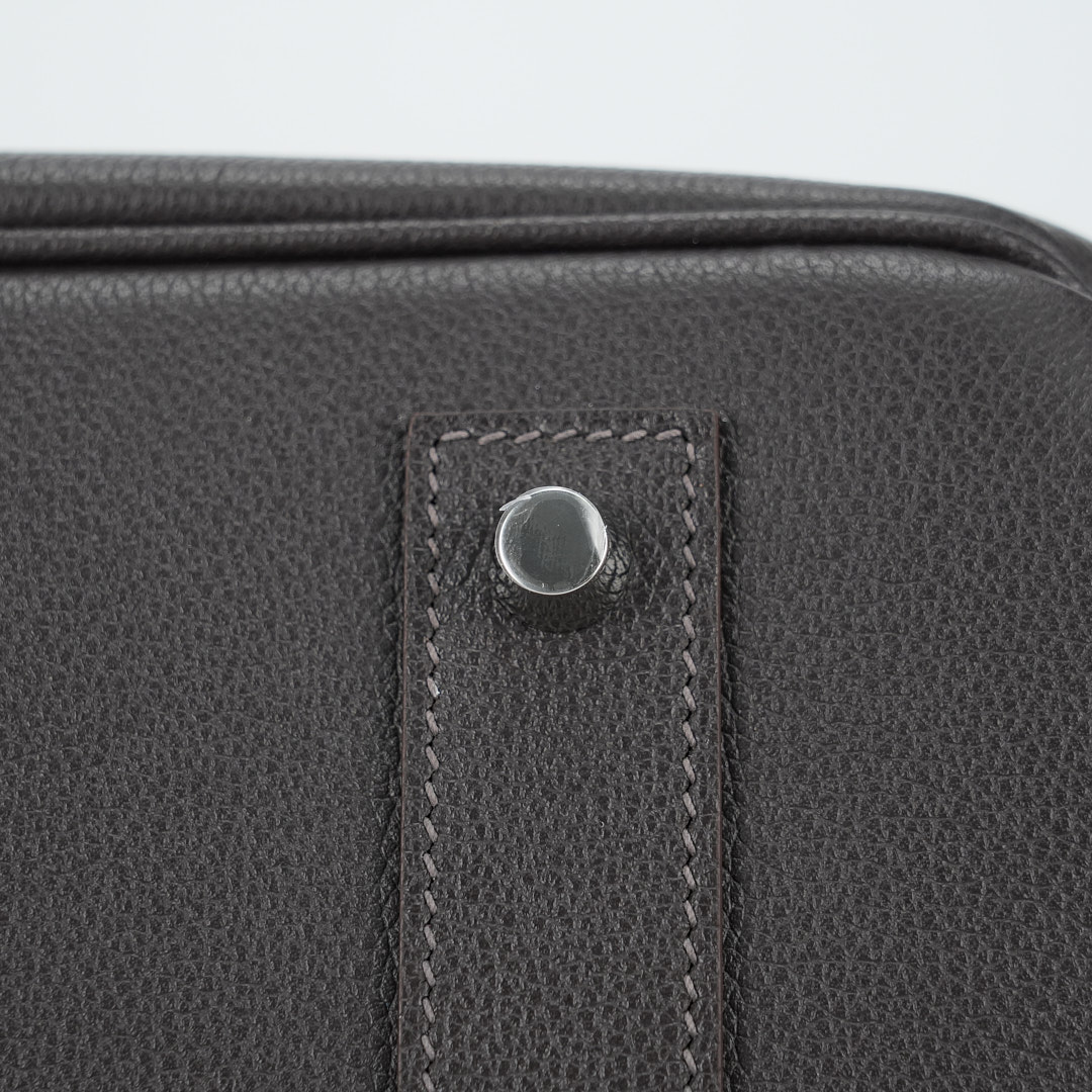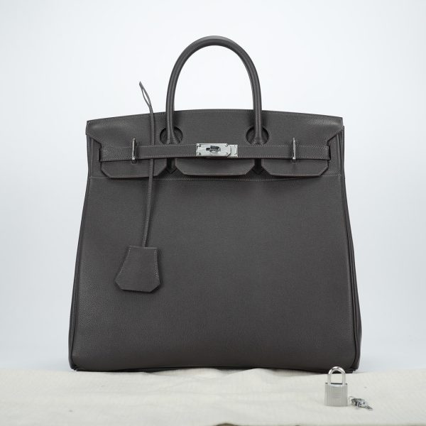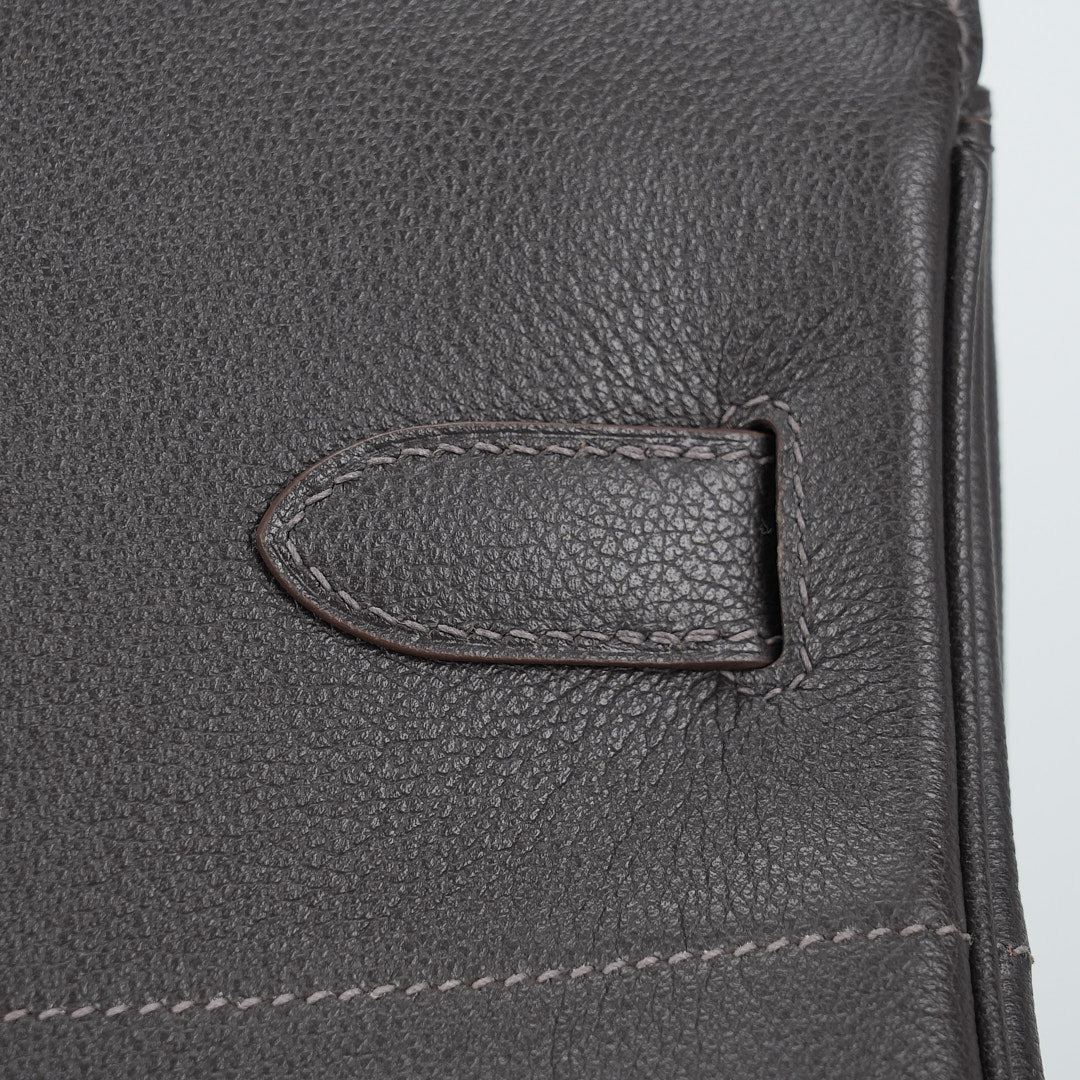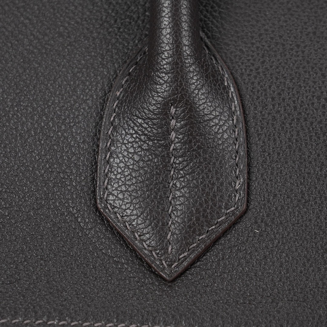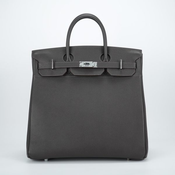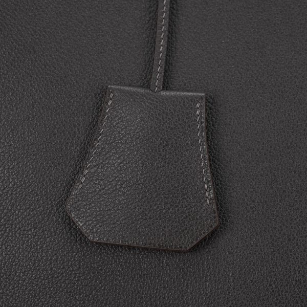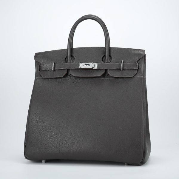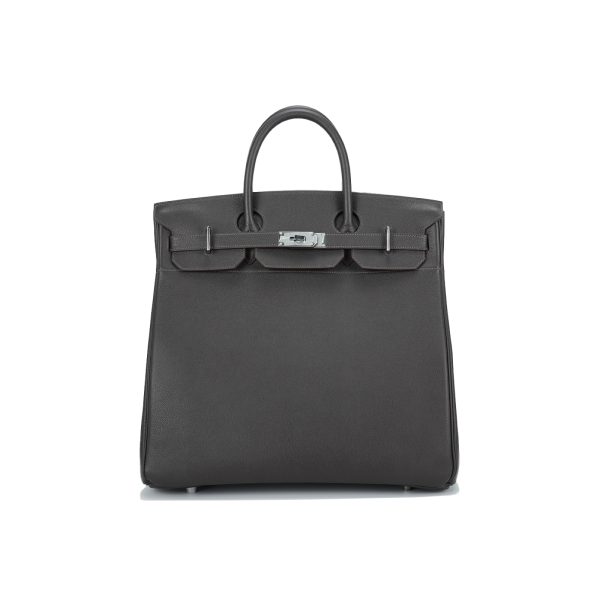 This is a Evergrain HAC BK 40 in Ebene. This spacious travel tote is crafted of fine Evergrain leather in burgundy with expansive sides and a durable reinforced base. The bag features rolled leather top handles and a cross over flap with straps and a palladium plated turn lock closure. This opens to a matte chèvre goatskin leather interior.