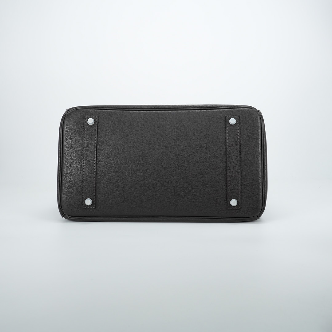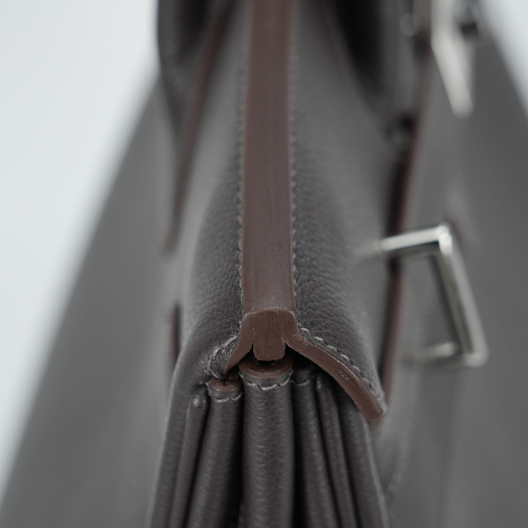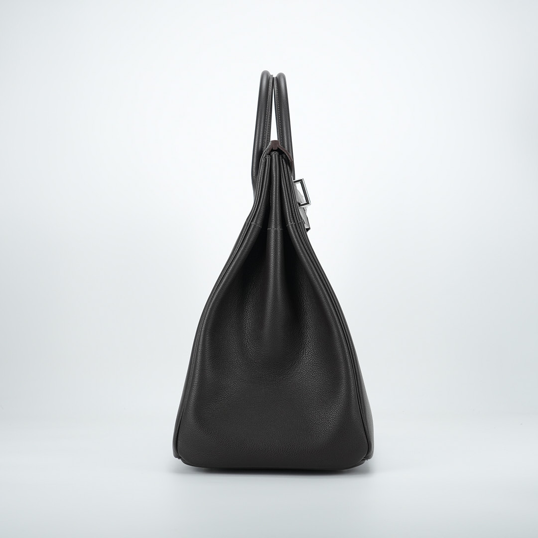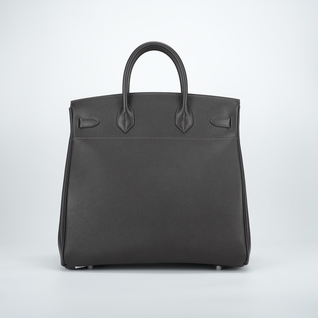 This is a Evergrain HAC BK 40 in Ebene. This spacious travel tote is crafted of fine Evergrain leather in burgundy with expansive sides and a durable reinforced base. The bag features rolled leather top handles and a cross over flap with straps and a palladium plated turn lock closure. This opens to a matte chèvre goatskin leather interior.