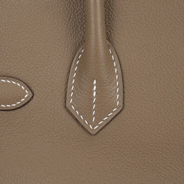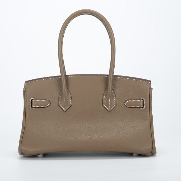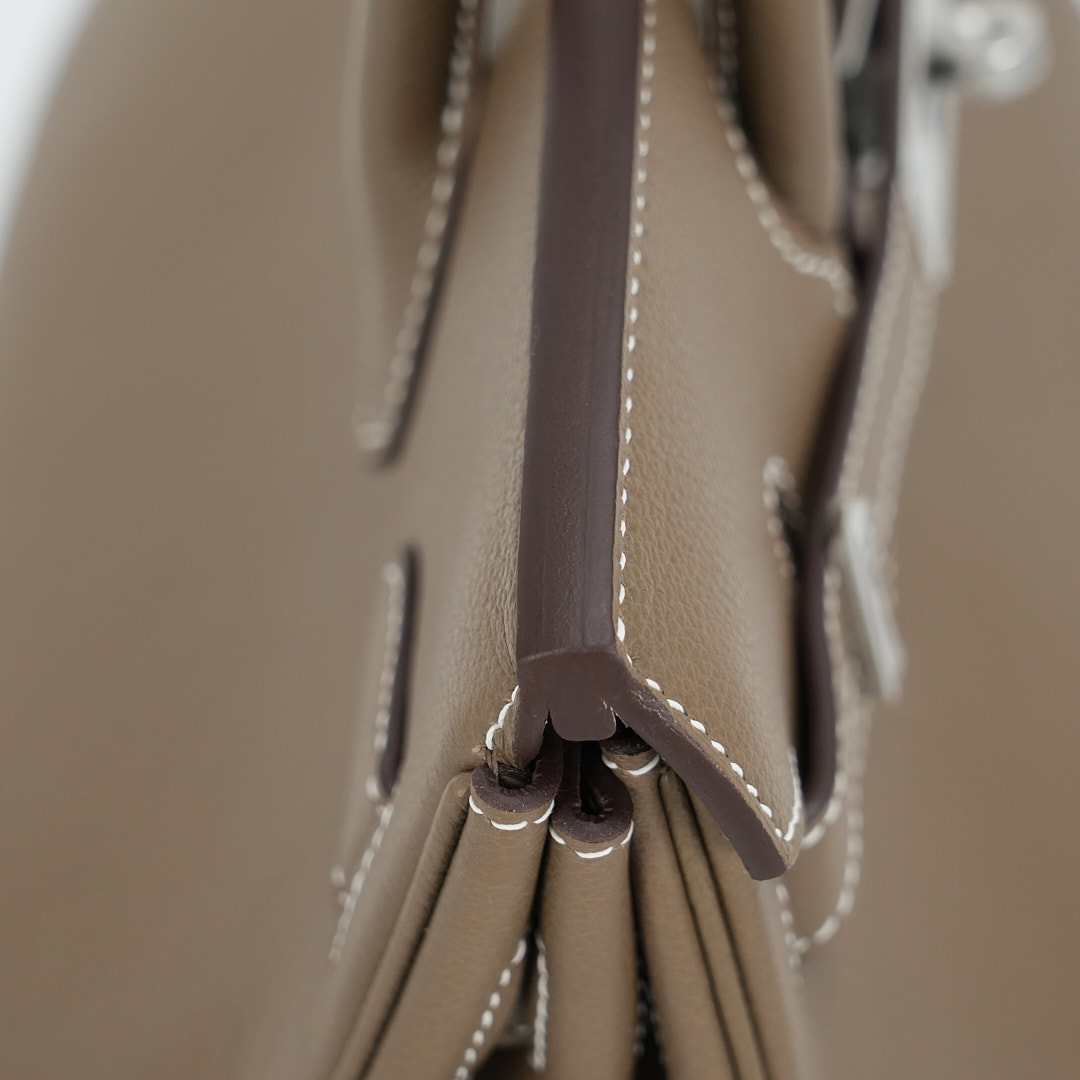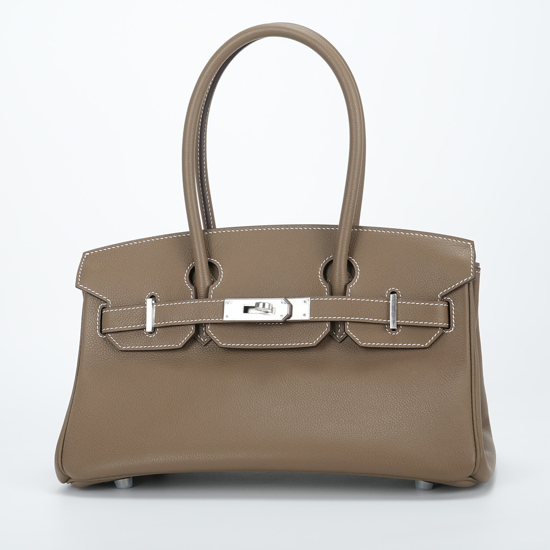 JPG Shoulder BK 29 in Etoupe. This stylish tote is crafted of Evecolor leather and features long rolled leather top handles for carrying at the shoulder, a front leather flap and palladium plated hardware including a squared plated silver turn lock. The flap opens to a matching leather interior with zipper and patch pockets.