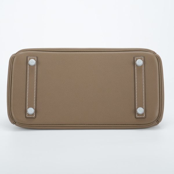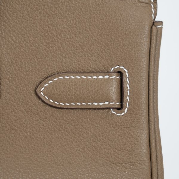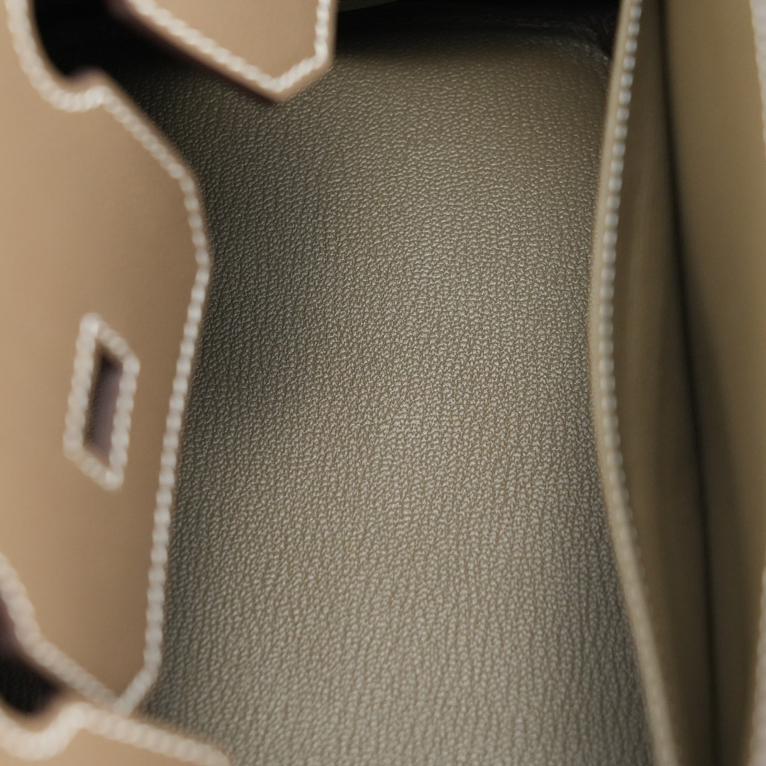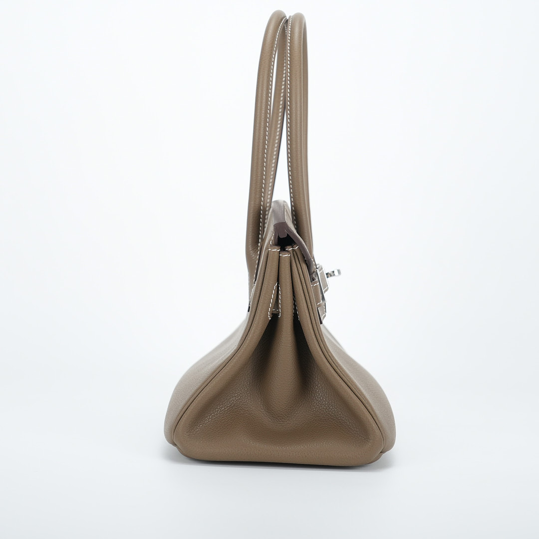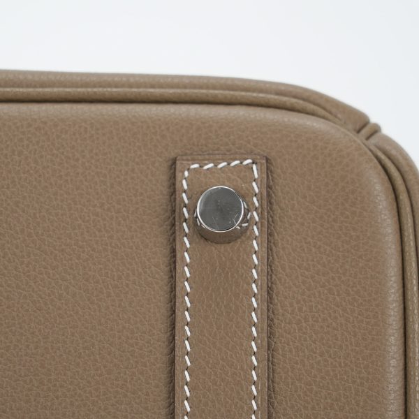 JPG Shoulder BK 29 in Etoupe. This stylish tote is crafted of Evecolor leather and features long rolled leather top handles for carrying at the shoulder, a front leather flap and palladium plated hardware including a squared plated silver turn lock. The flap opens to a matching leather interior with zipper and patch pockets.
