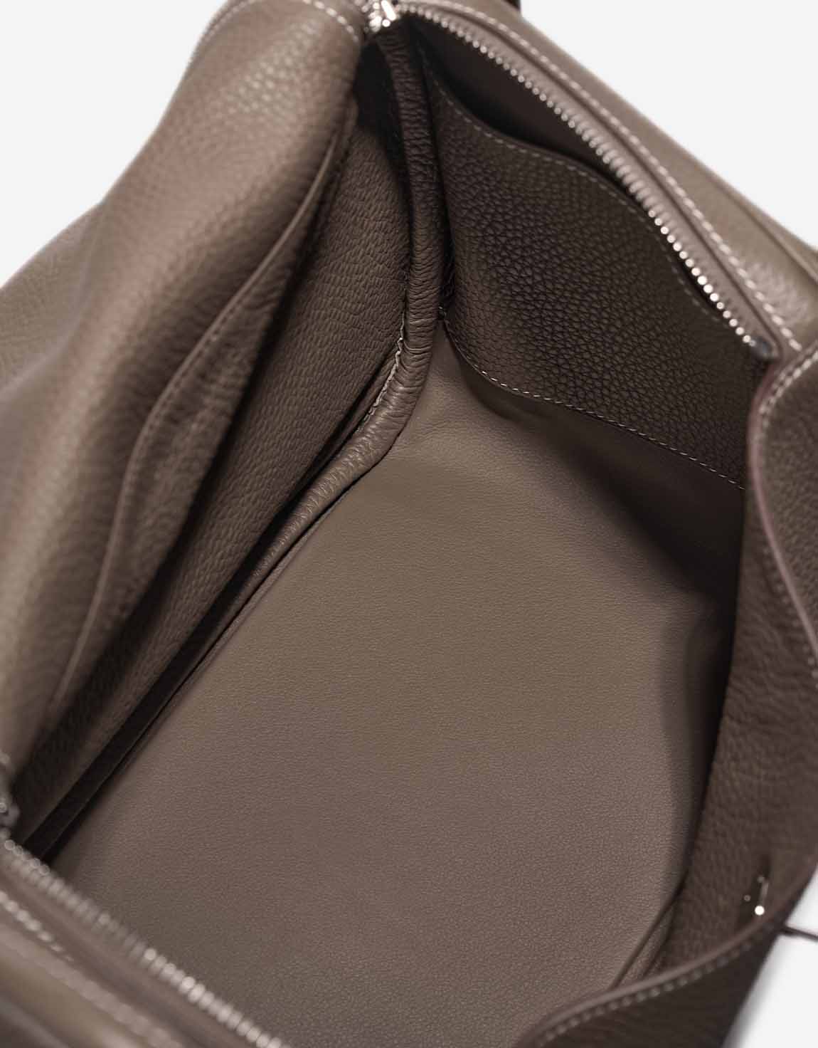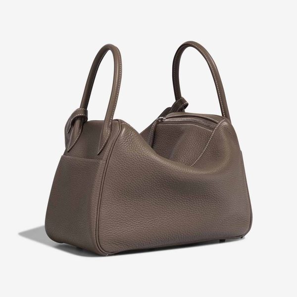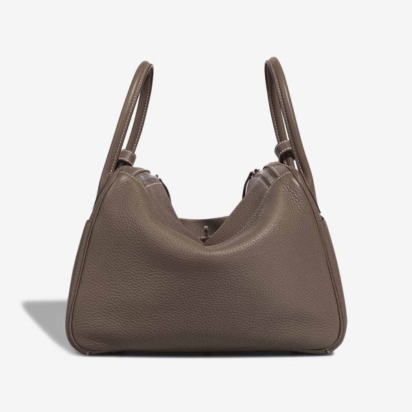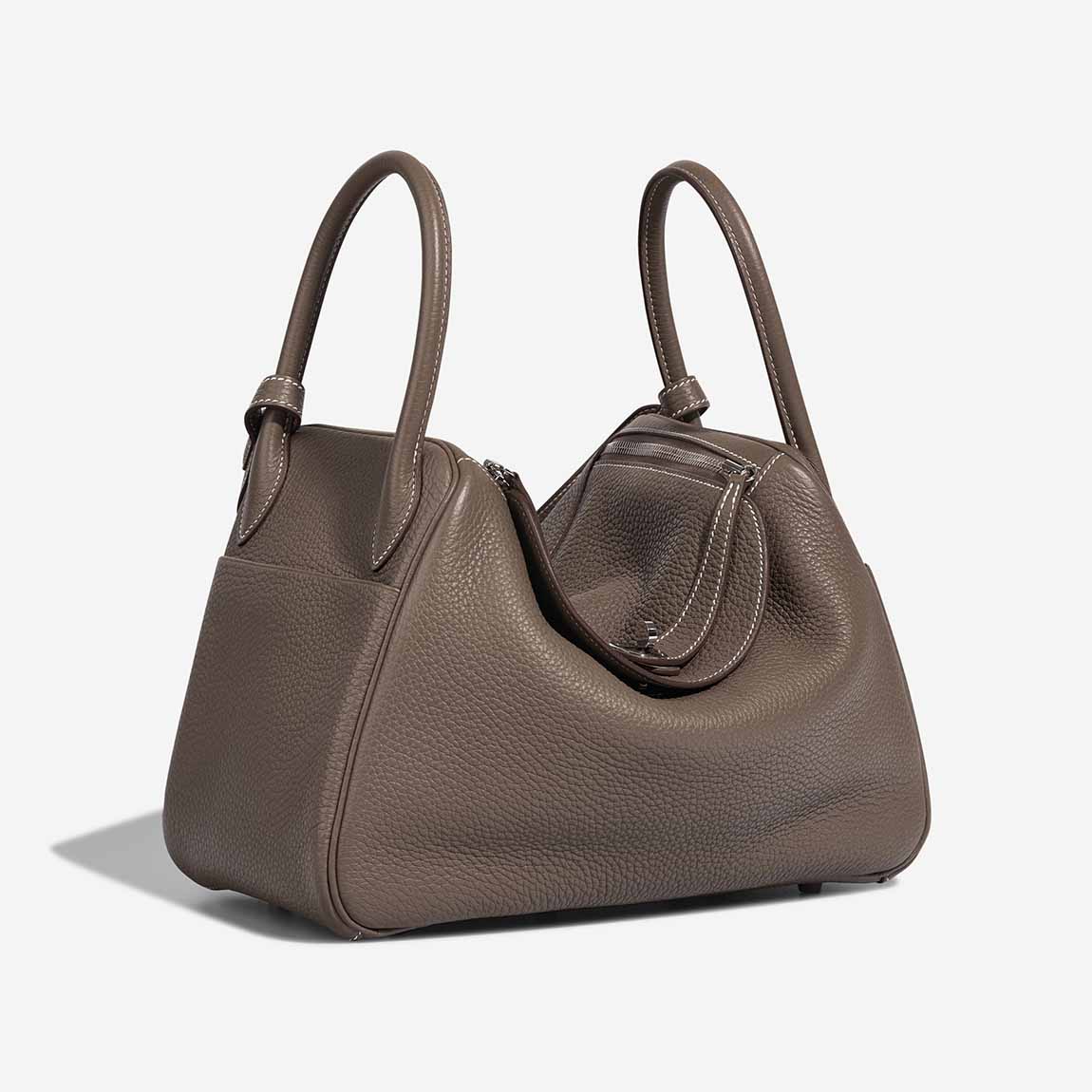 Lind 30 handmade from Clemence leather in Etoupe. The design features two side handles and palladium hardware. You can carry it as a crossbody by using the shoulder strap.