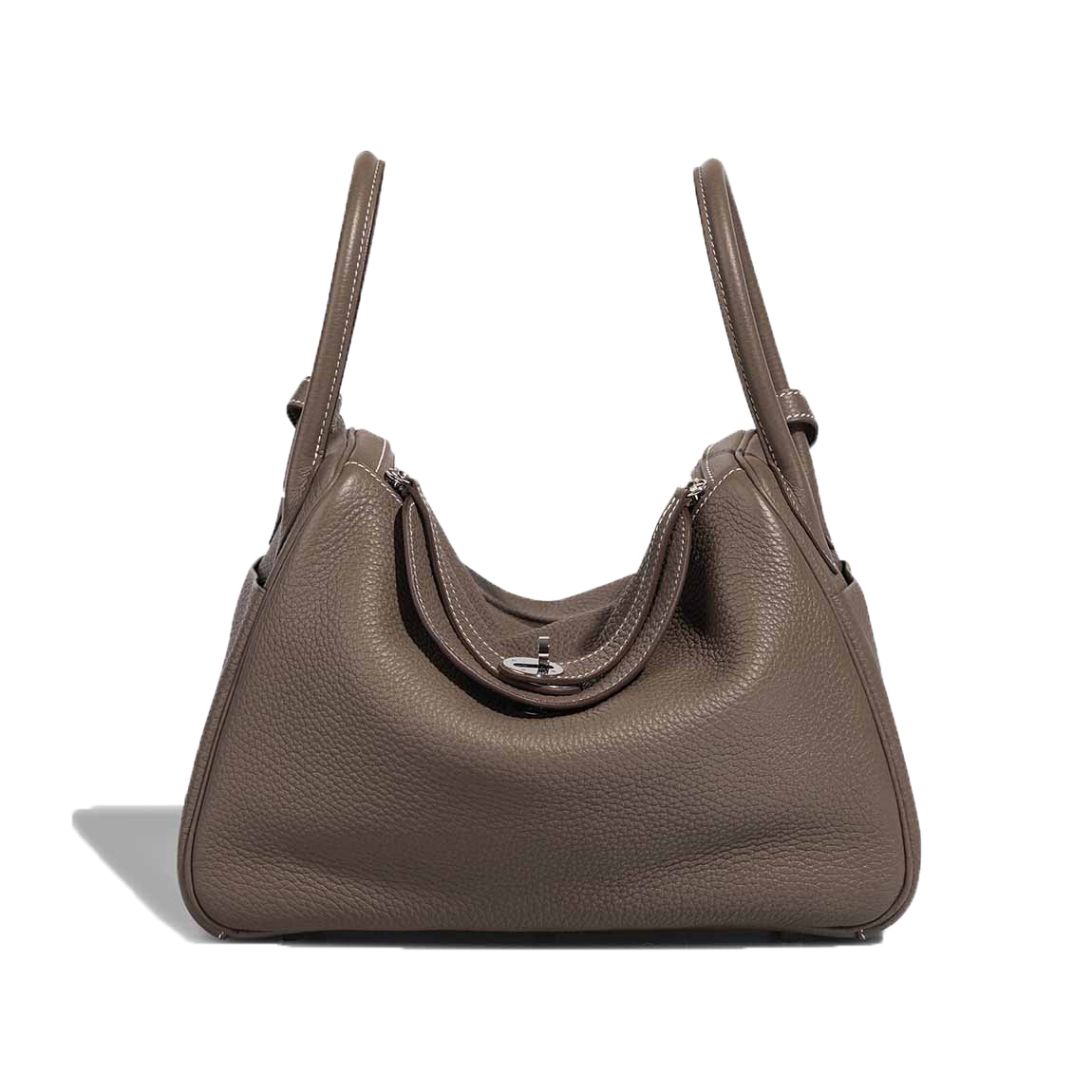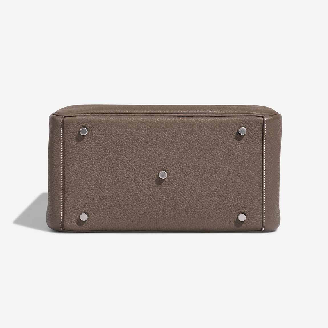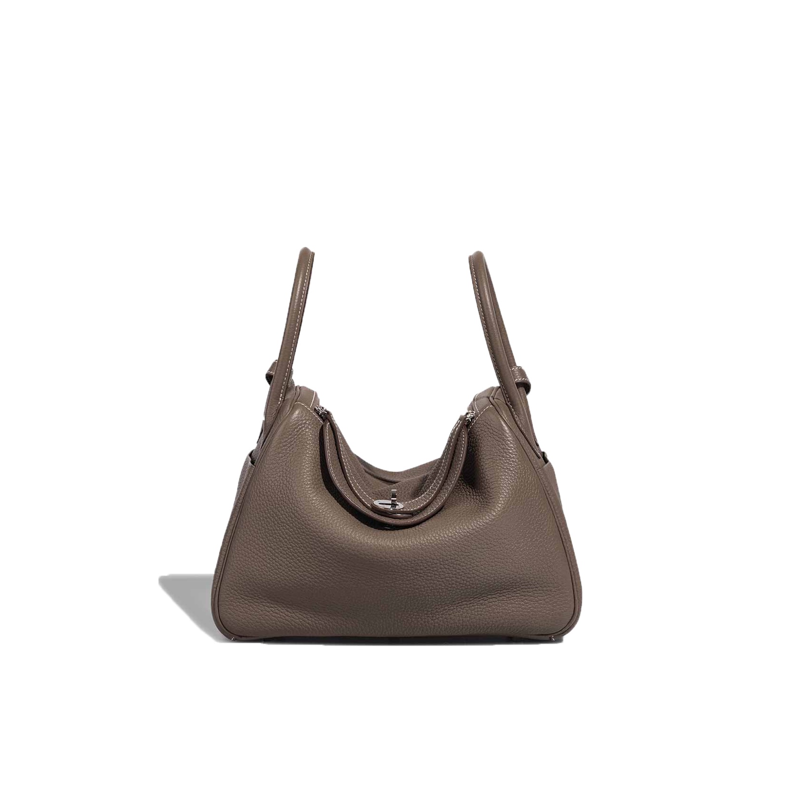 Lind 30 handmade from Clemence leather in Etoupe. The design features two side handles and palladium hardware. You can carry it as a crossbody by using the shoulder strap.