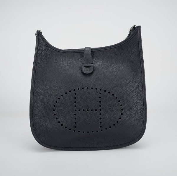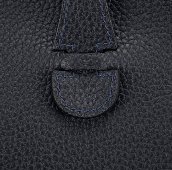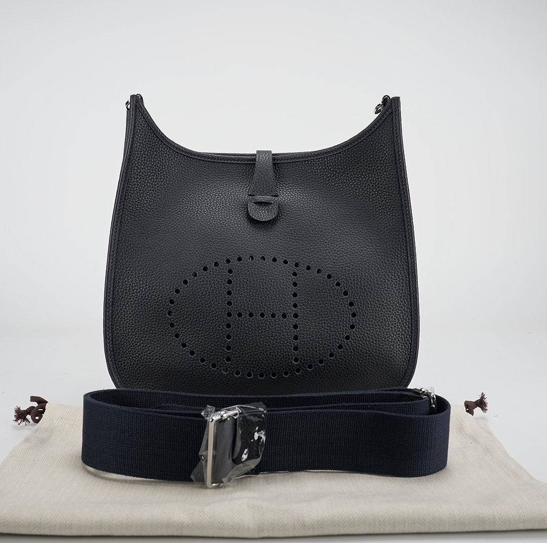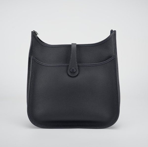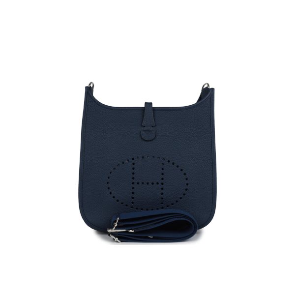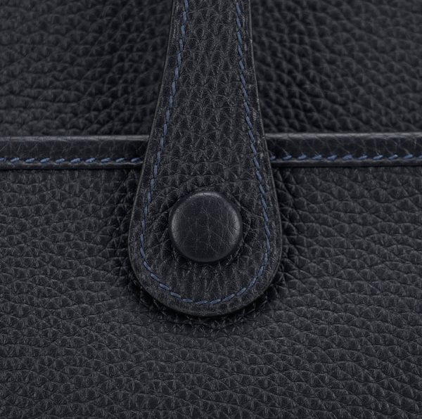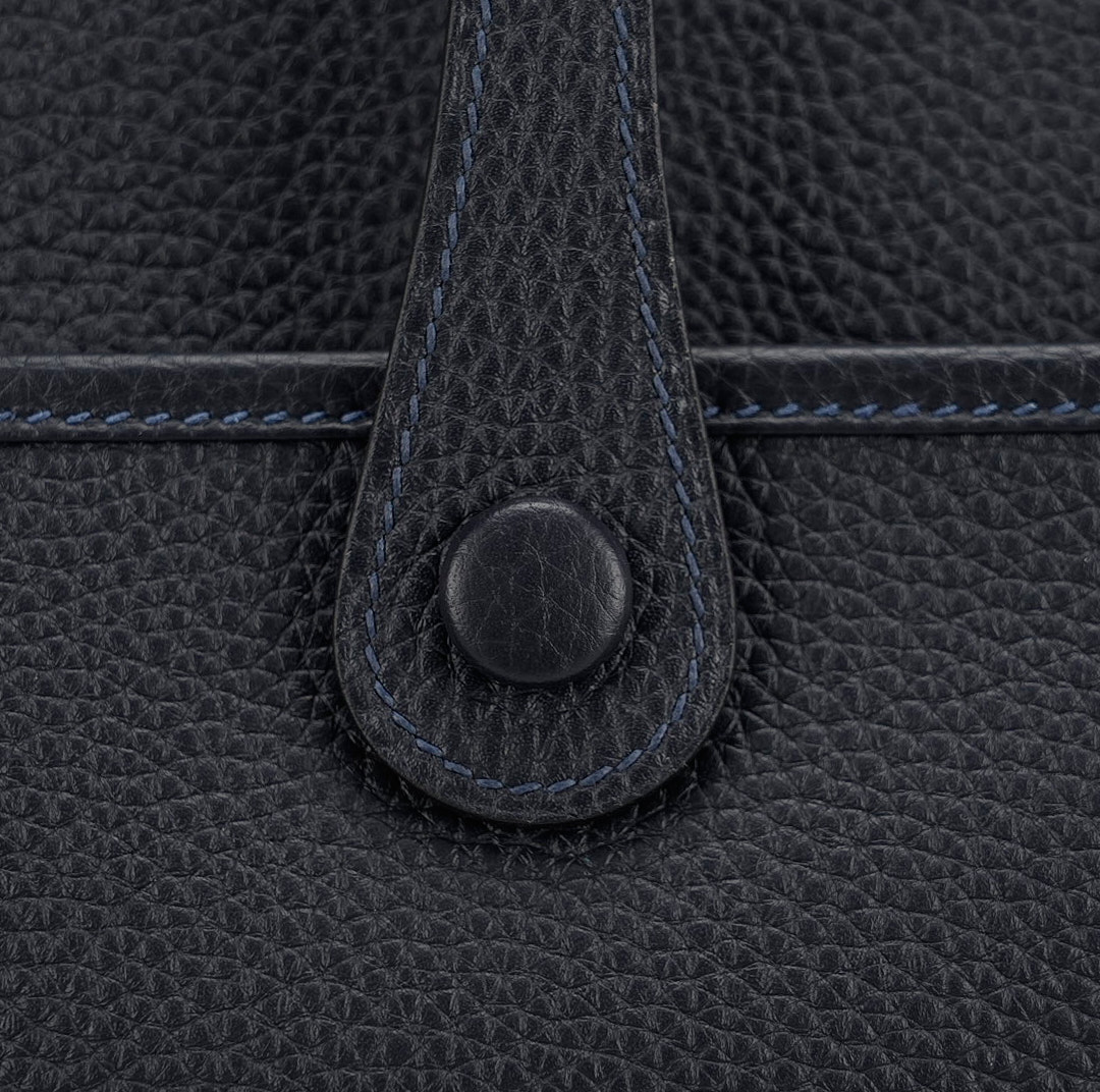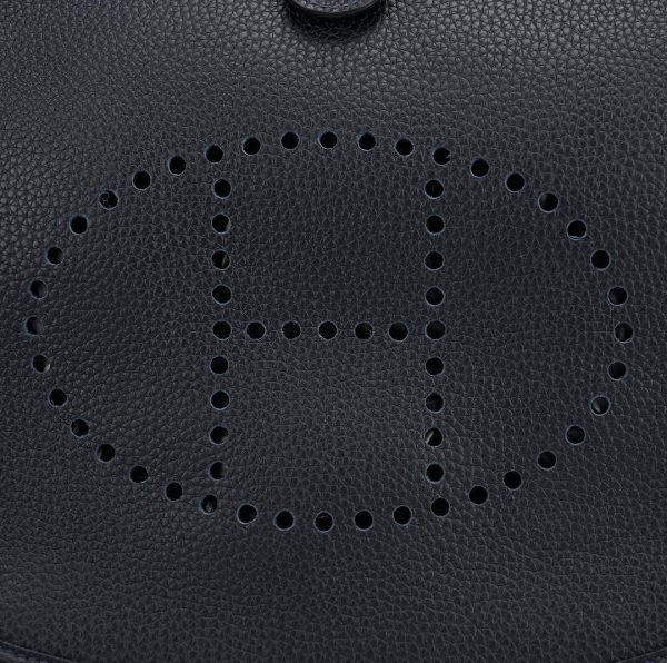 This Evelyne is in Bleu de Prusse clemence leather with palladium hardware, featuring tonal stitching, large perforated H in circle (front), pull tab top snap closure and removable Bleu De Prusse shoulder/crossbody strap, with exterior back pocket.