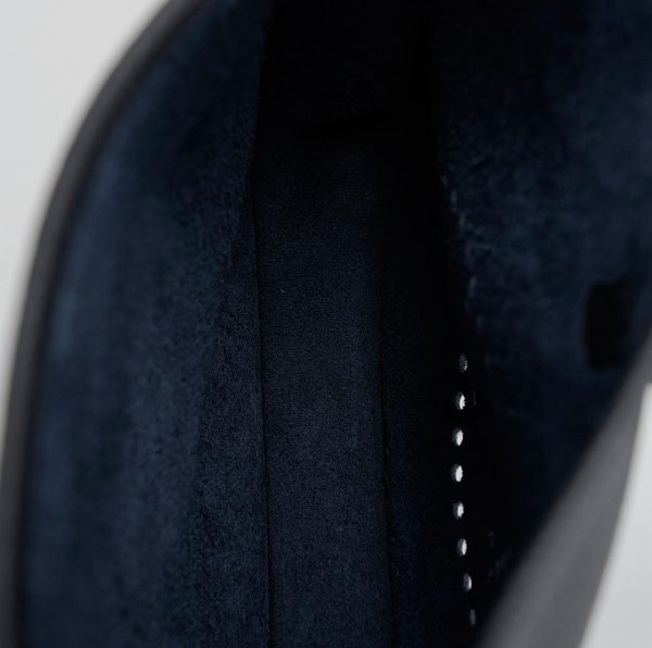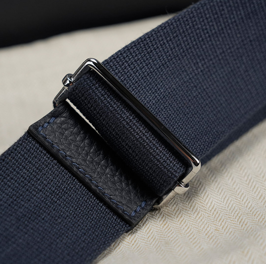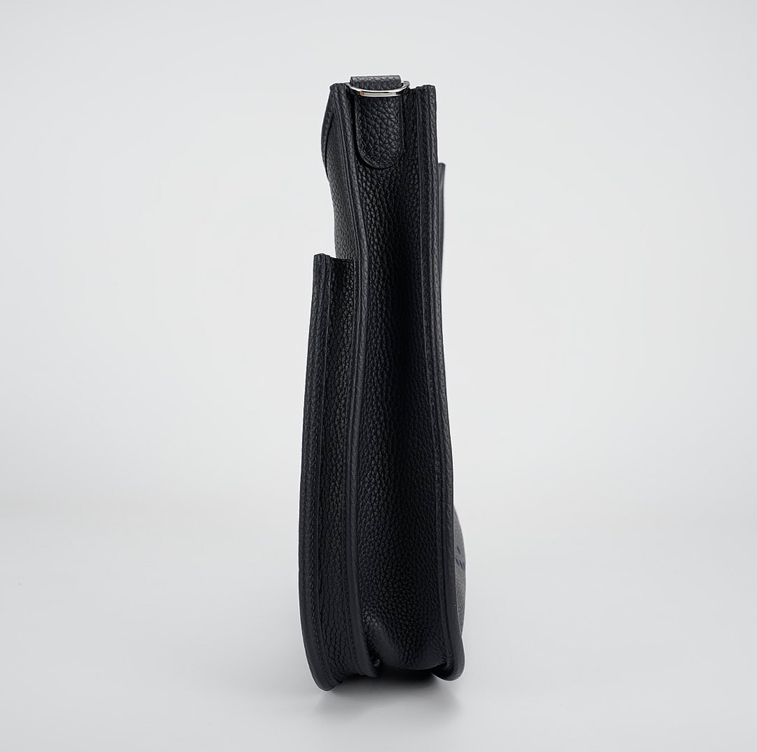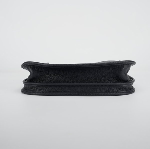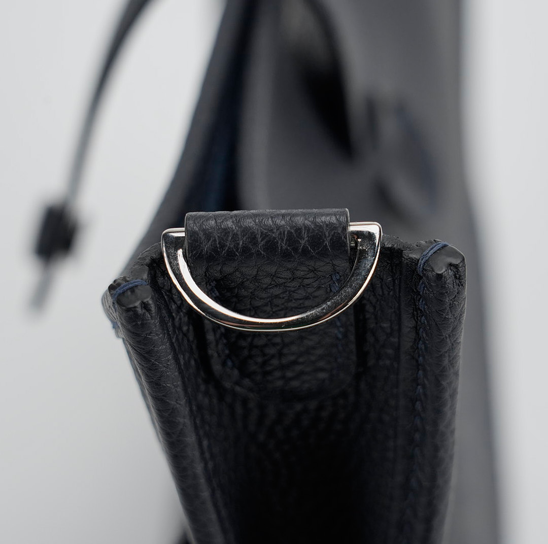 This Evelyne is in Bleu de Prusse clemence leather with palladium hardware, featuring tonal stitching, large perforated H in circle (front), pull tab top snap closure and removable Bleu De Prusse shoulder/crossbody strap, with exterior back pocket.