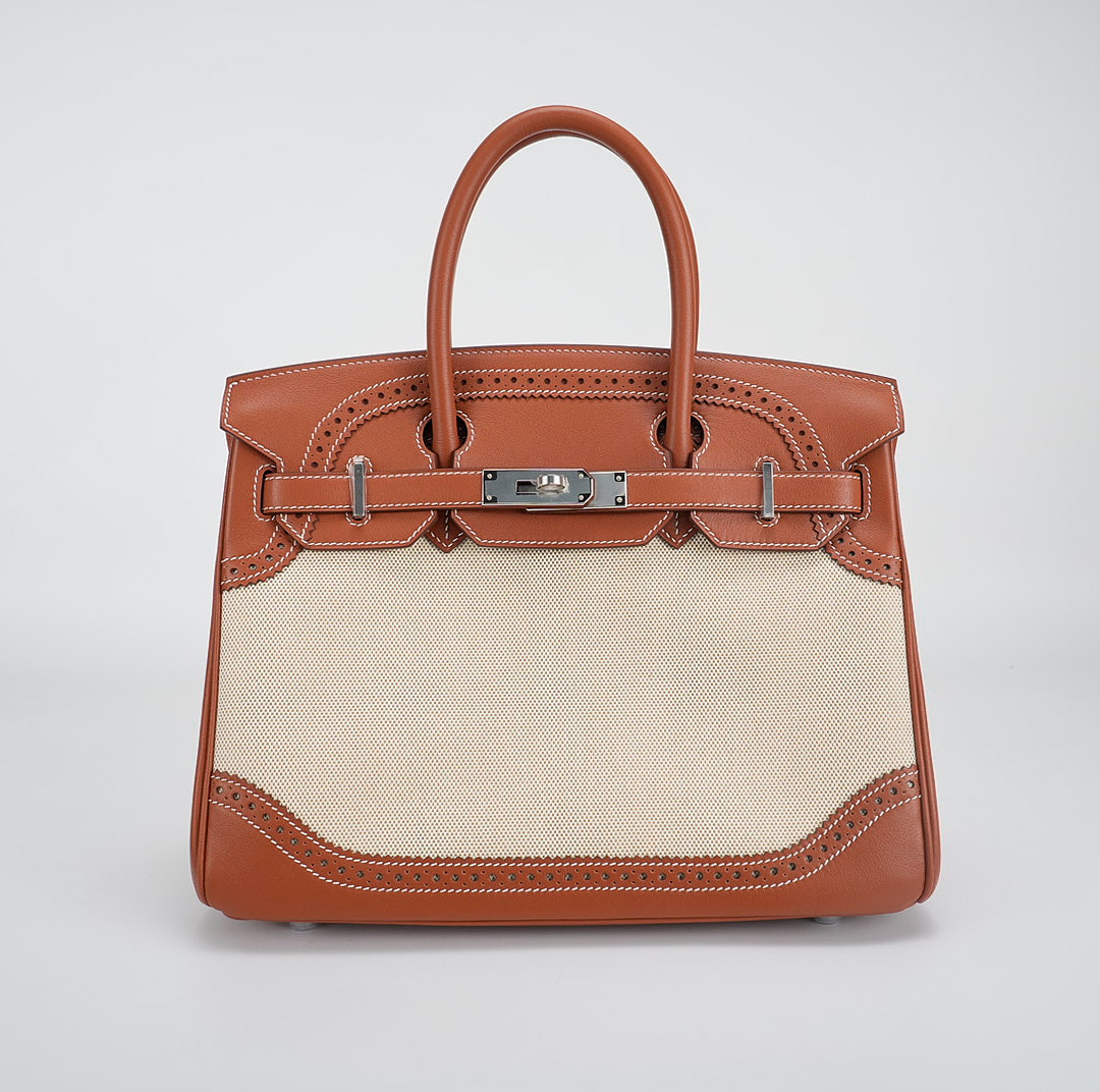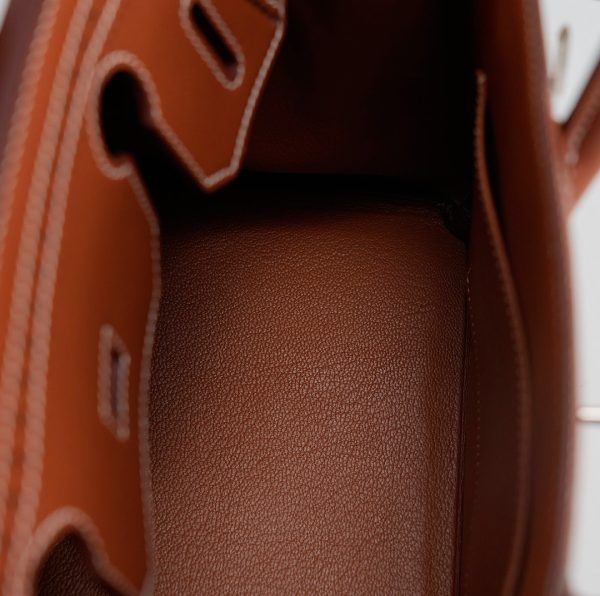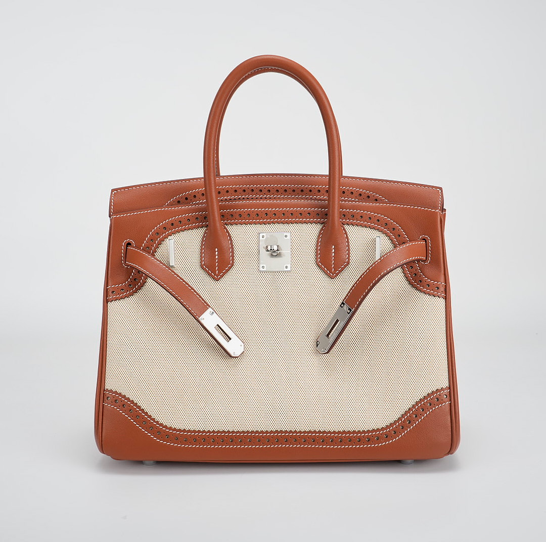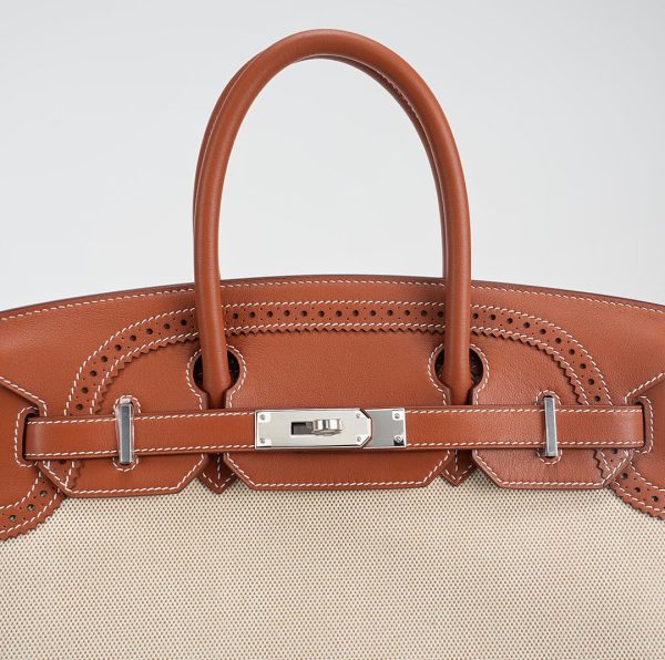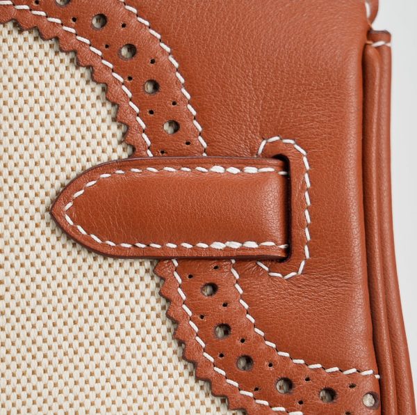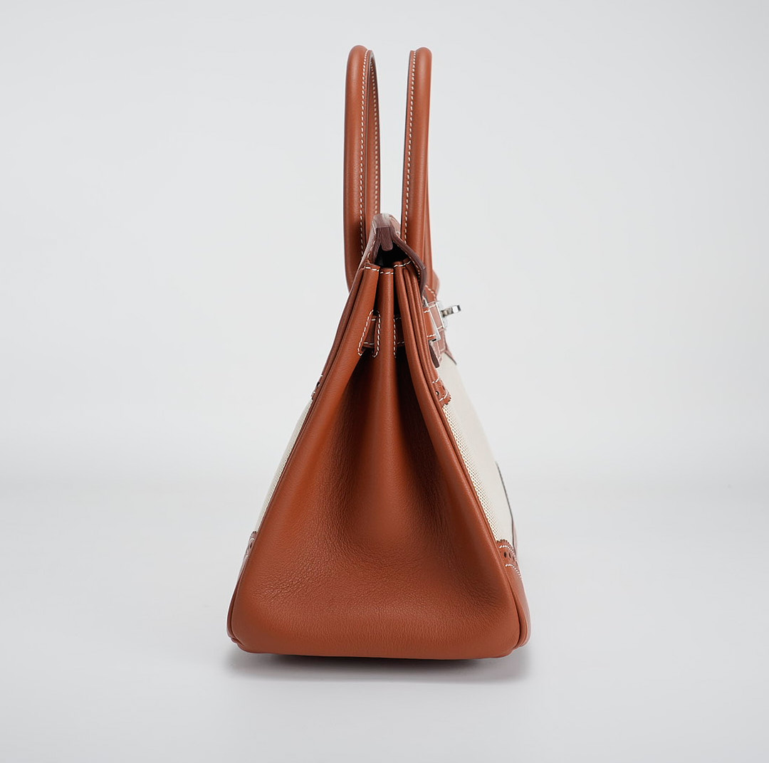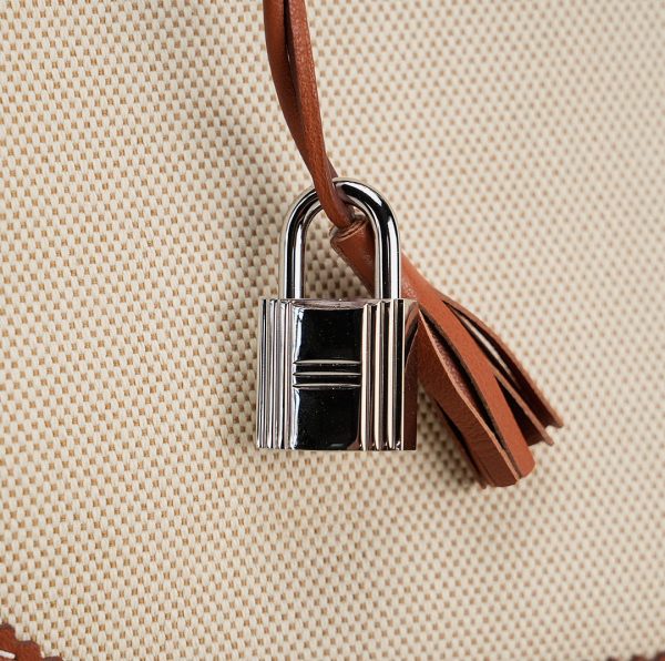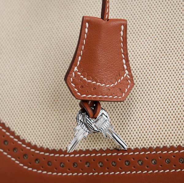 This BK is in Fauve Swift and Toile H with palladium hardware and has contrast stitching, front flap, two straps with center toggle closure, clochette with lock and two keys, and double rolled handles.