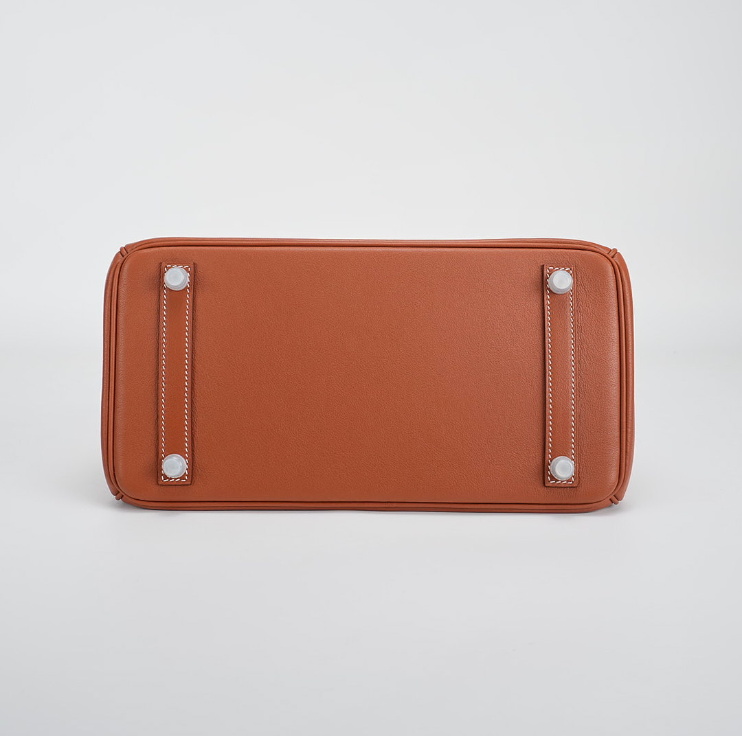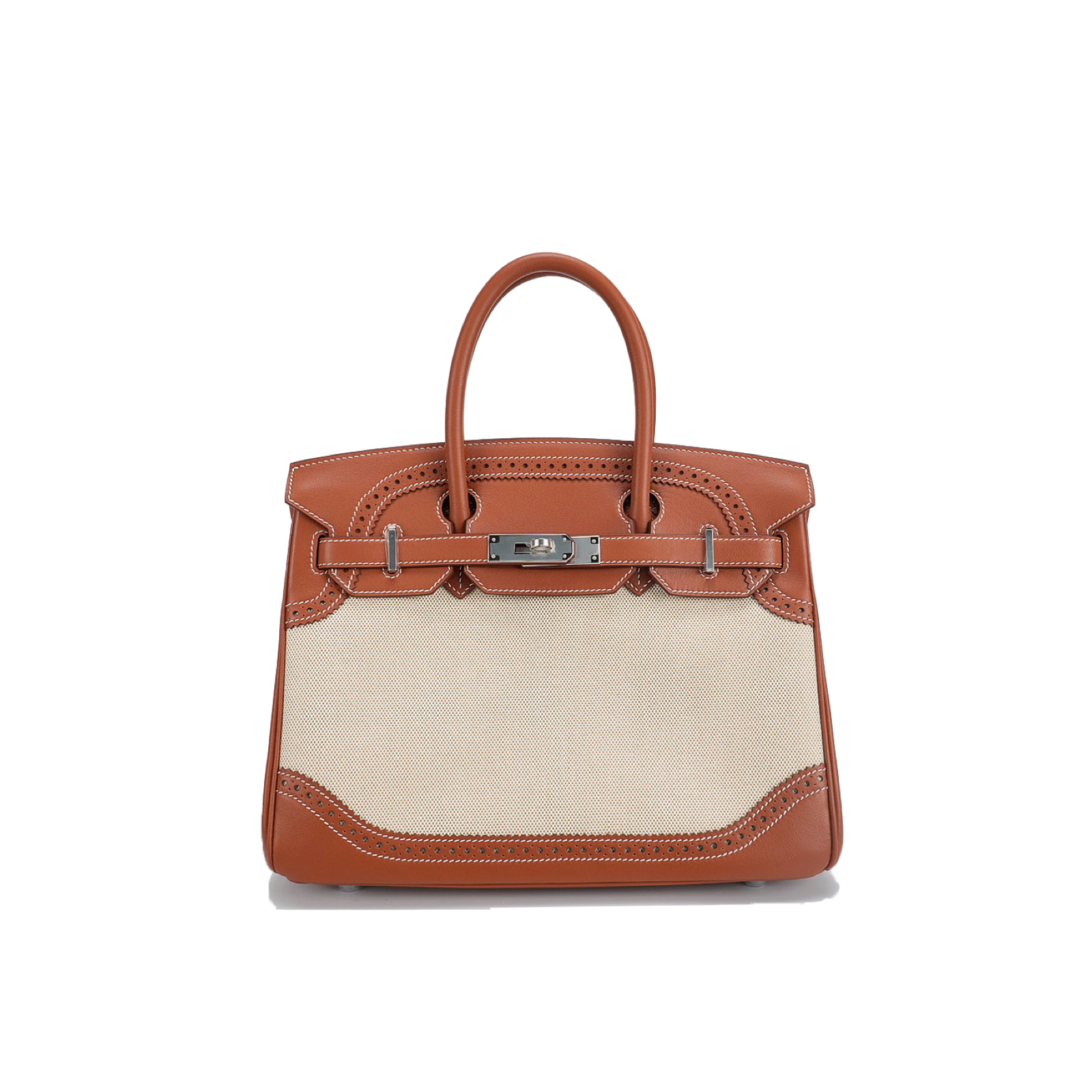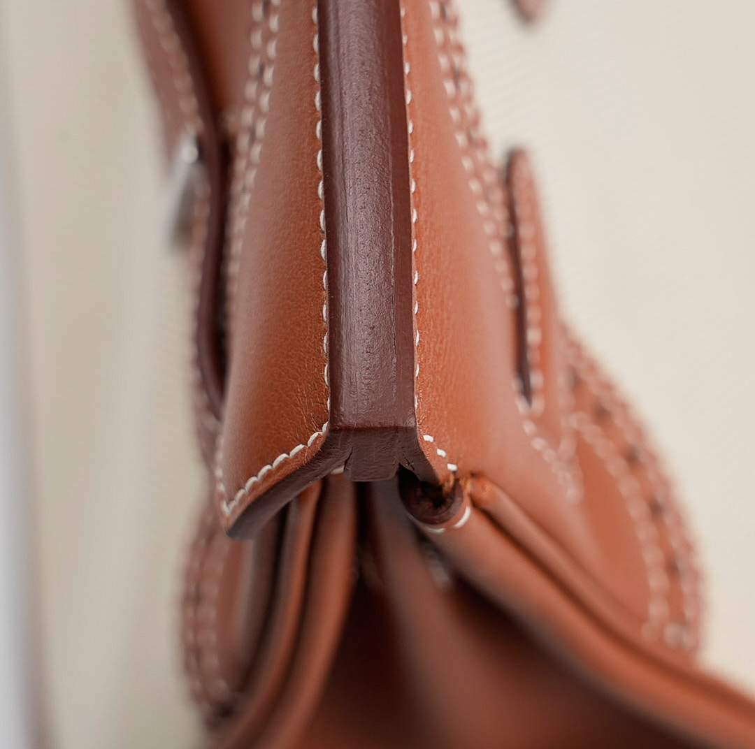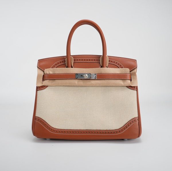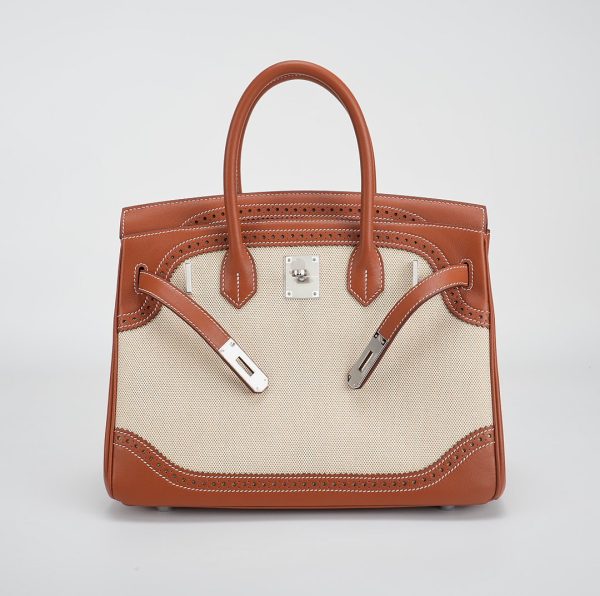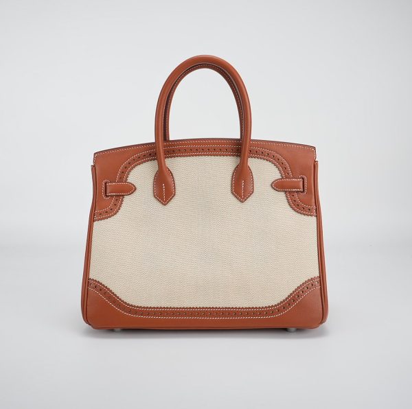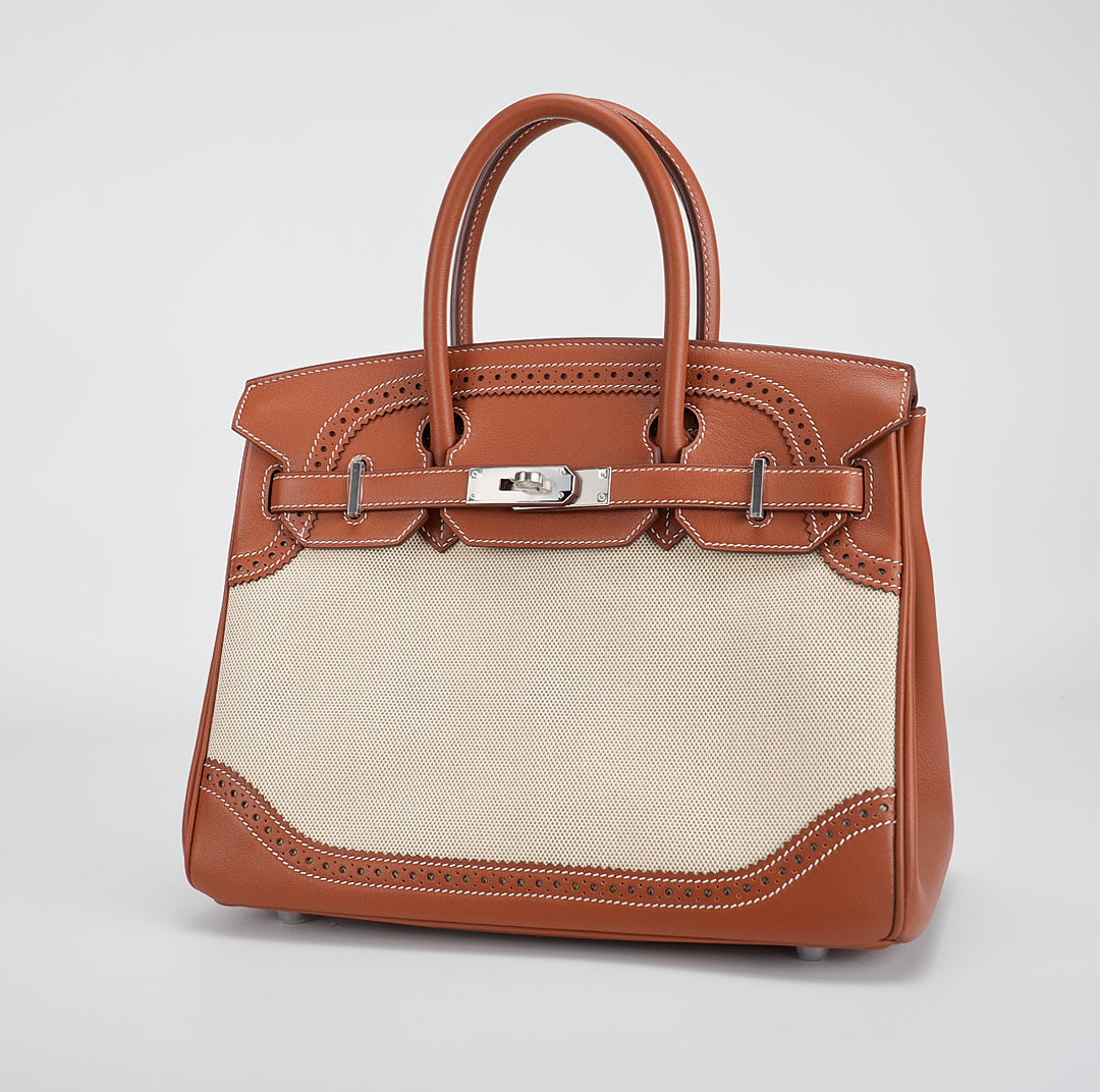 This BK is in Fauve Swift and Toile H with palladium hardware and has contrast stitching, front flap, two straps with center toggle closure, clochette with lock and two keys, and double rolled handles.