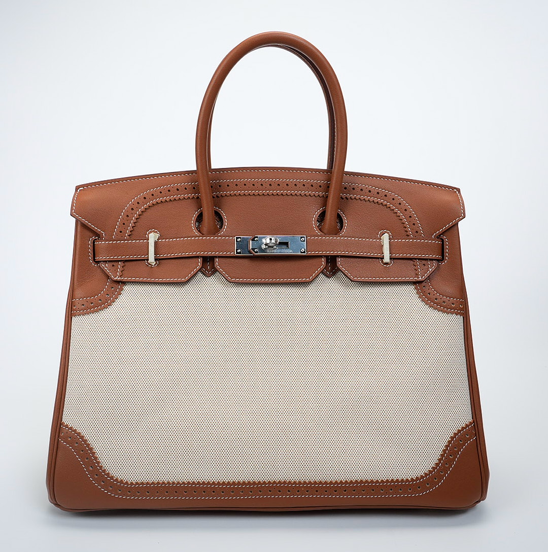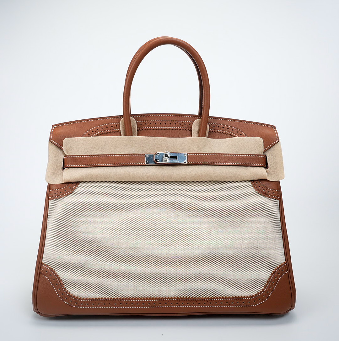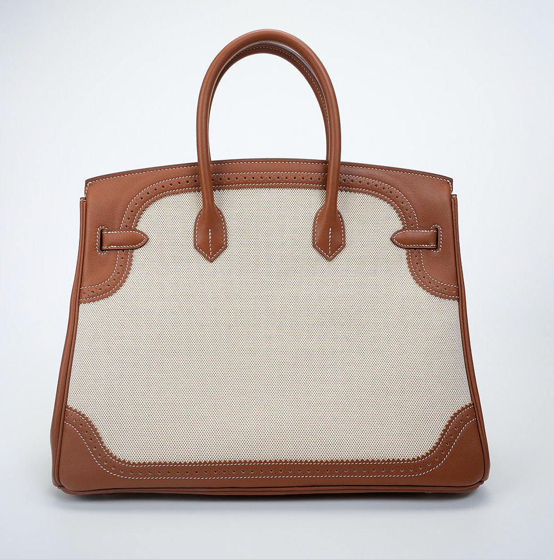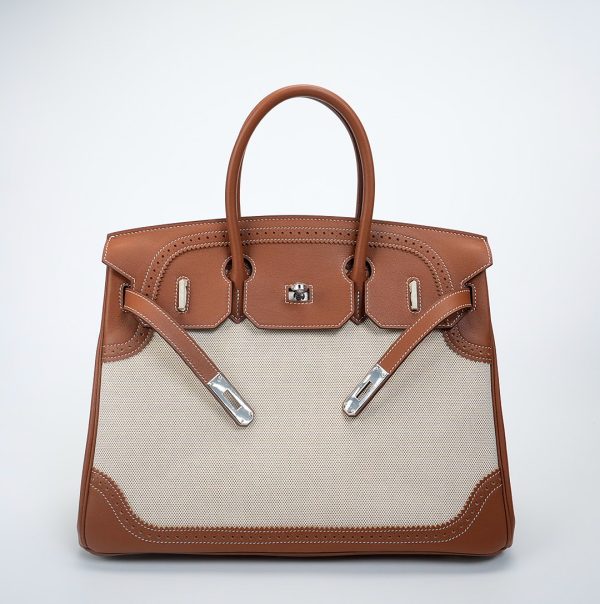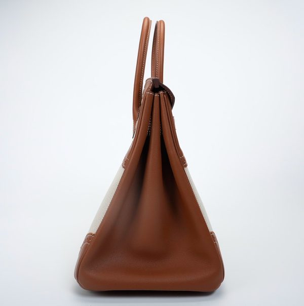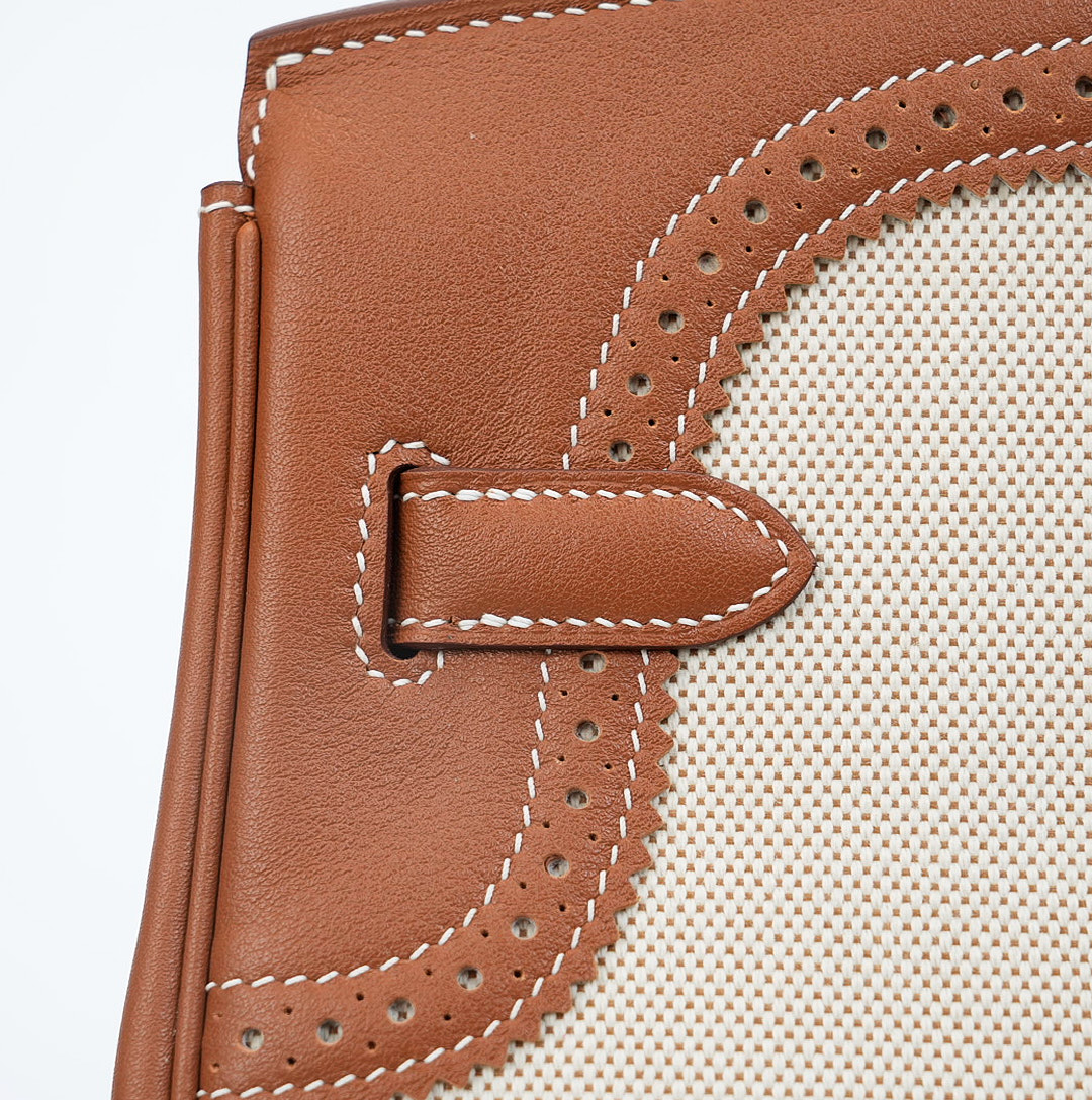 This BK is in Fauve Swift and Toile H with palladium hardware and has contrast stitching, front flap, two straps with center toggle closure, clochette with lock and two keys, and double rolled handles.