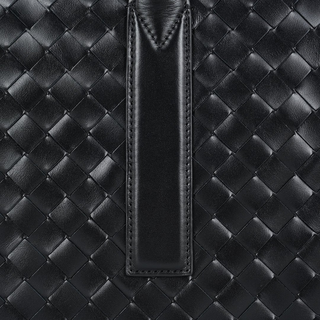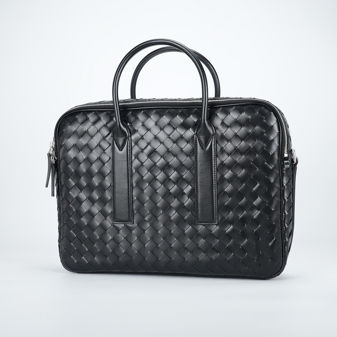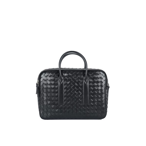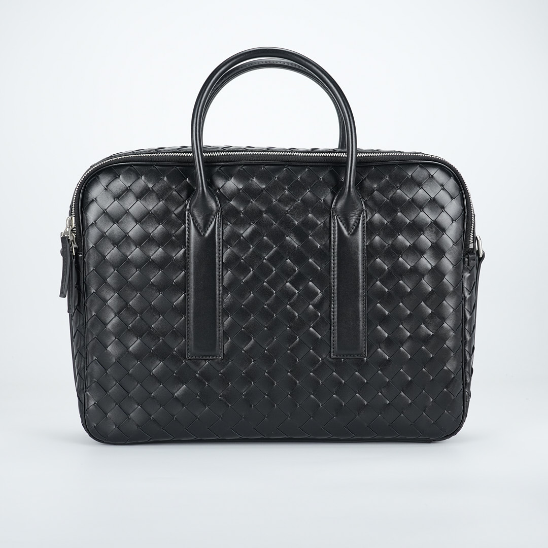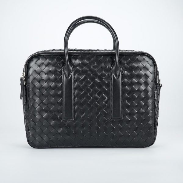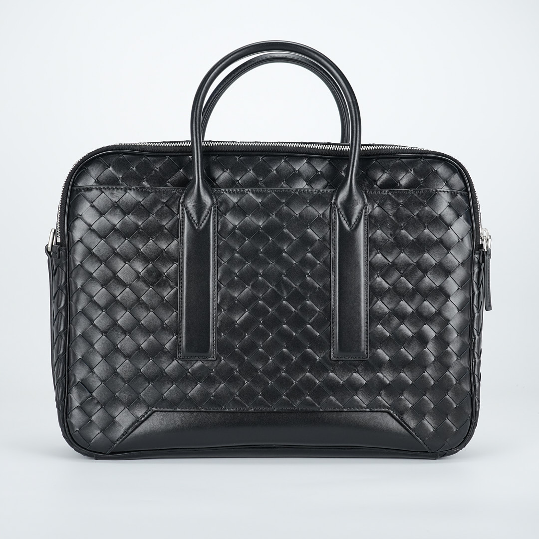 Briefcase in soft Intrecciato leather with adjustable strap and signature knot detail. Metallic knot detail on leather strap. Padded laptop compartment and one zipped pocket.