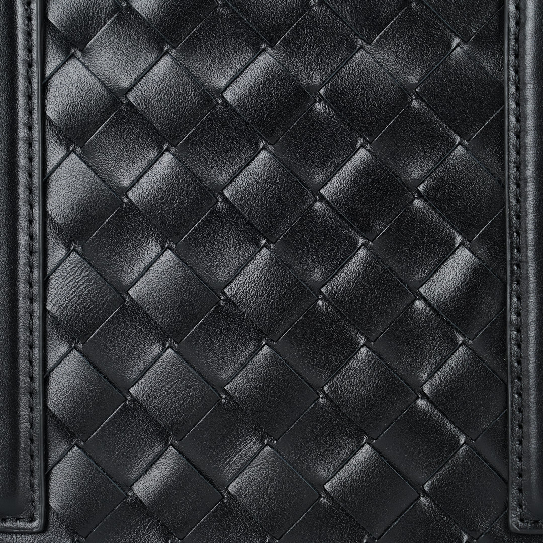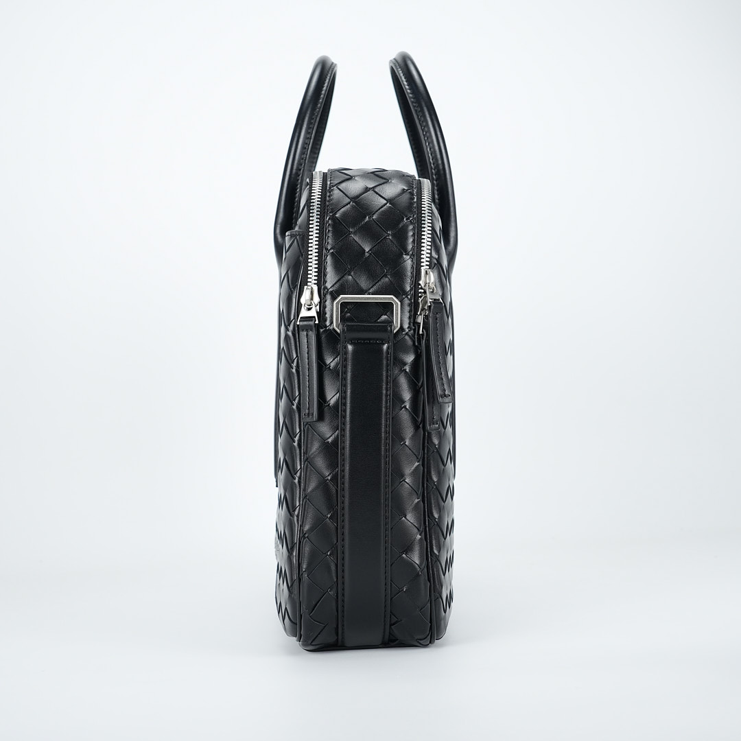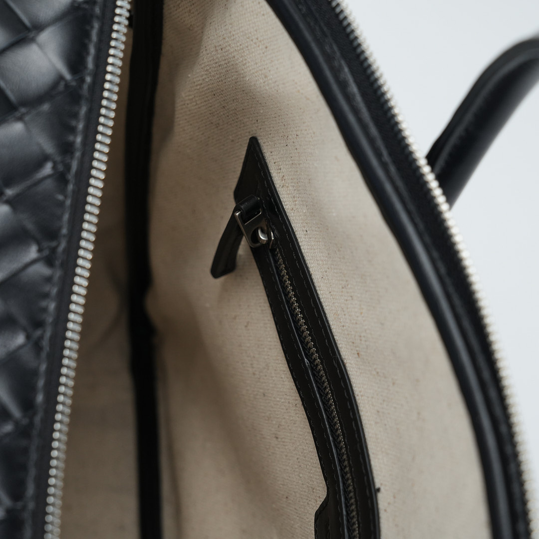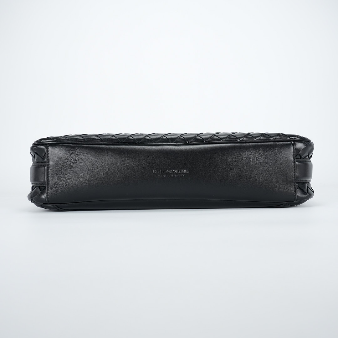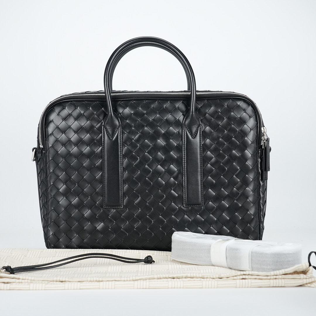 Briefcase in soft Intrecciato leather with adjustable strap and signature knot detail. Metallic knot detail on leather strap. Padded laptop compartment and one zipped pocket.
