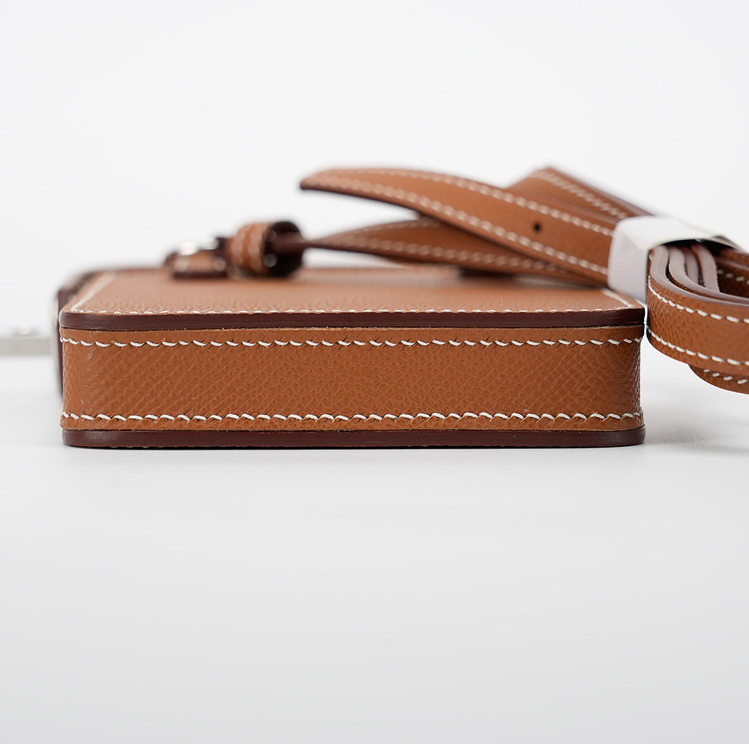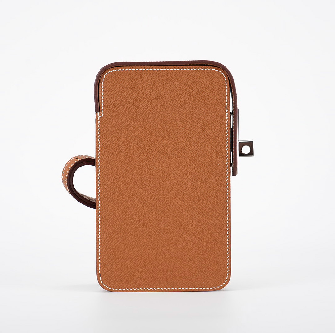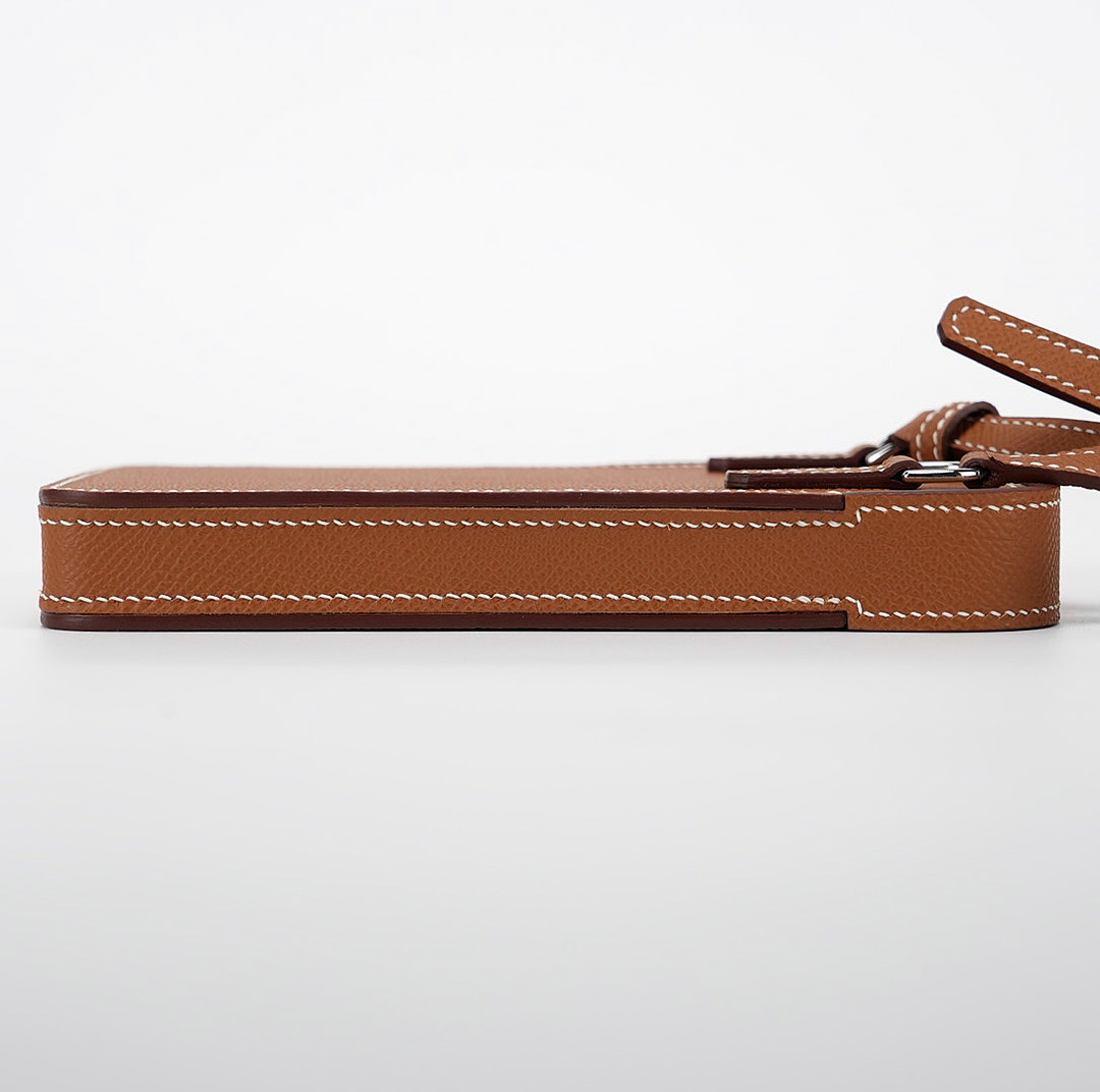 This hard leather phone case draws inspiration from the Haut a courroies bag with the front belt-closure. Straps and a turn clasp are revisited in a side closure format, designed to secure your essentials: your phone and a credit card. The pouch juxtaposes the expertise of leather work with metal details. An accessory that keeps with the spirit of the times, it allows for hands-free carry thanks to its adjustable shoulder strap.