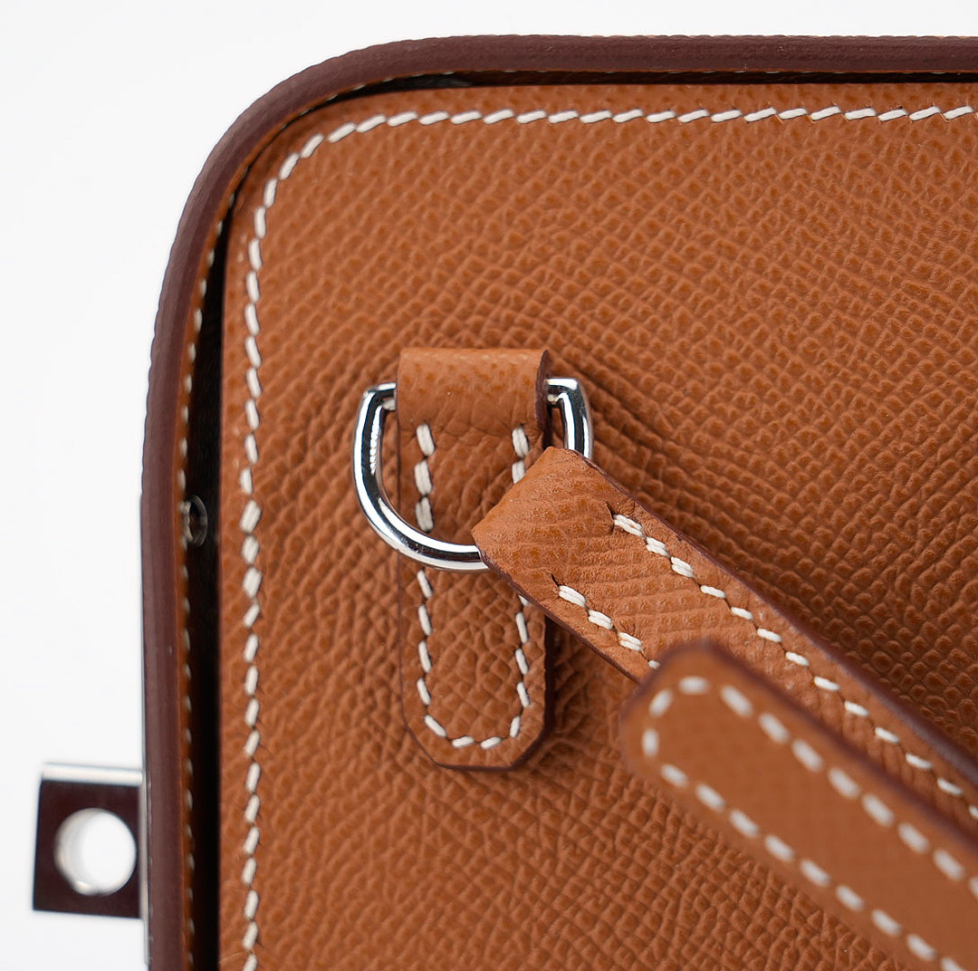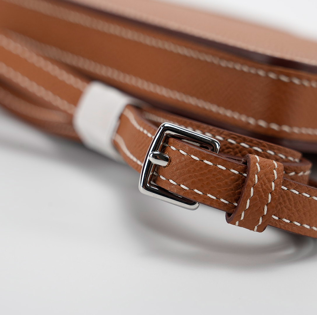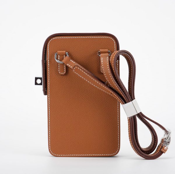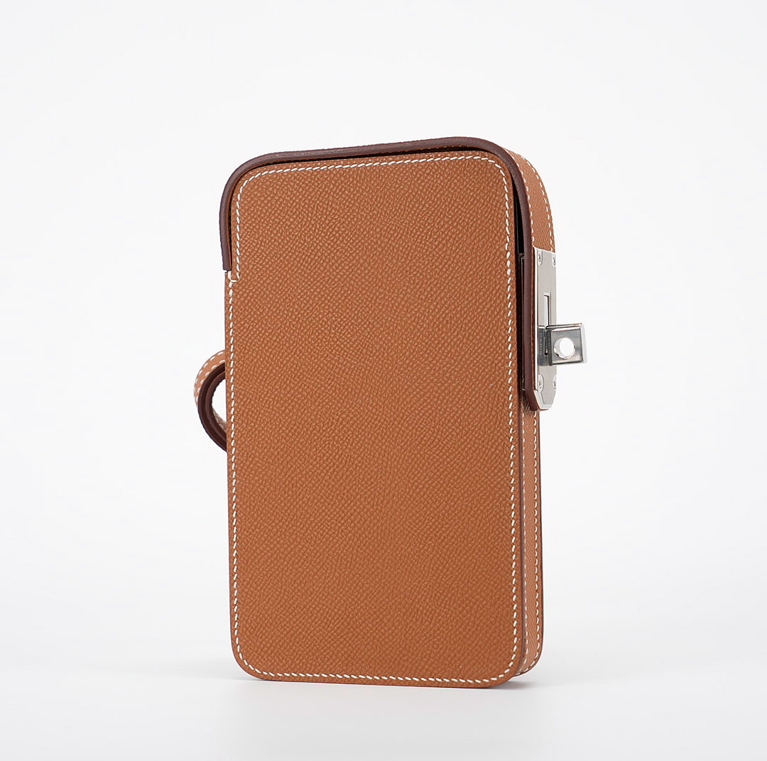 This hard leather phone case draws inspiration from the Haut a courroies bag with the front belt-closure. Straps and a turn clasp are revisited in a side closure format, designed to secure your essentials: your phone and a credit card. The pouch juxtaposes the expertise of leather work with metal details. An accessory that keeps with the spirit of the times, it allows for hands-free carry thanks to its adjustable shoulder strap.