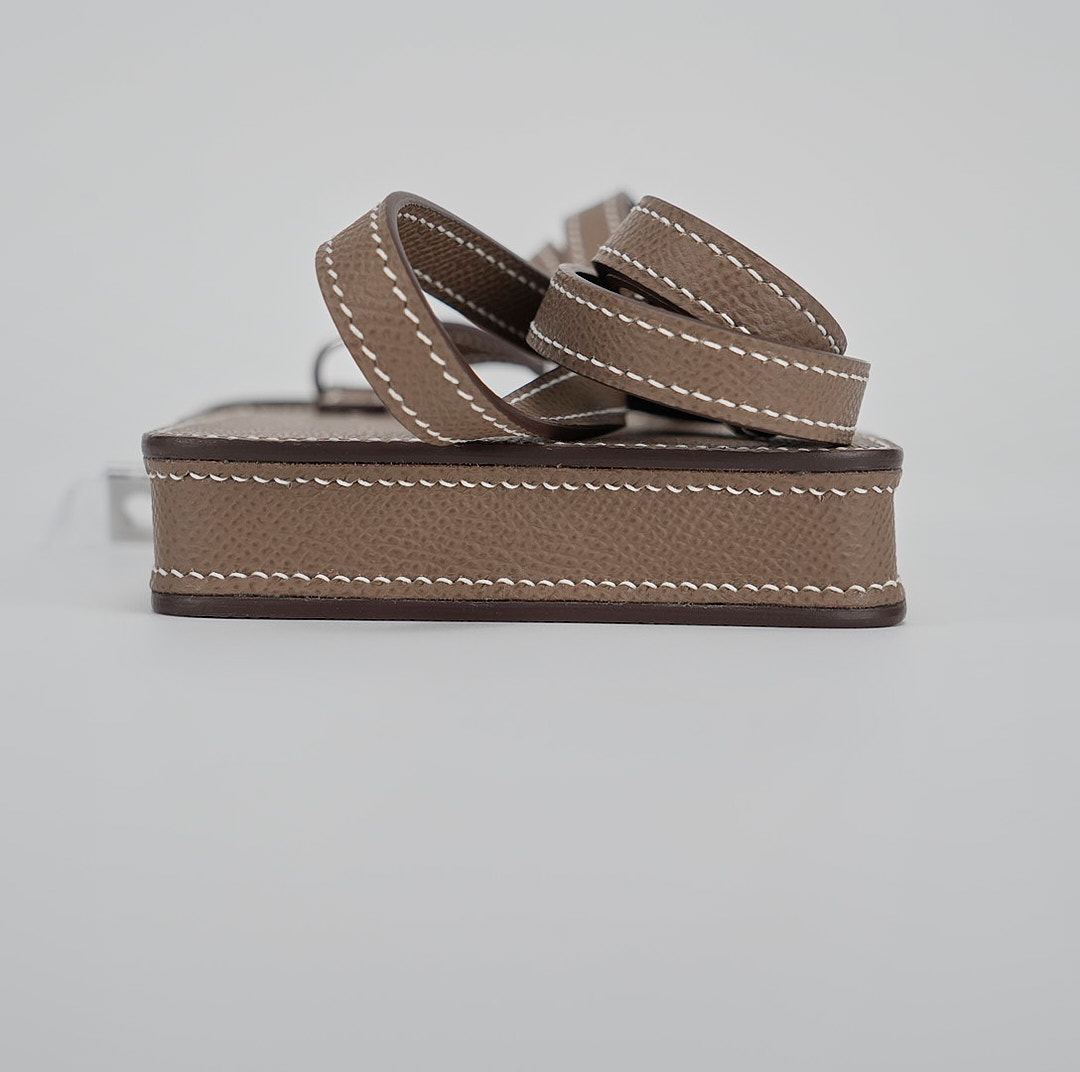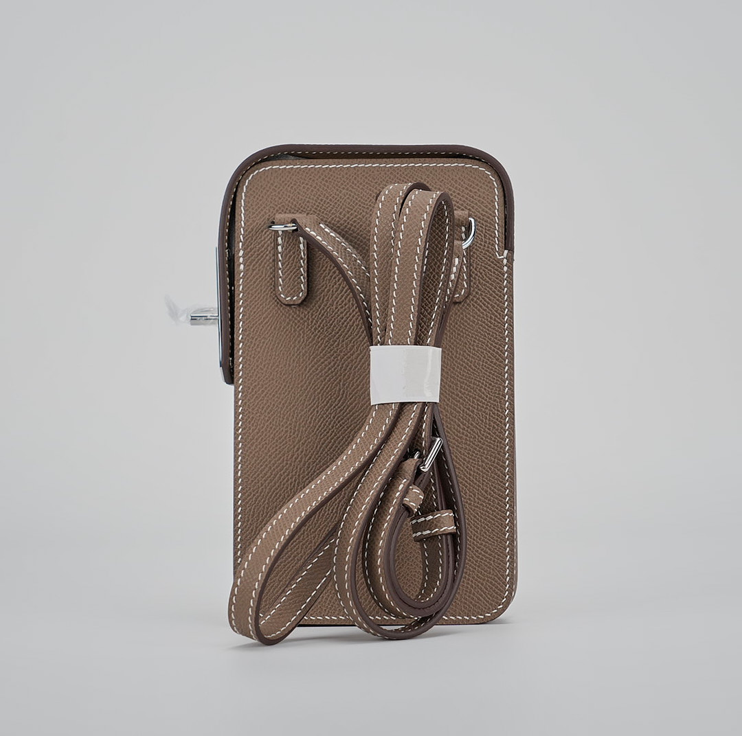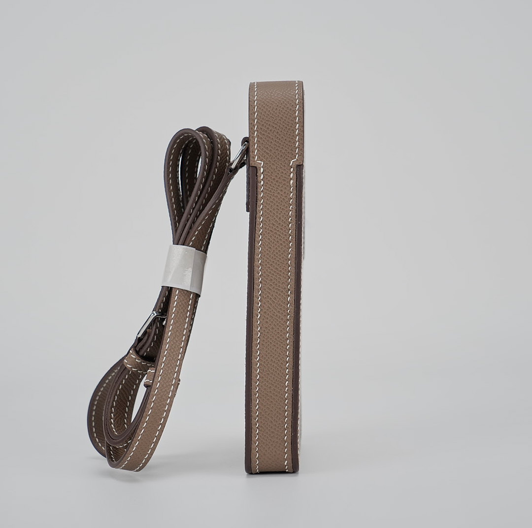 This hard leather phone case draws inspiration from the Haut a courroies bag with the front belt-closure. Straps and a turn clasp are revisited in a side closure format, designed to secure your essentials: your phone and a credit card. The pouch juxtaposes the expertise of leather work with metal details. An accessory that keeps with the spirit of the times, it allows for hands-free carry thanks to its adjustable shoulder strap.