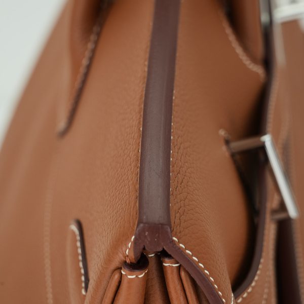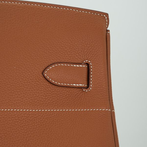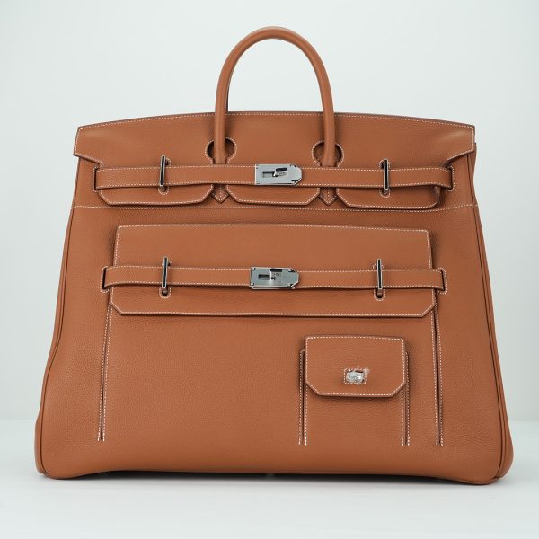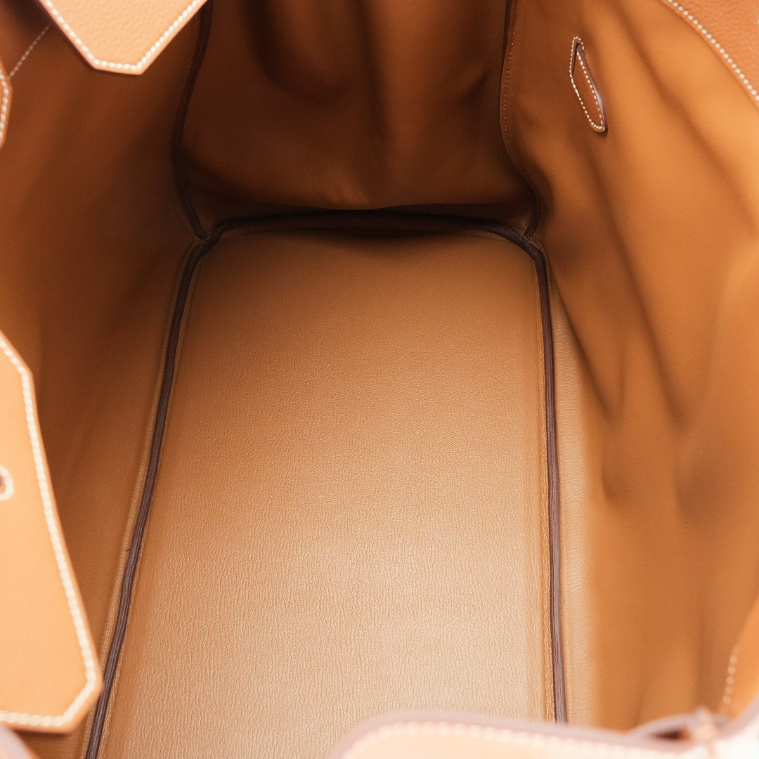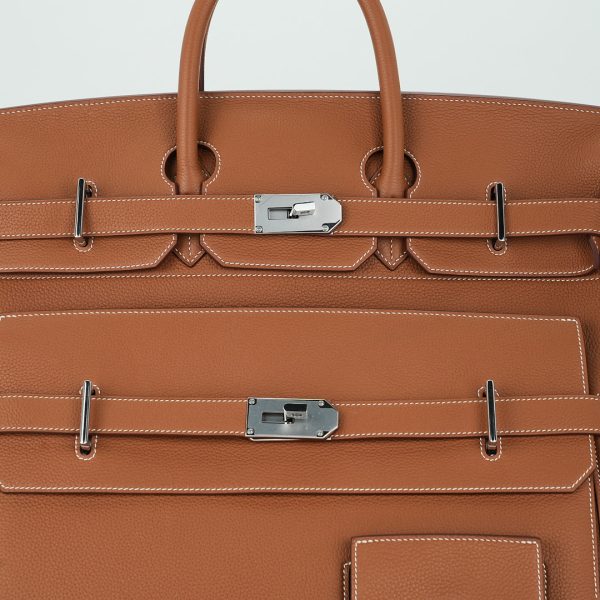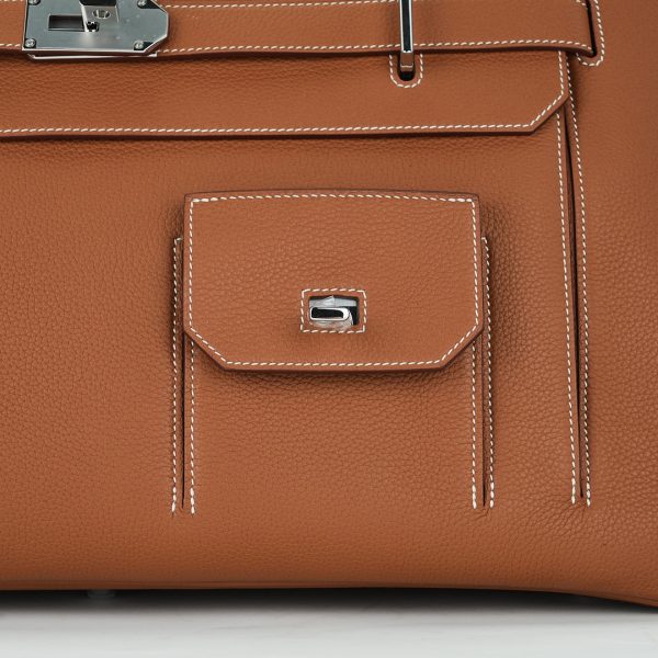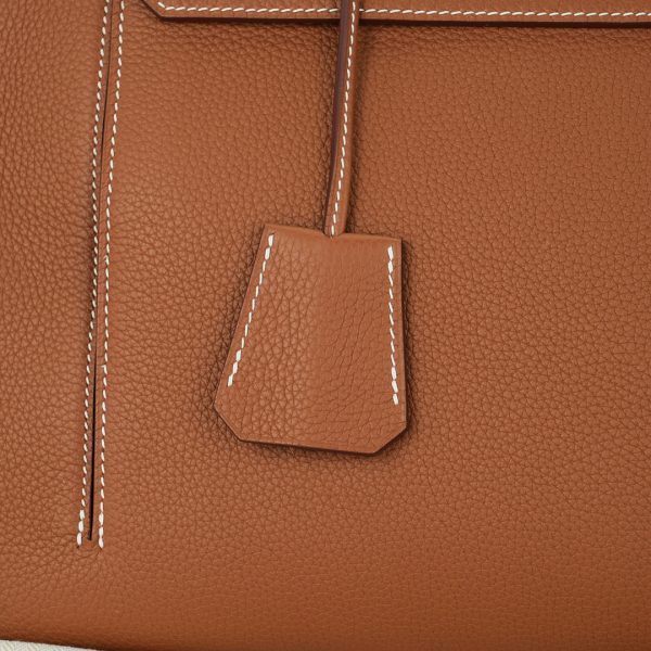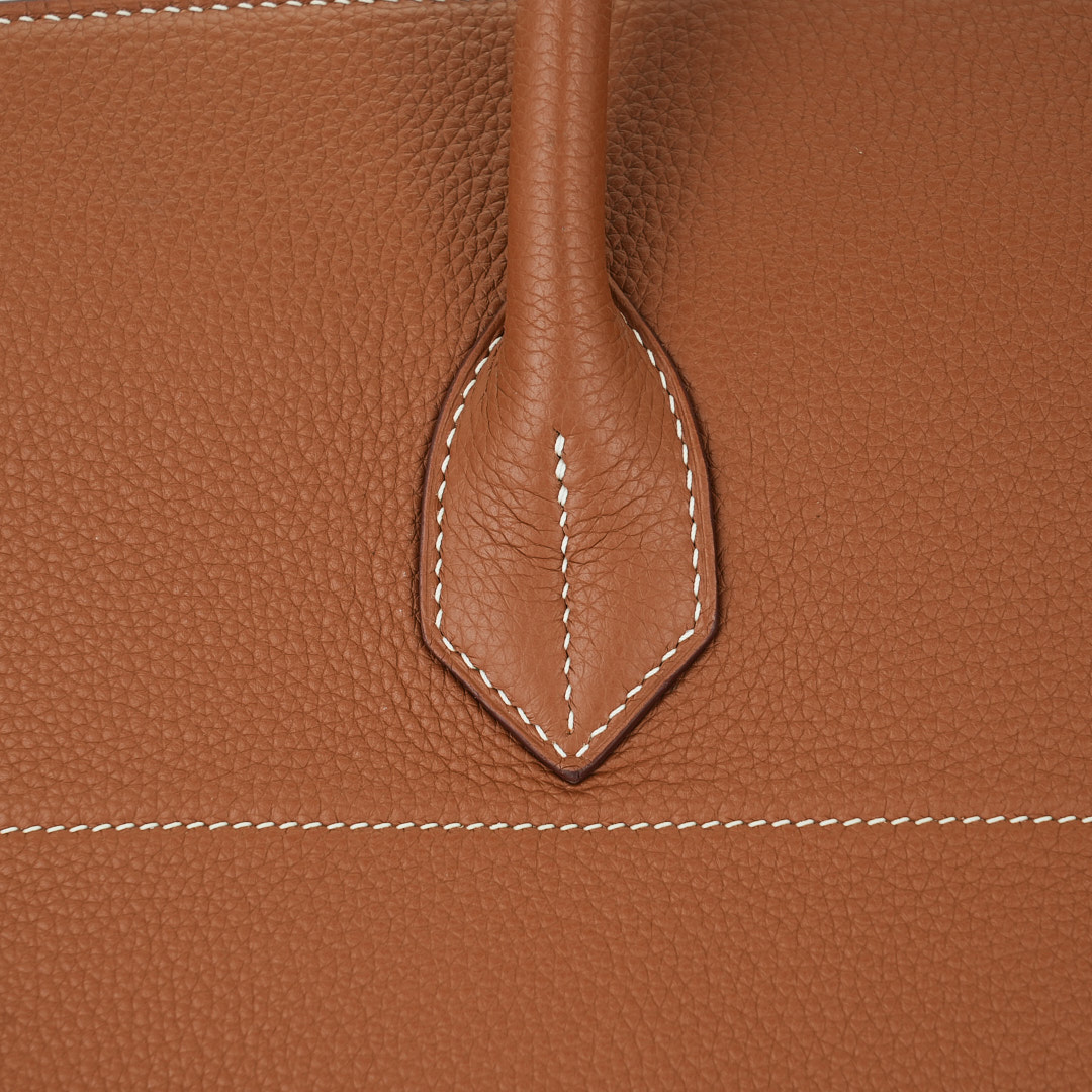 Embrace timeless elegance with this Gold Togo Multi-Pockets 50. This spacious bag pays homage to equestrian heritage while meeting modern lifestyle needs.