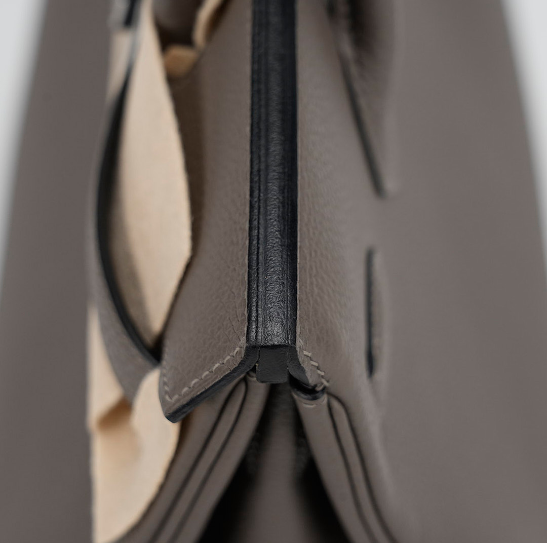 A BK 30 expertly sewn together by hand using Togo leather in Gris Étain. It’s detailed with palladium hardware and fitted with a zipped compartment inside to keep your most-used cards close at hand.