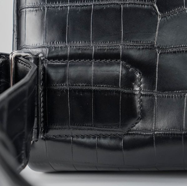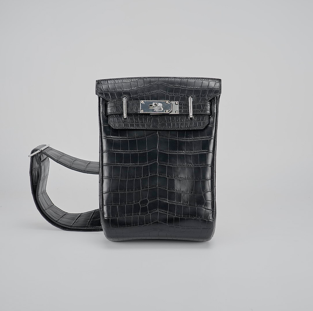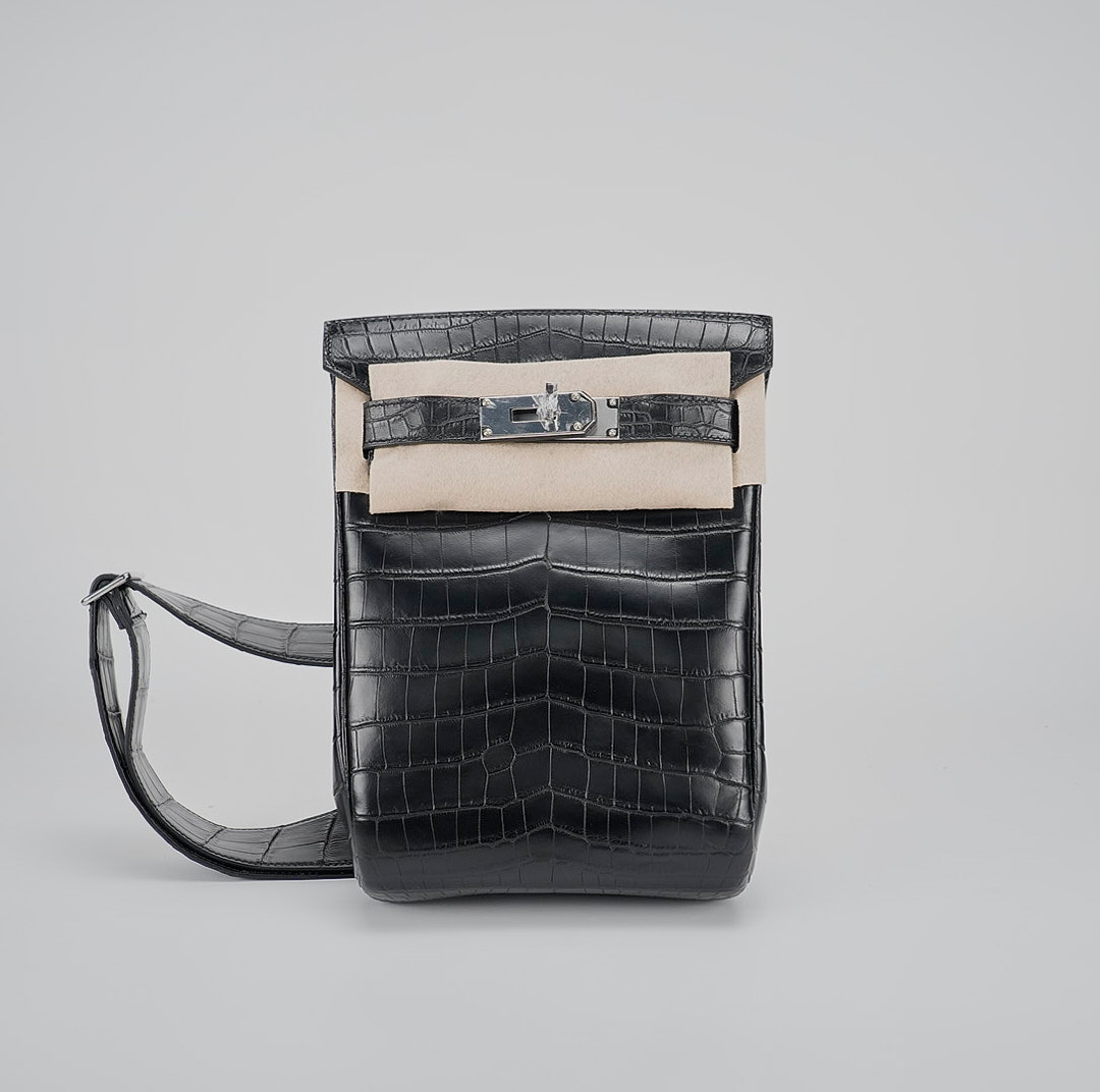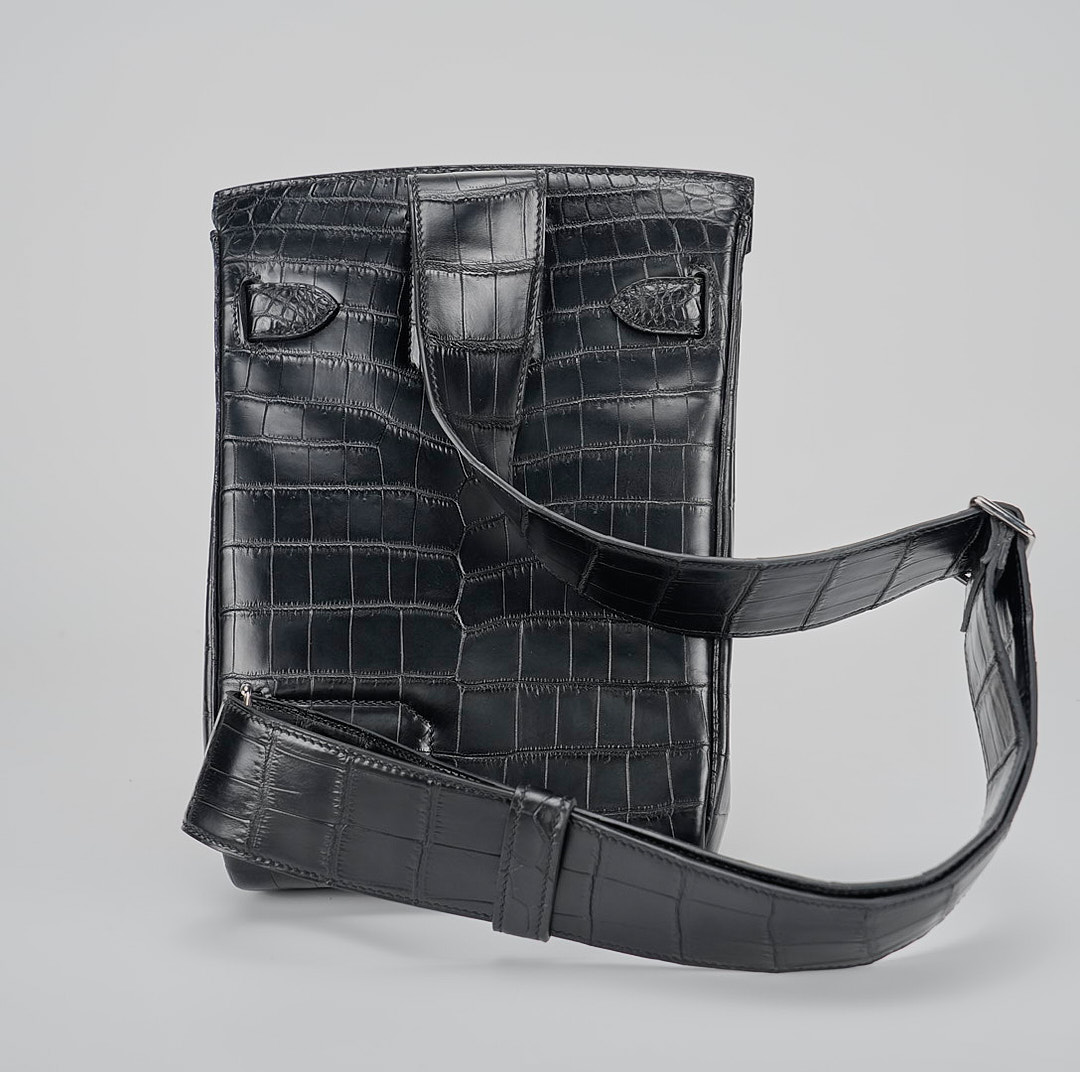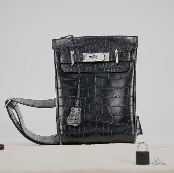 This is a Black Matte Niluoticus Hac A Dos Backpack. This stylish backpack is crafted of Niluoticus leather with a cross-over flap, polished palladium hardware including a turn lock, strap anchors, and long adjustable canvas shoulder straps. The flap opens to a compact leather interior with a patch pocket.
