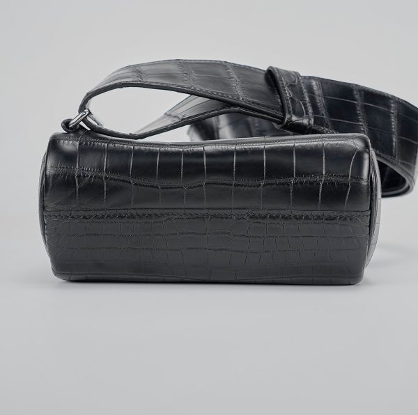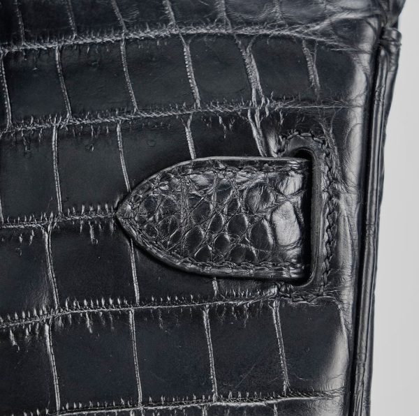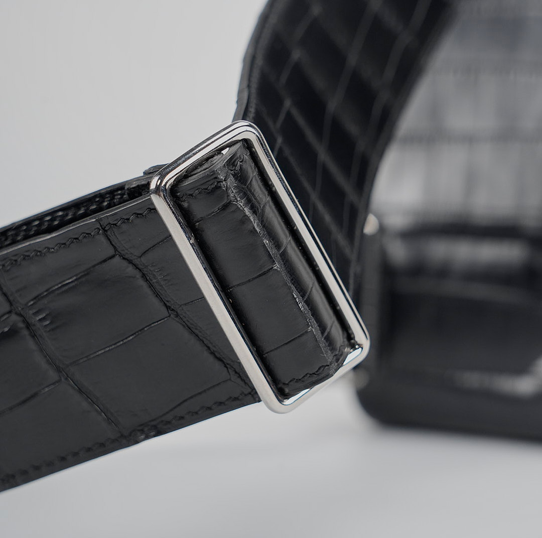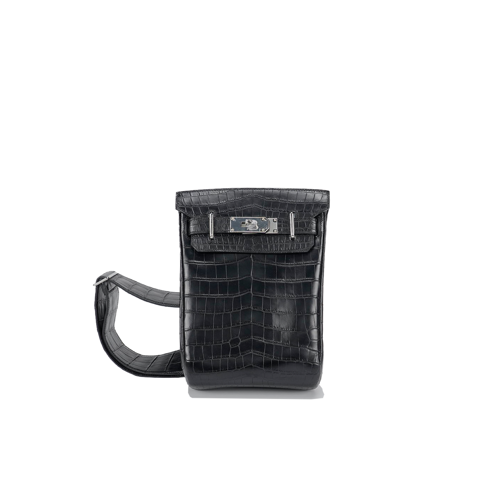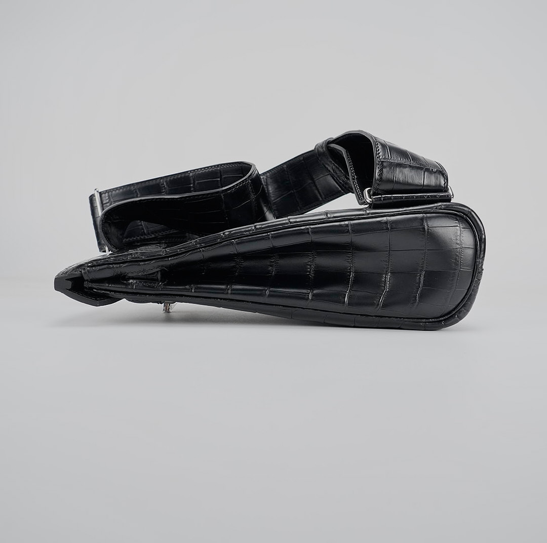 This is a Black Matte Niluoticus Hac A Dos Backpack. This stylish backpack is crafted of Niluoticus leather with a cross-over flap, polished palladium hardware including a turn lock, strap anchors, and long adjustable canvas shoulder straps. The flap opens to a compact leather interior with a patch pocket.
