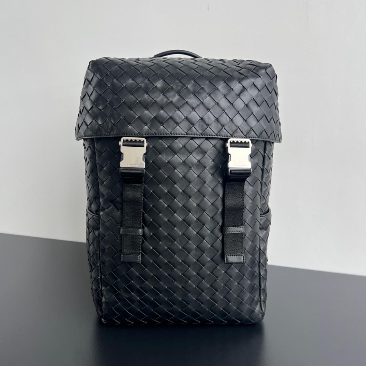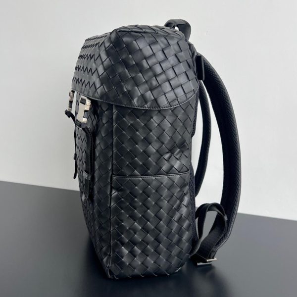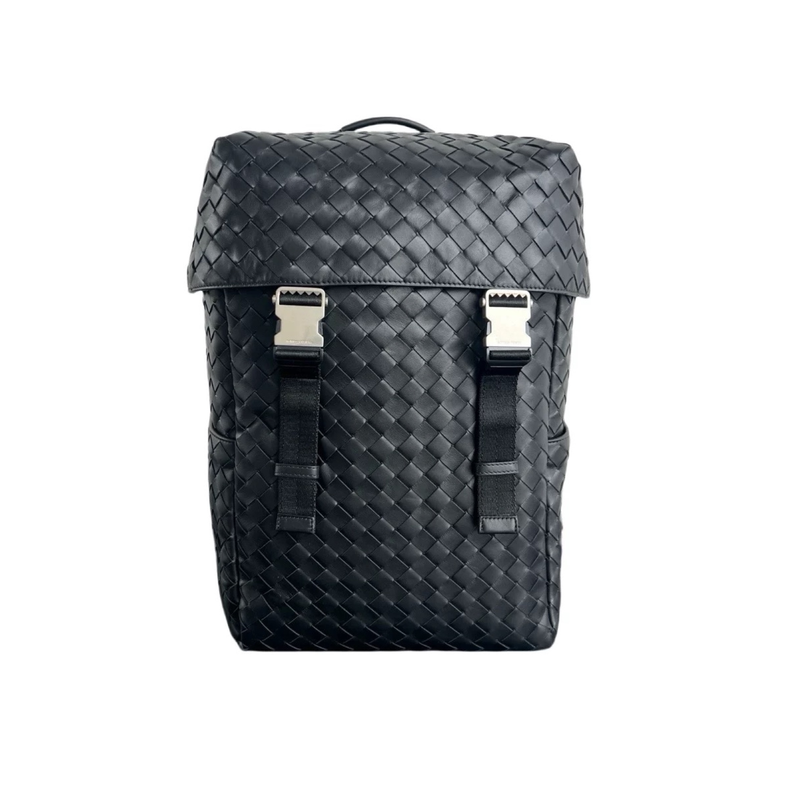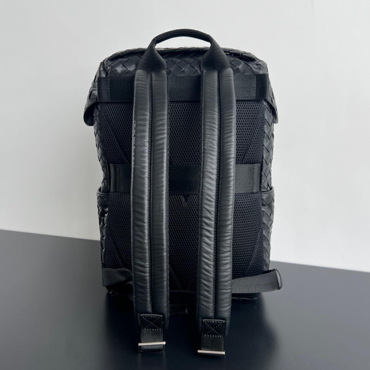 Intrecciato leather flap backpack with adjustable padded straps and back belt to attach to trolley