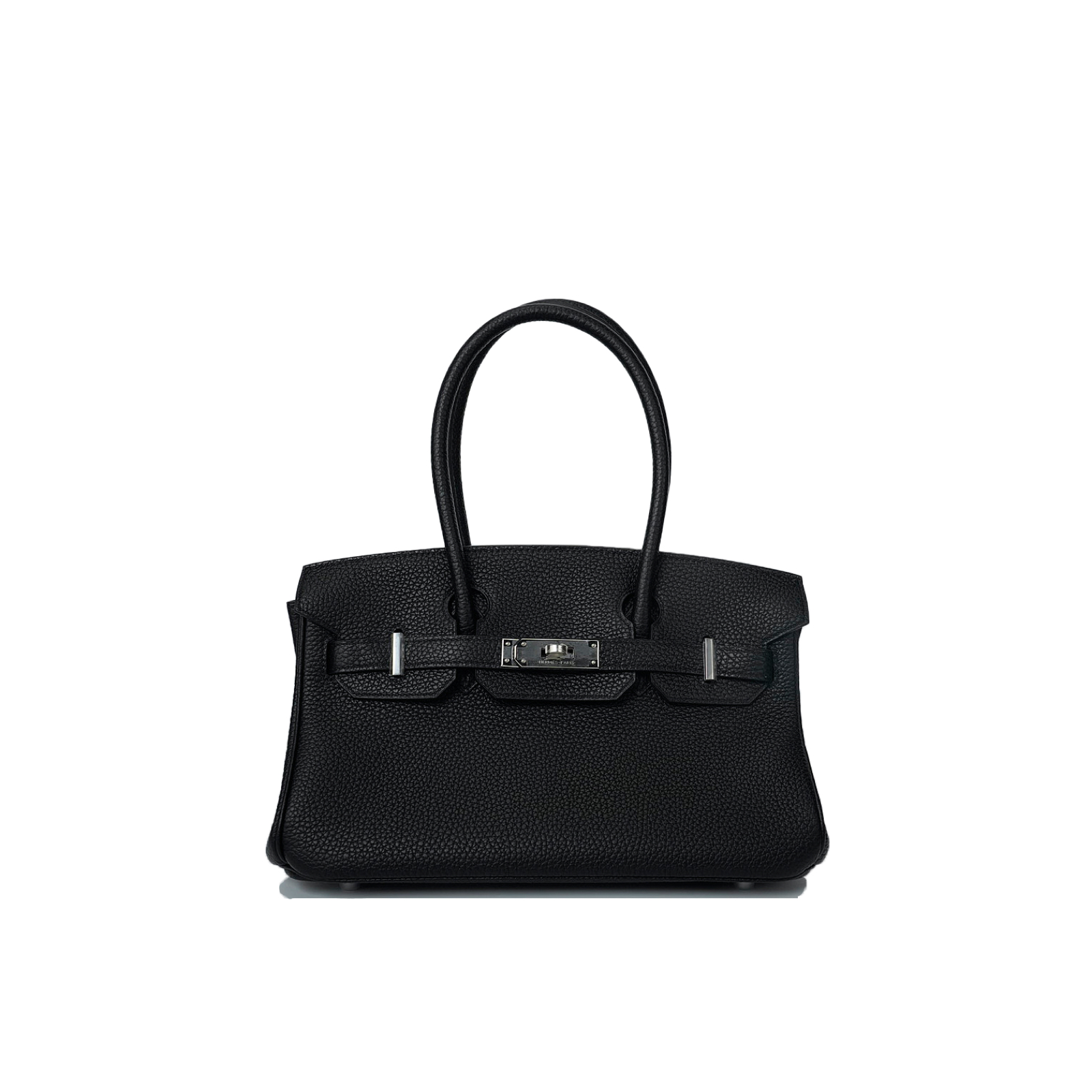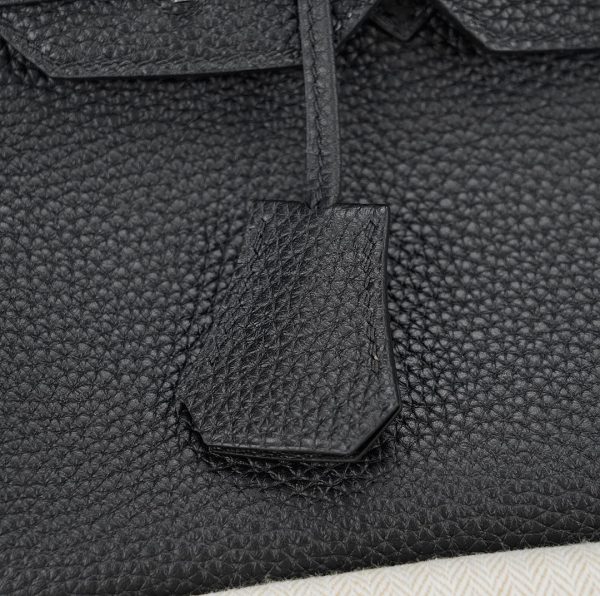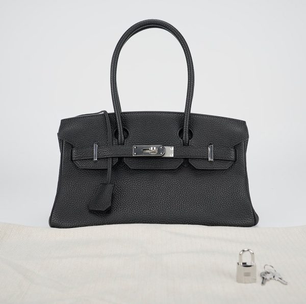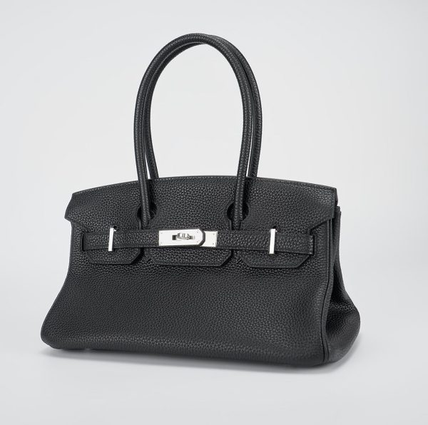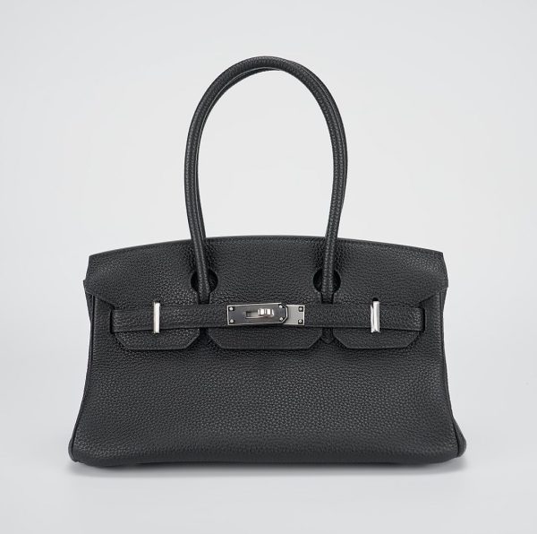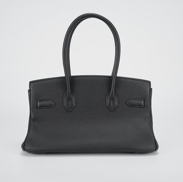 JPG Shoulder BK 29 in black. This stylish tote is crafted of taurillon clemence leather and features long rolled leather top handles for carrying at the shoulder, a front leather flap and palladium plated hardware including a squared plated silver turn lock. The flap opens to a matching leather interior with zipper and patch pockets.