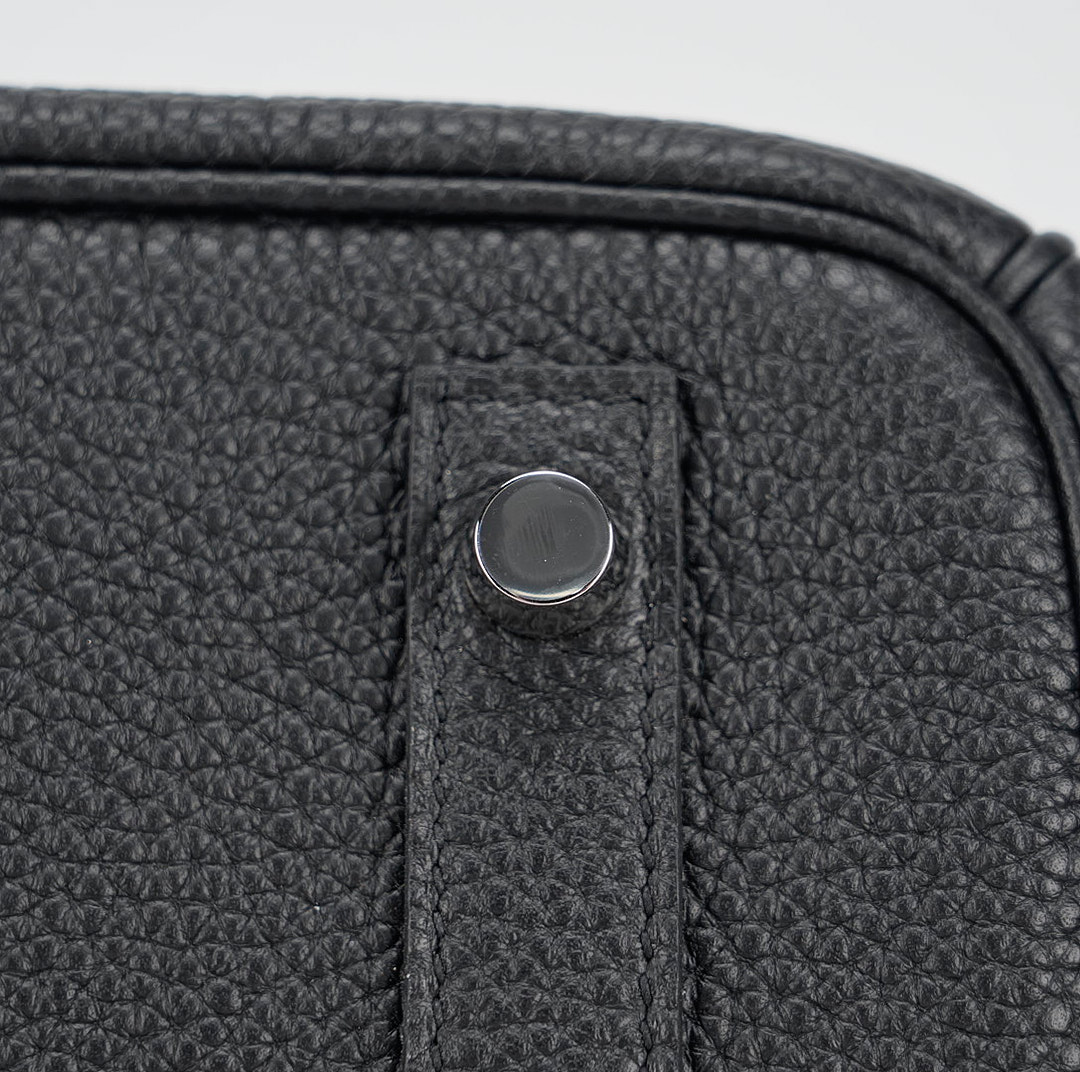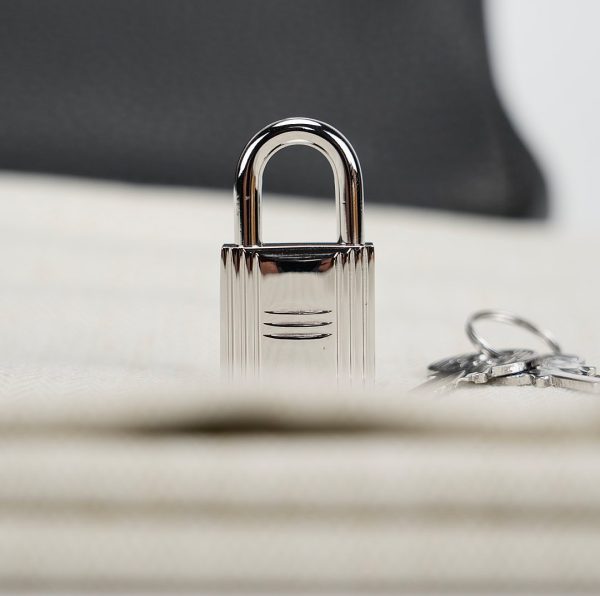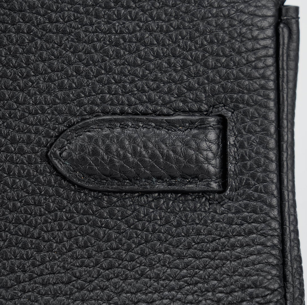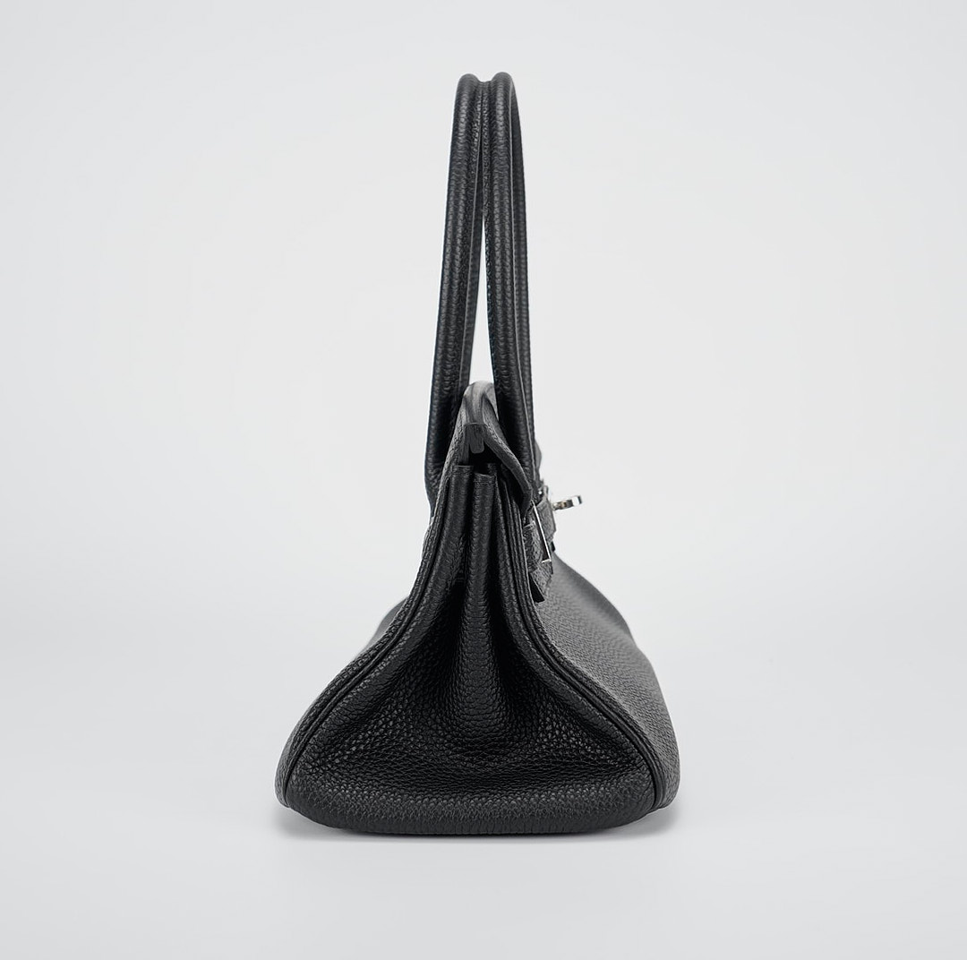 JPG Shoulder BK 29 in black. This stylish tote is crafted of taurillon clemence leather and features long rolled leather top handles for carrying at the shoulder, a front leather flap and palladium plated hardware including a squared plated silver turn lock. The flap opens to a matching leather interior with zipper and patch pockets.