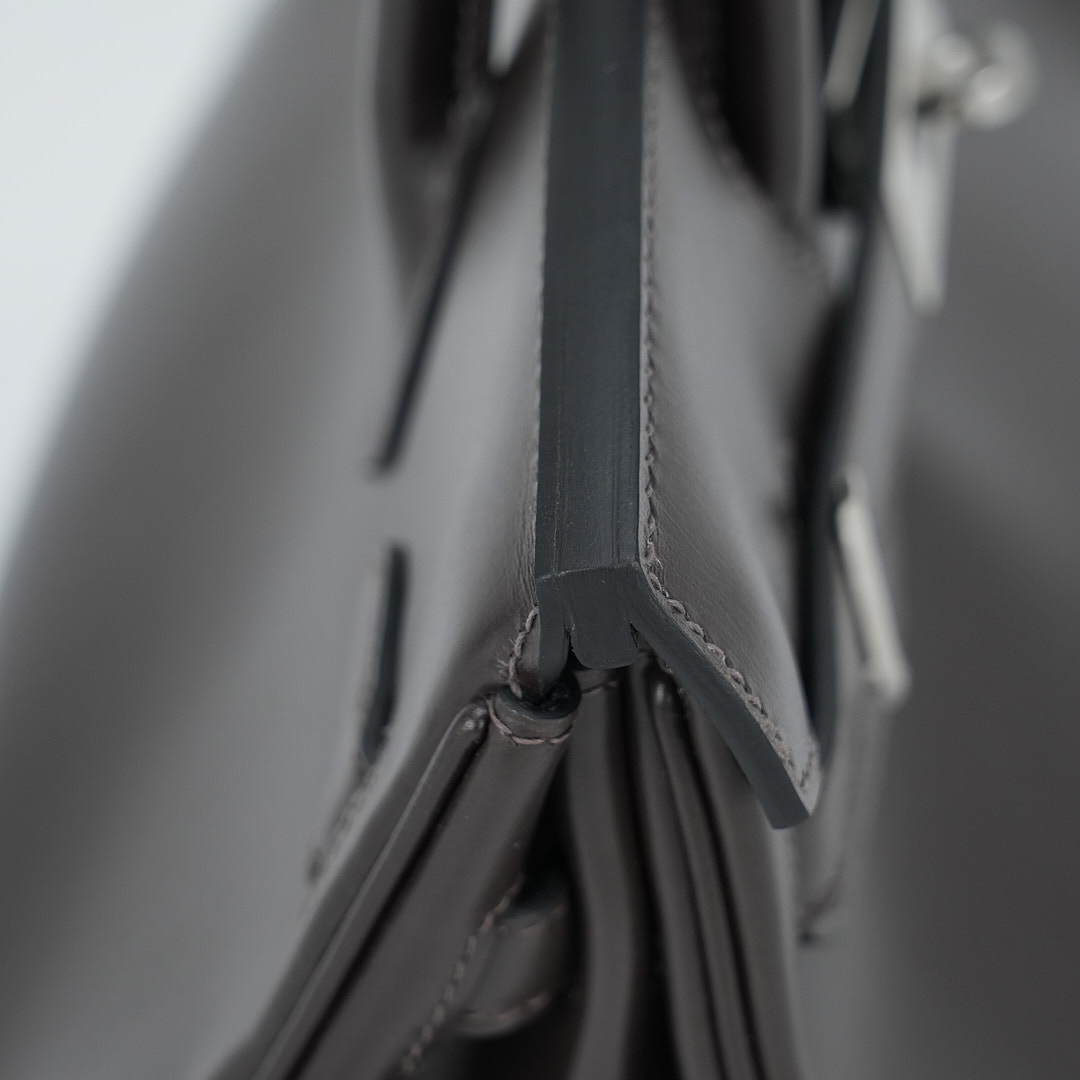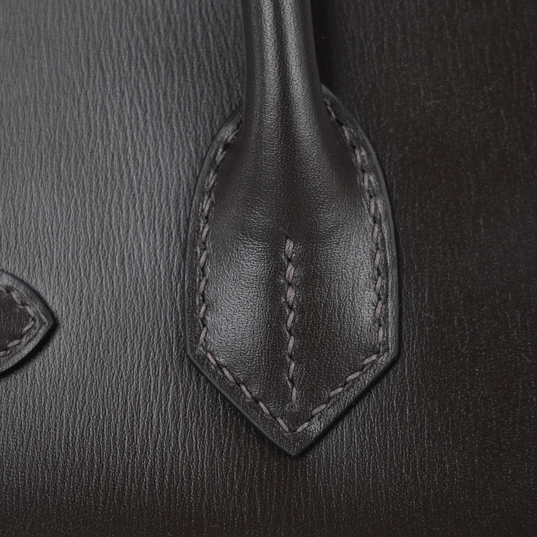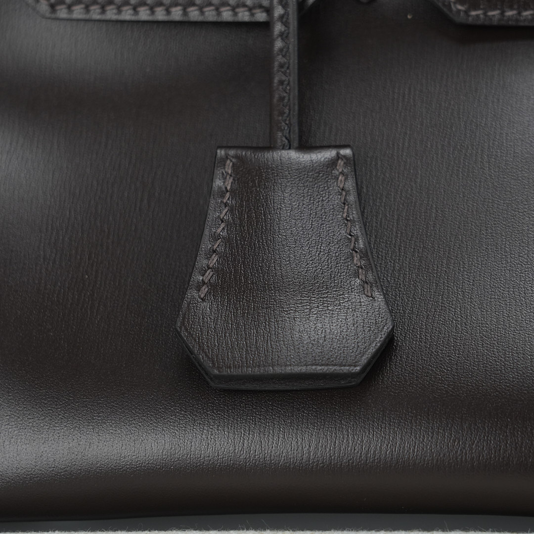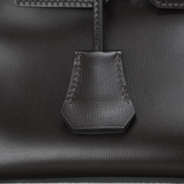 JPG Shoulder BK 29 in Ebene. This stylish tote is crafted of Box leather and features long rolled leather top handles for carrying at the shoulder, a front leather flap and brushed palladium plated hardware including a squared plated silver turn lock. The flap opens to a matching leather interior with zipper and patch pockets.