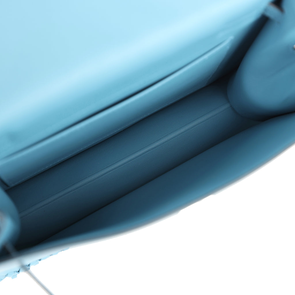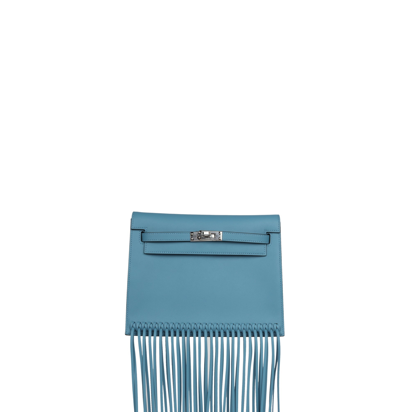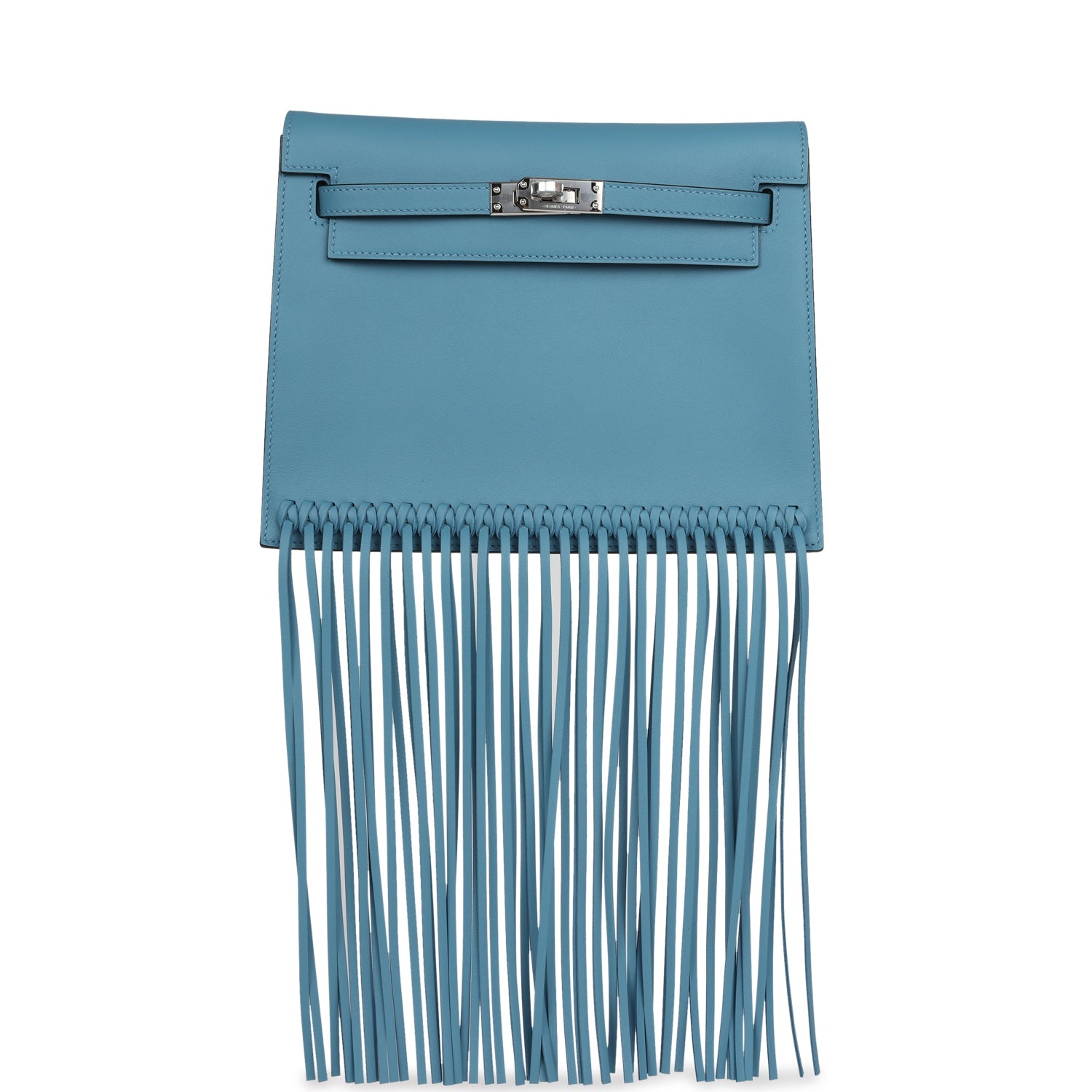 This limited edition KL Danse Anate is in Blue Jean swift leather with palladium hardware and has tonal stitching, long fringe detailing, two straps with front flap closure and an adjustable flat crossbody/backpack/belt strap.