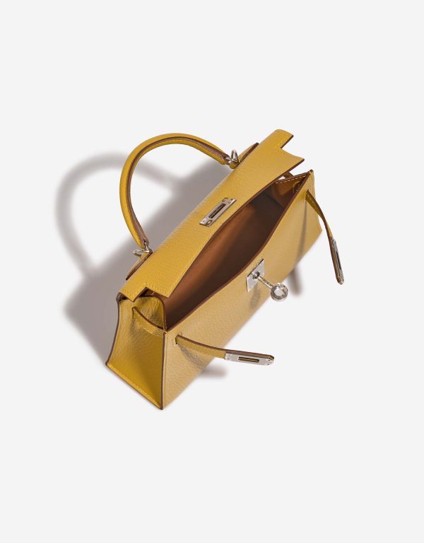 The KY Verso was first introduced in 2016, with color contrasting interiors. The KY Verso Mini features the colors Jaune Ambre on the exterior and Gold on the inside. Handcrafted from Chevre Mysore leather, it is detailed with palladium hardware.