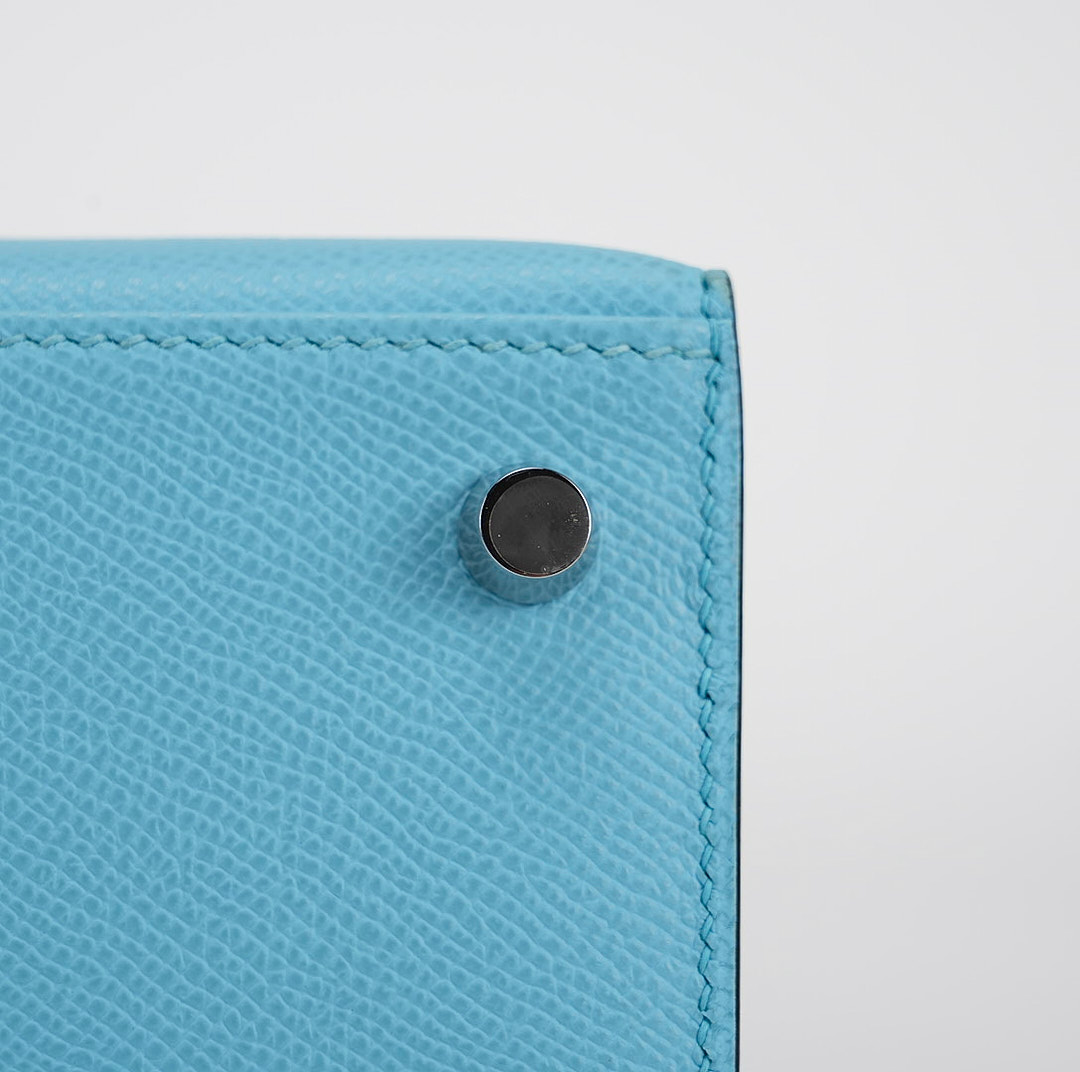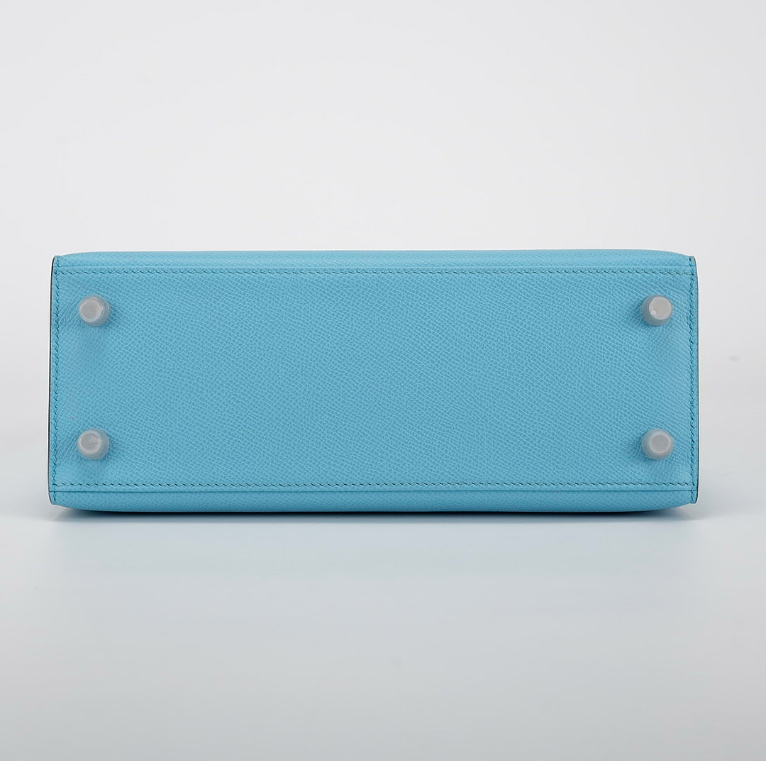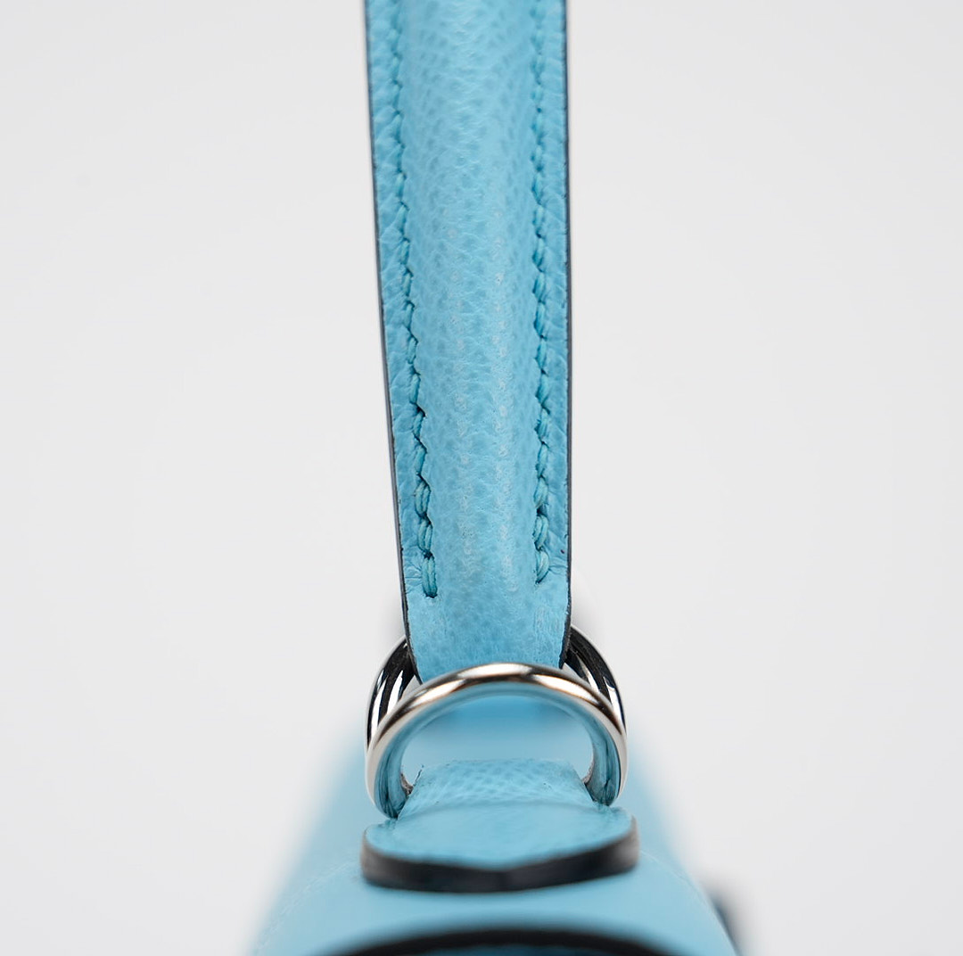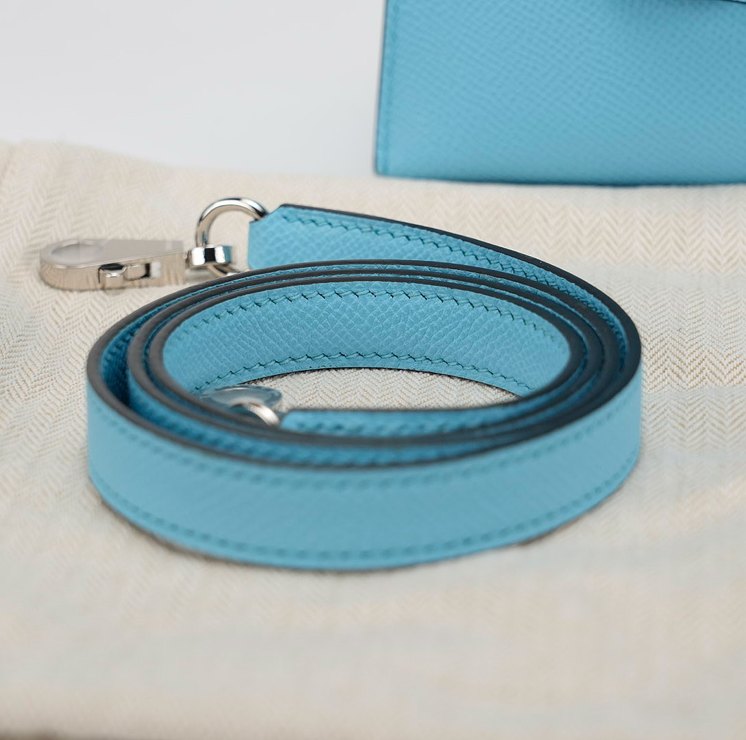 Add a touch of color to your everyday outfit with this KY 25. Handcrafted with Epsom leather in a crisp blue csamleste, this bag features shiny palladium hardware. Carry your daily necessities – phone, charger, lip gloss and booth – with this little KY