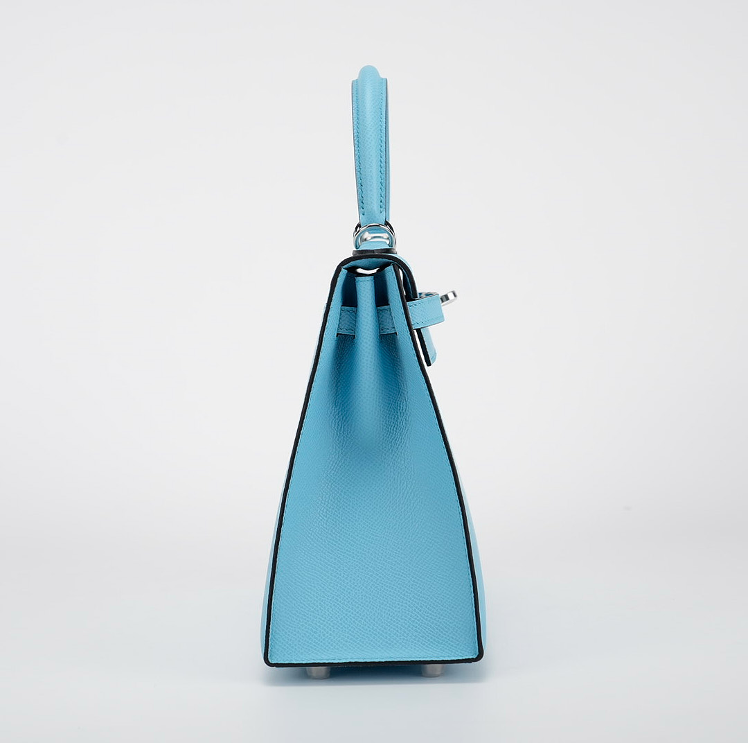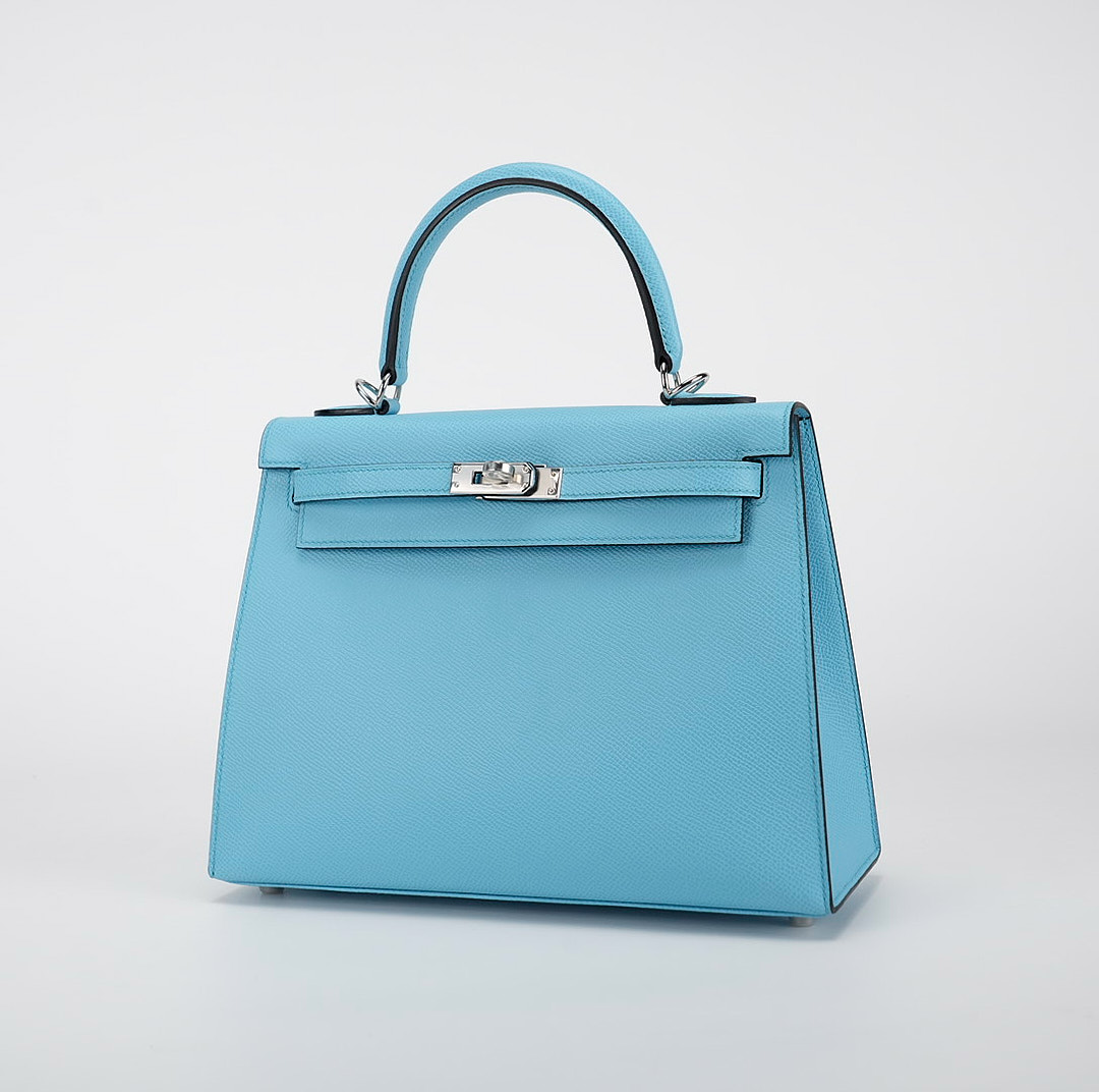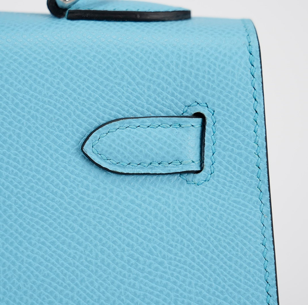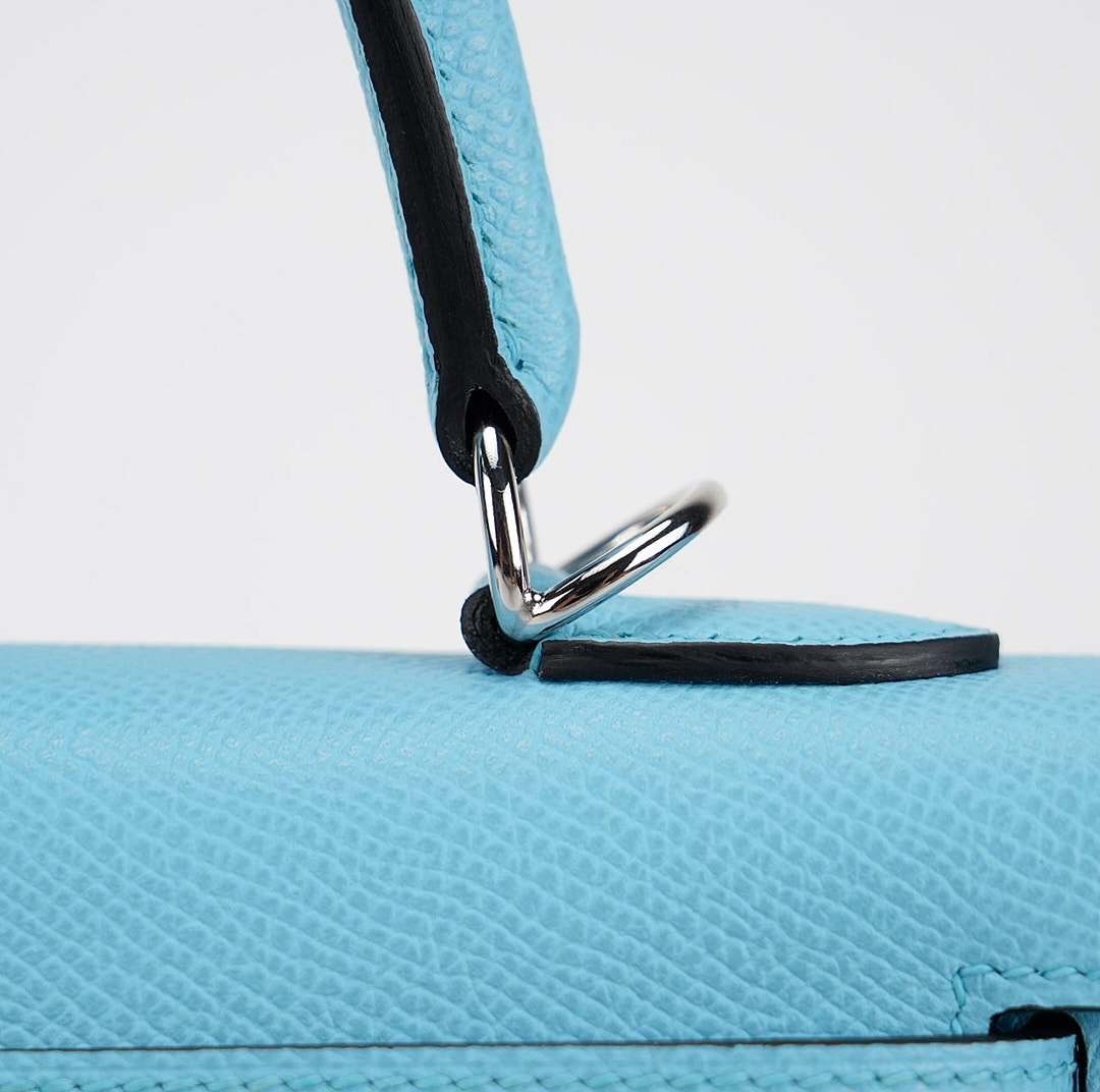Add a touch of color to your everyday outfit with this KY 25. Handcrafted with Epsom leather in a crisp blue csamleste, this bag features shiny palladium hardware. Carry your daily necessities – phone, charger, lip gloss and booth – with this little KY