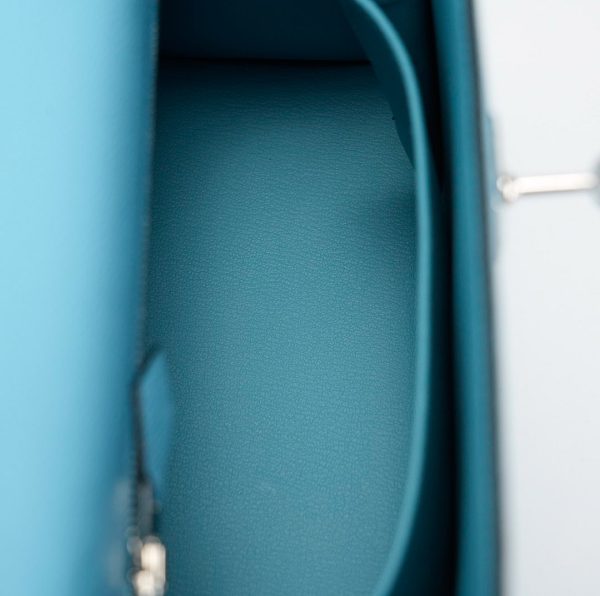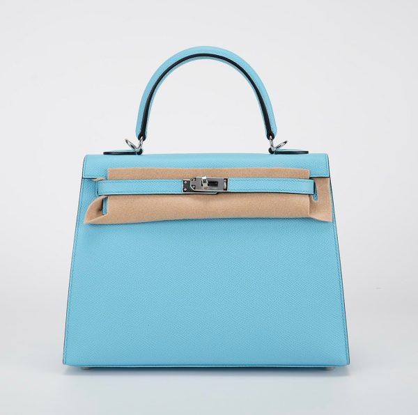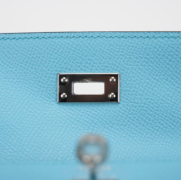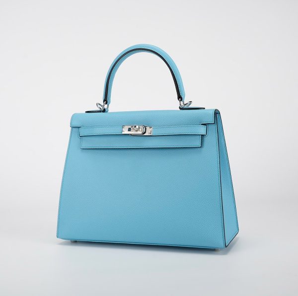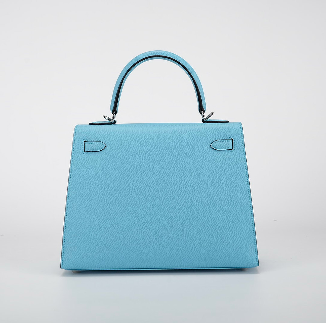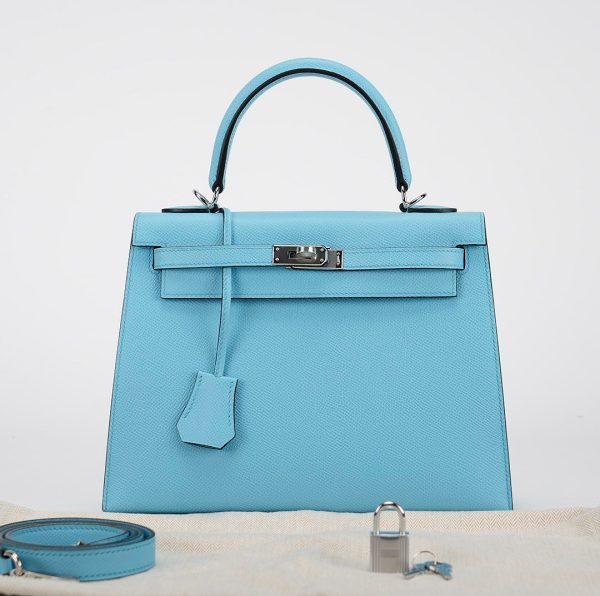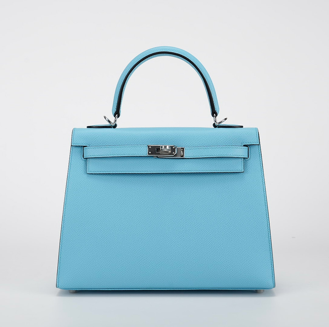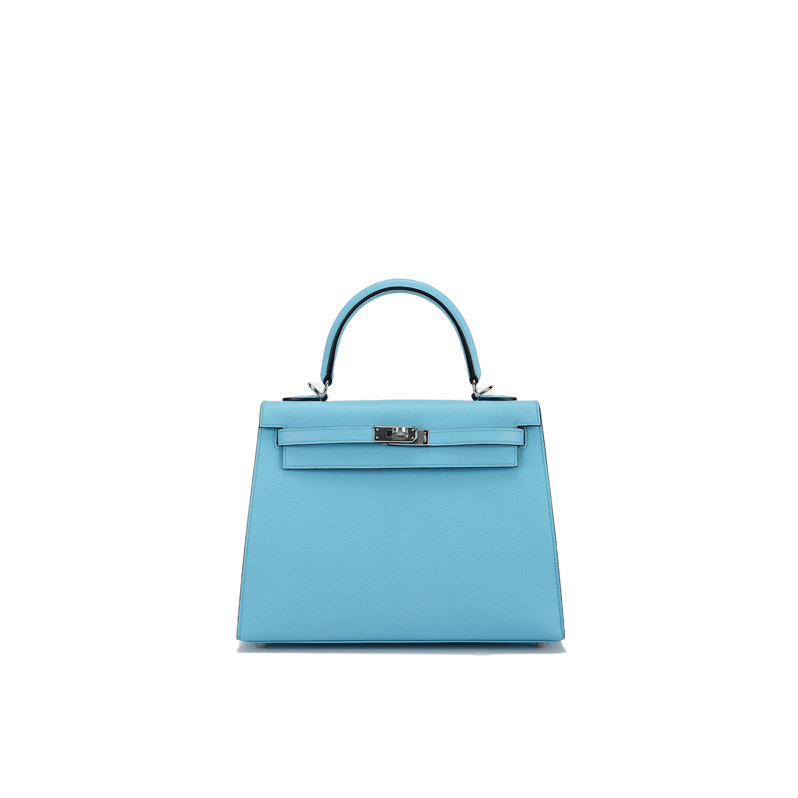 Add a touch of color to your everyday outfit with this KY 25. Handcrafted with Epsom leather in a crisp blue csamleste, this bag features shiny palladium hardware. Carry your daily necessities – phone, charger, lip gloss and booth – with this little KY