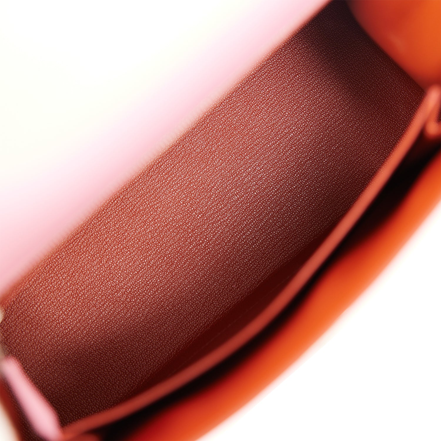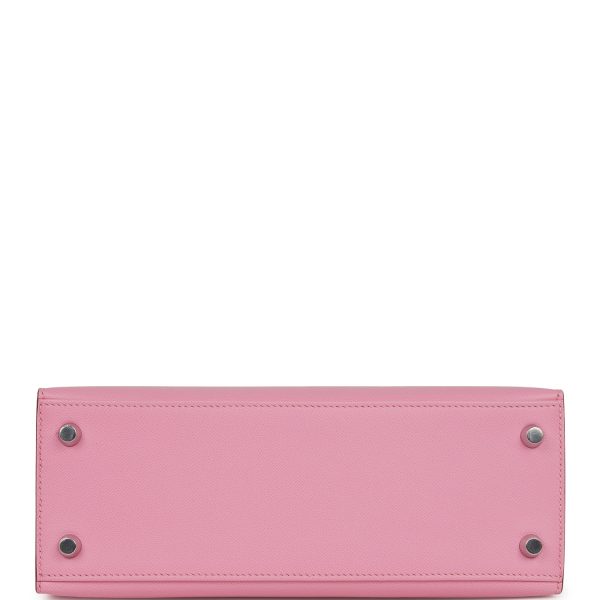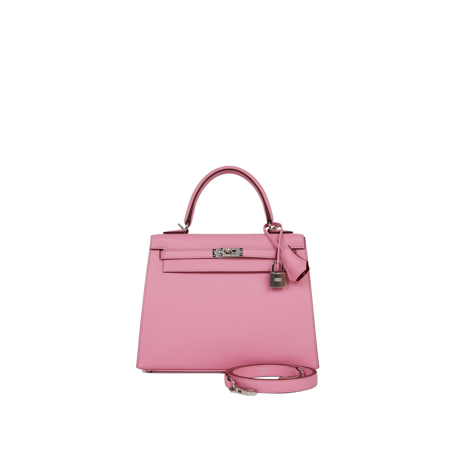 This KY, in the Sellier style, is in Pink 5P Epsom leather with palladium hardware and has tonal stitching, two front straps with toggle closure, clochette with lock and two keys, single rolled handle and removable shoulder strap.