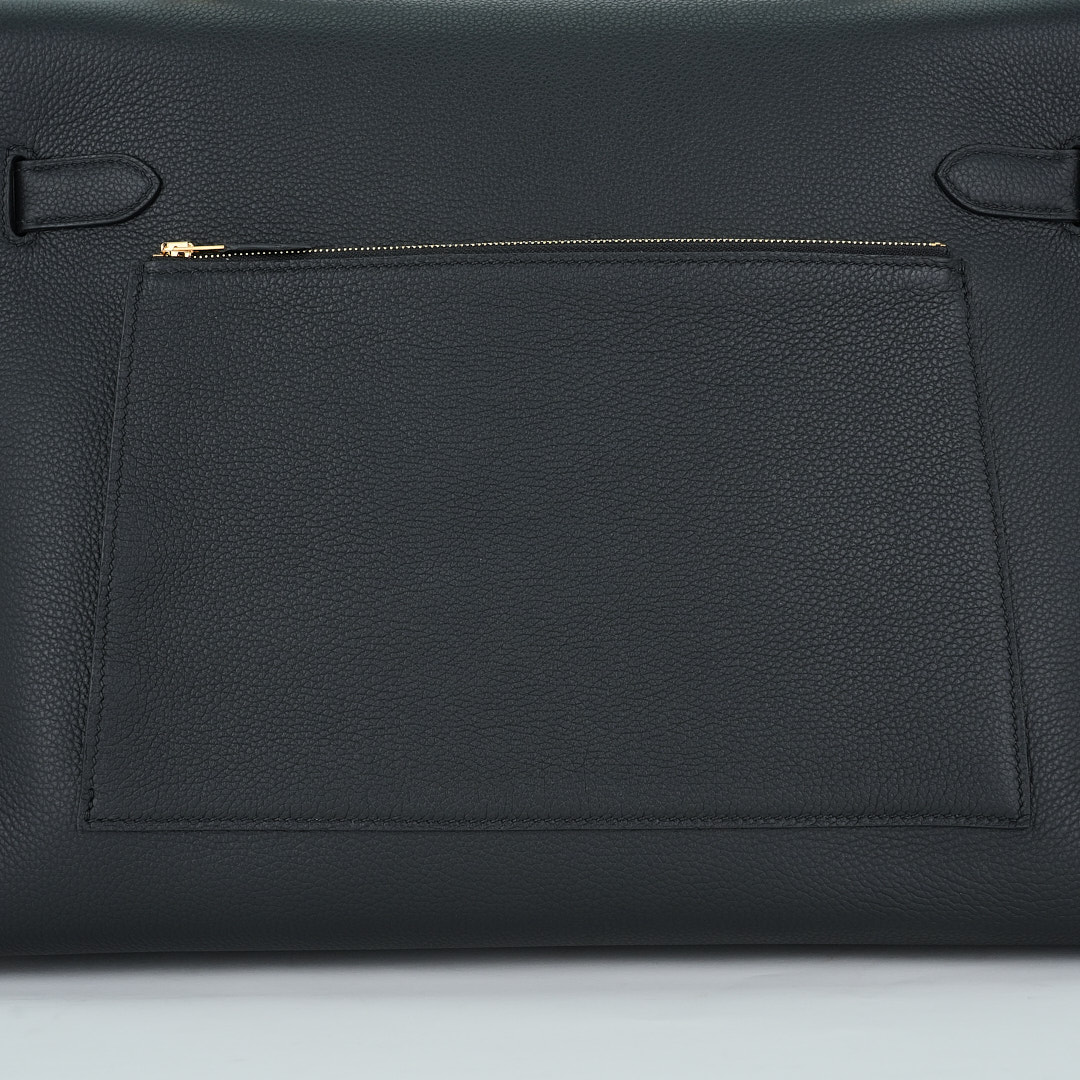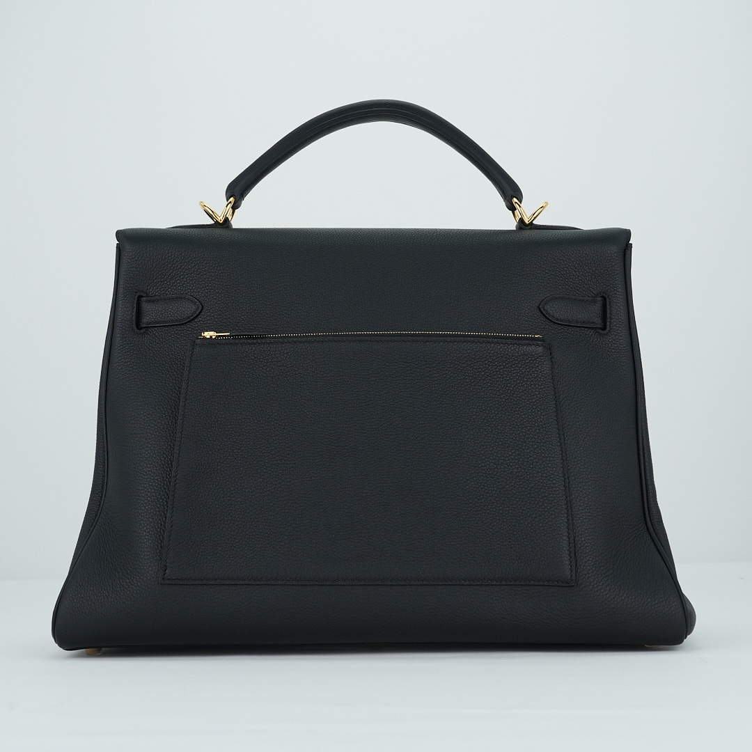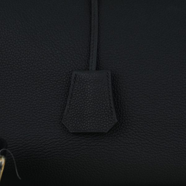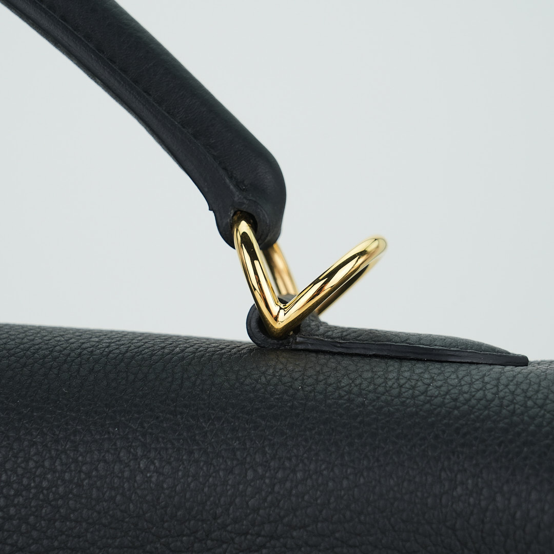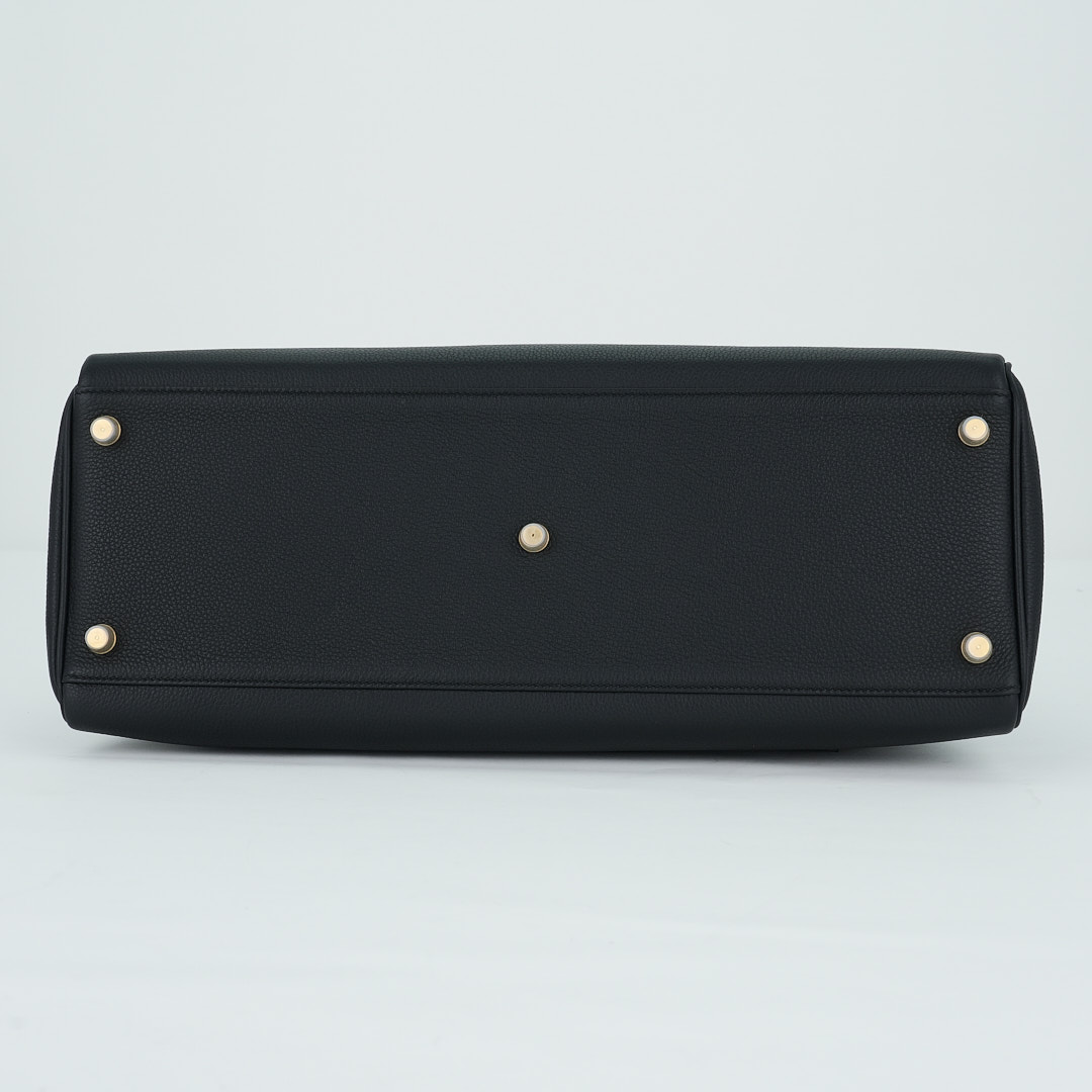 This KY 42 Maxi, in the Retourne style, is of Black Togo leather with palladium hardware and features same tonal stitching, front flap, front toggle closure, clochette with lock and two keys, a single rolled handle and a detachable canvas shoulder strap.